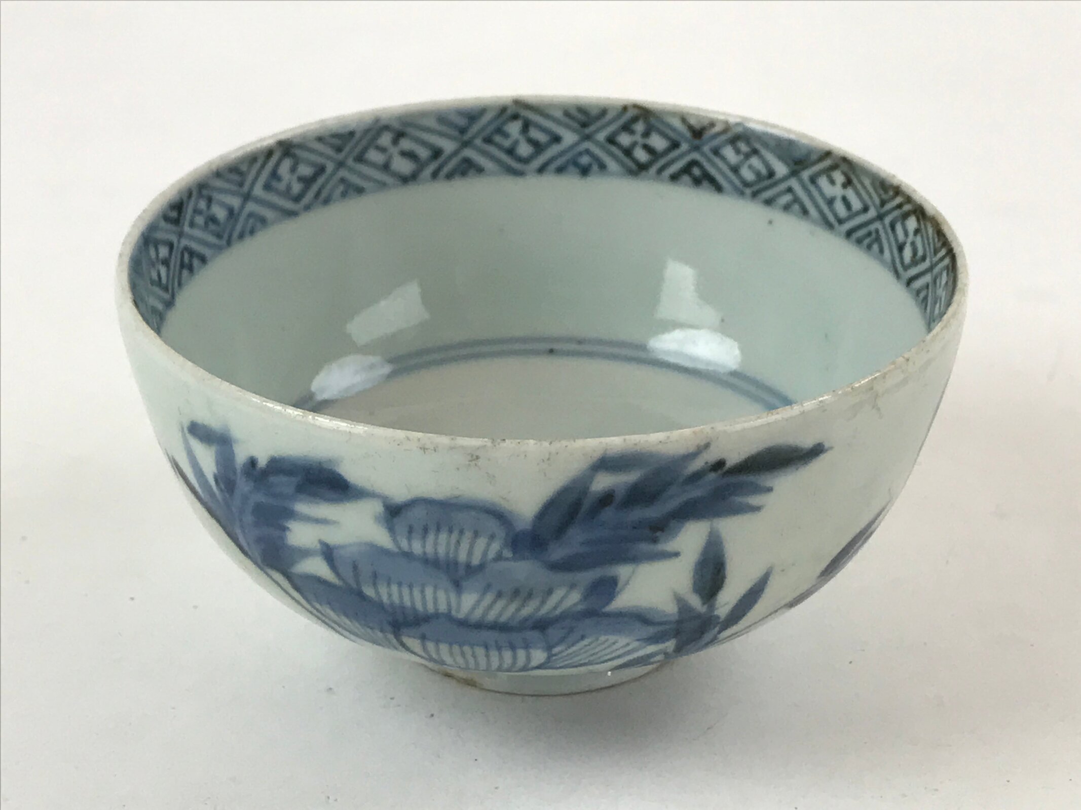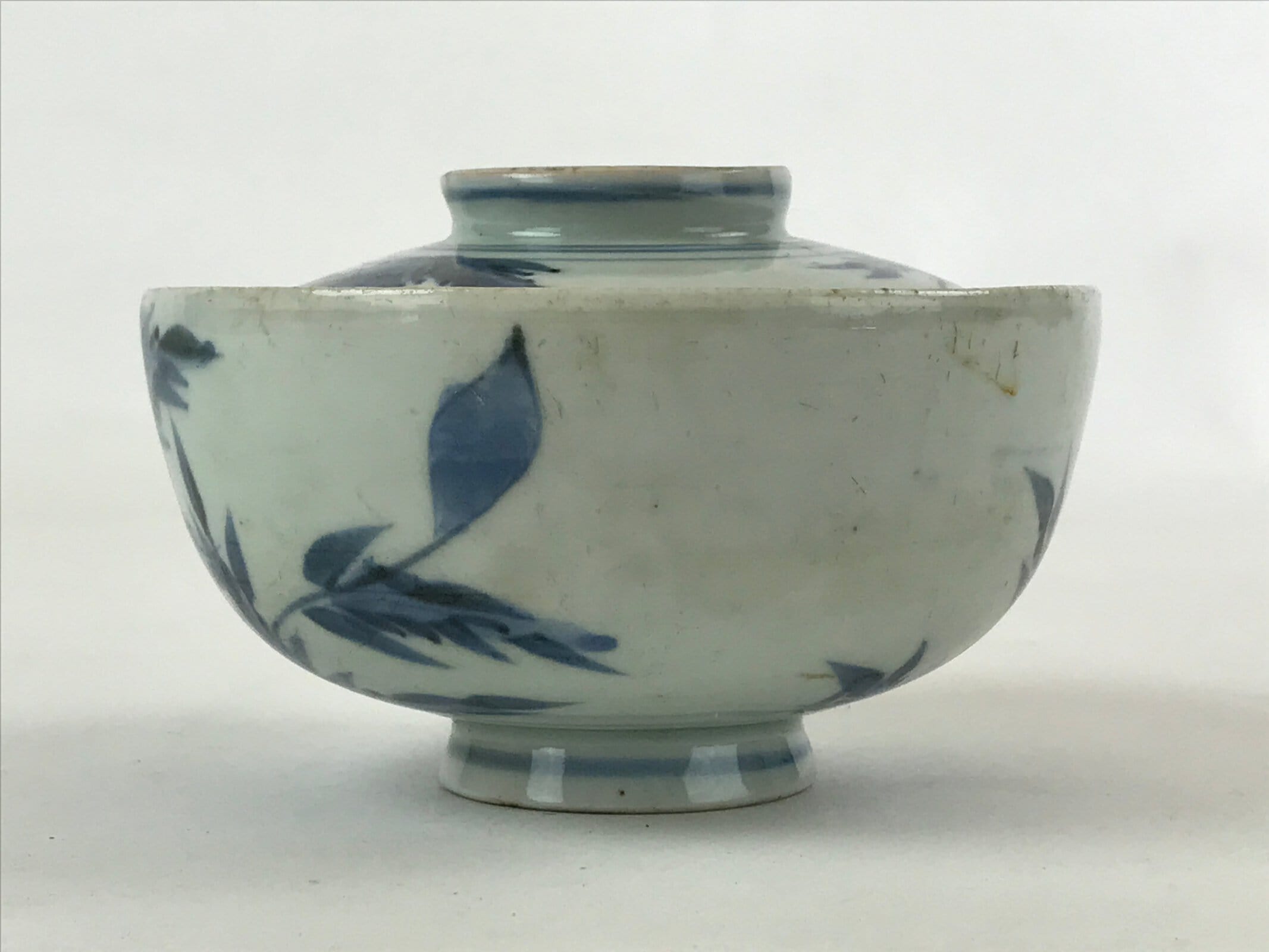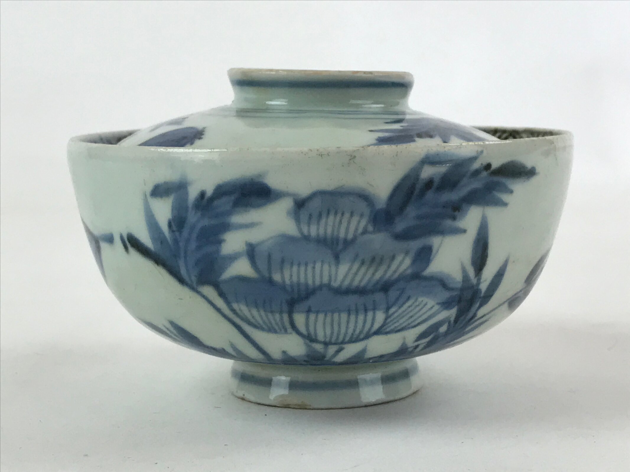 This is a Japanese vintage ceramic bowl with a lid. It has a medium to large size. The bowl and its lid are decorated with sometsuke-style dark blue floral patterns with leaves on the outside and a blue patterned border on the inside of both lid and bowl. This bowl has some weight, it is the ideal size to serve soup, rice, or other small food.
