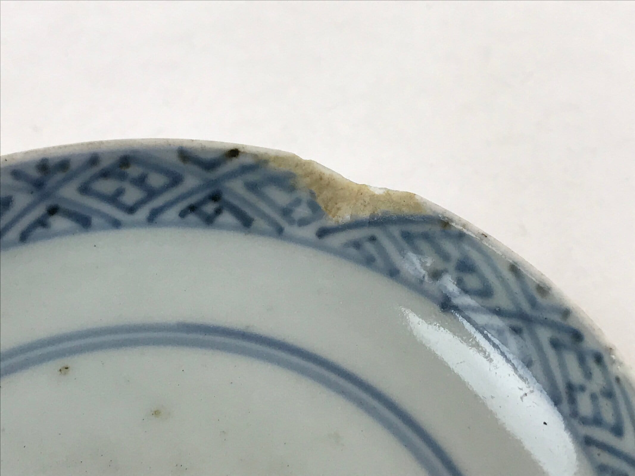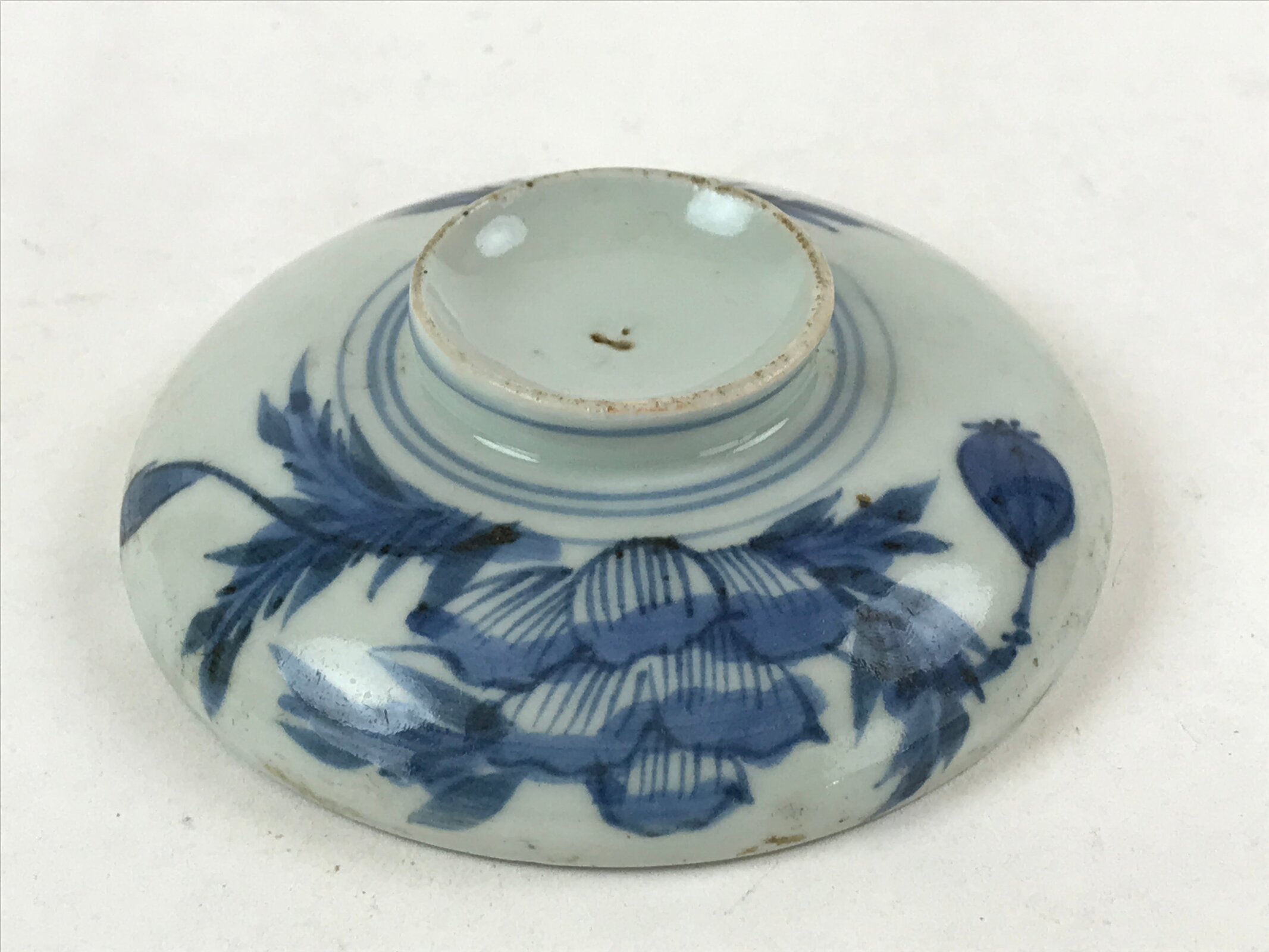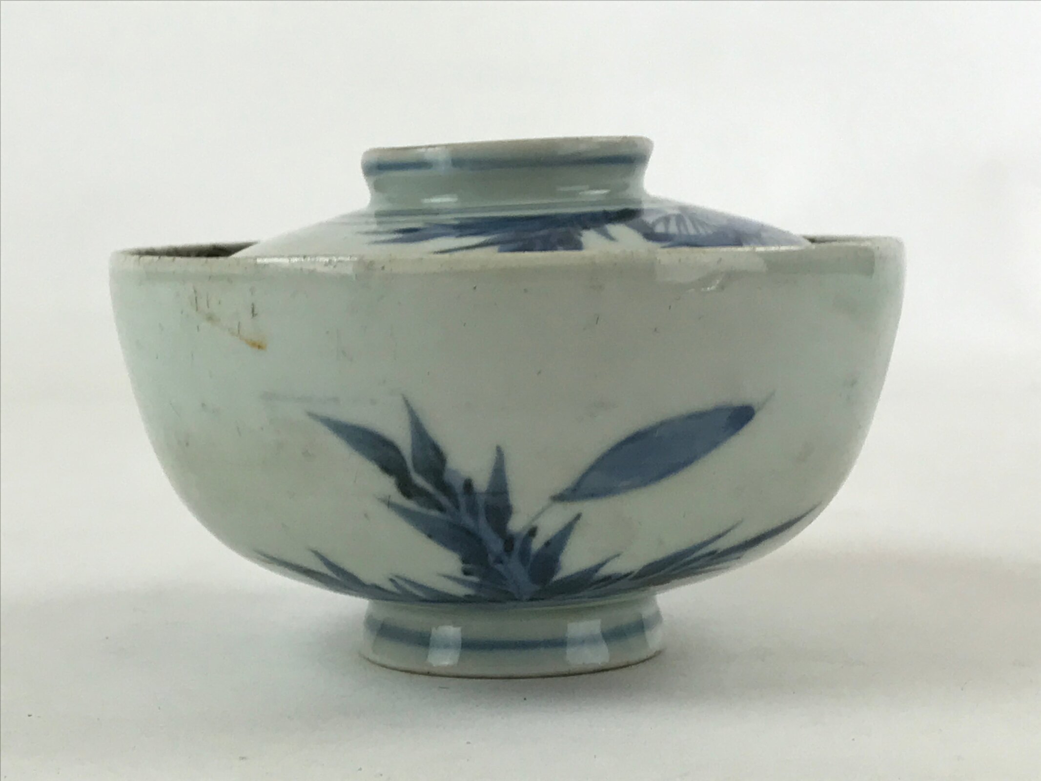 - Good condition considering its age. Large chip on lid. Glaze imperfections. Marks and scratches. Tear and wear due to age. Please see the photos carefully.