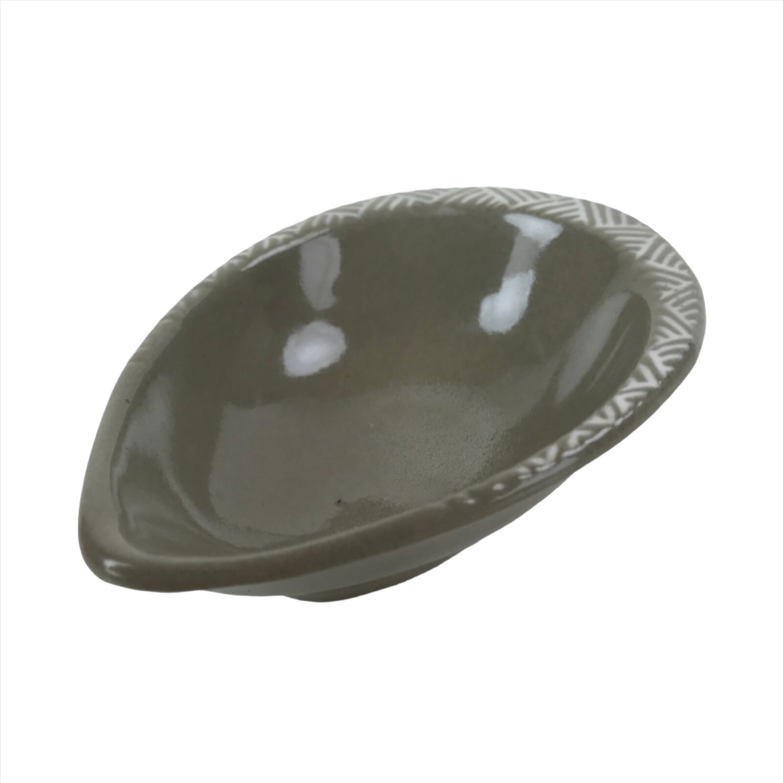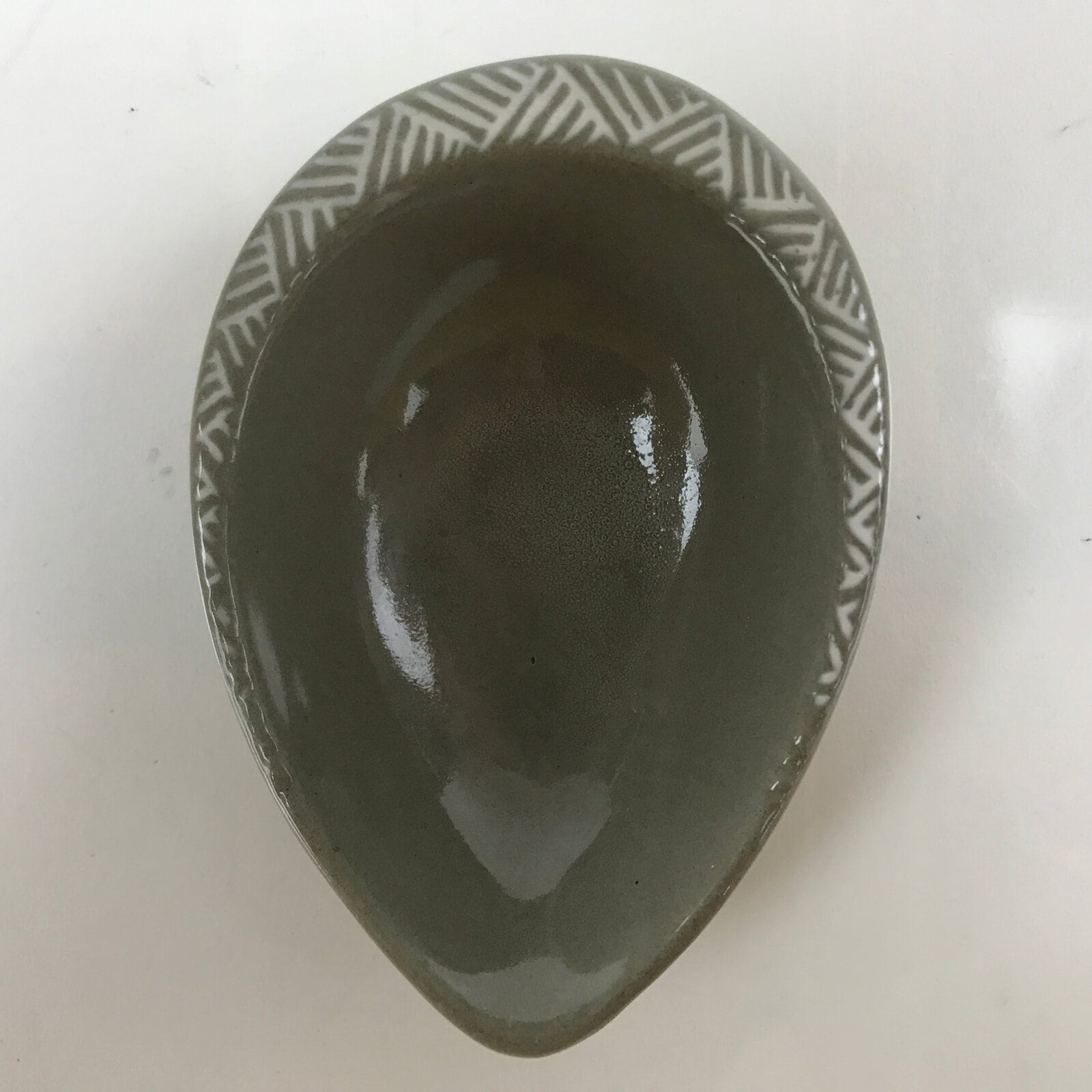 This is a vintage Japanese soy sauce dish, Seiji. It is a small, teardrop-shaped bowl meant to hold soy sauce as well as other seasonings for the purpose of dipping. Featuring a simple gray glaze and white hatch design in the banko ware style, this little bowl can also hold other food items such as pickles. This is a common dish when eating sashimi, for example.