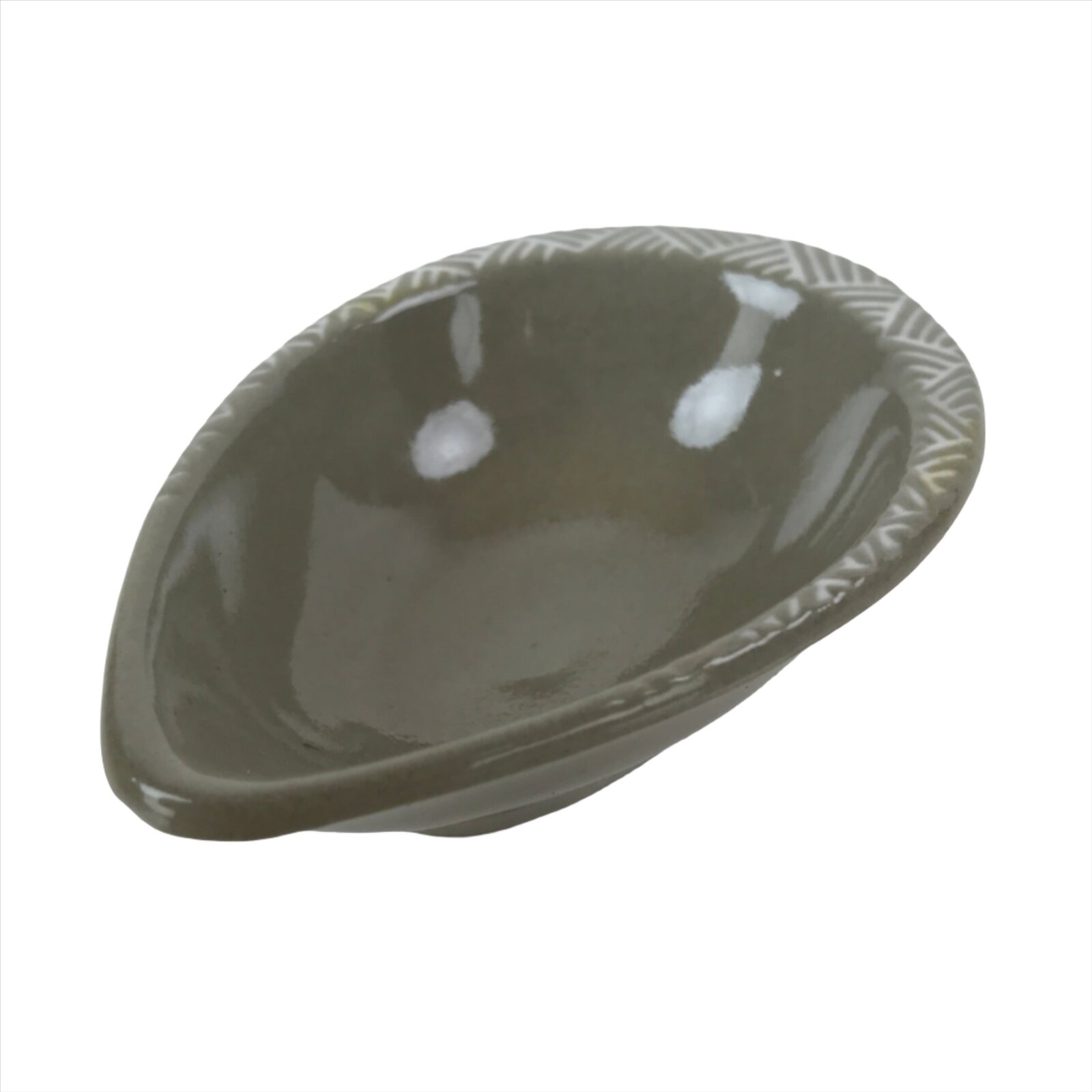This is a vintage Japanese soy sauce dish, Seiji. It is a small, teardrop-shaped bowl meant to hold soy sauce as well as other seasonings for the purpose of dipping. Featuring a simple gray glaze and white hatch design in the banko ware style, this little bowl can also hold other food items such as pickles. This is a common dish when eating sashimi, for example.