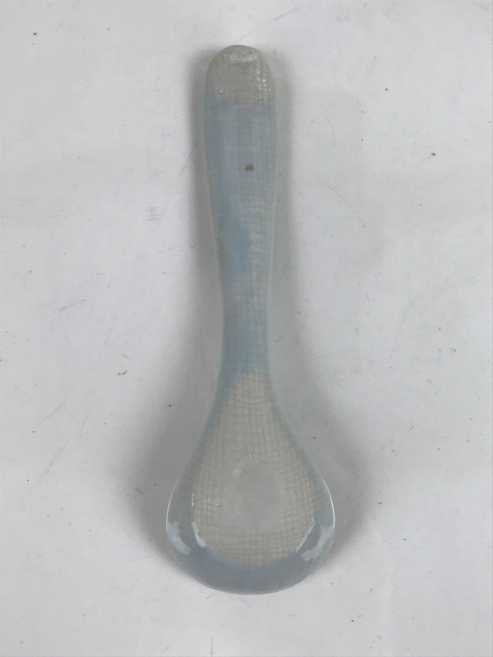 This is a Japanese vintage ceramic spoon. It is small and features a white glaze with blue accent on the handle. Made primarily for eating chawanmushi, a traditional Japanese savory steamed egg custard dish, it is also an excellent choice for puddings, flan, and gelatin desserts as the scoop of the spoon is deep.
