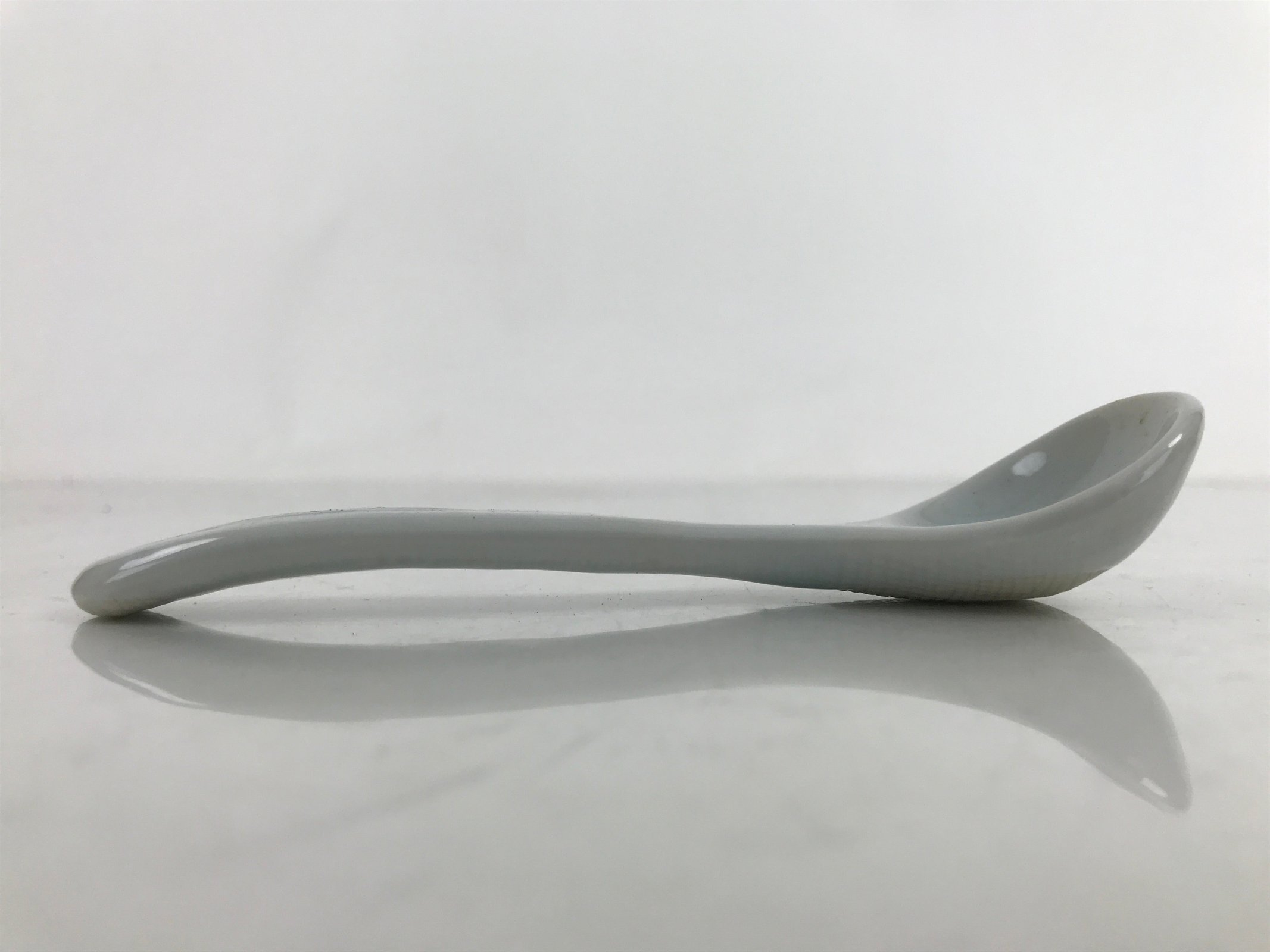 This is a Japanese vintage ceramic spoon. It is small and features a white glaze with blue accent on the handle. Made primarily for eating chawanmushi, a traditional Japanese savory steamed egg custard dish, it is also an excellent choice for puddings, flan, and gelatin desserts as the scoop of the spoon is deep.