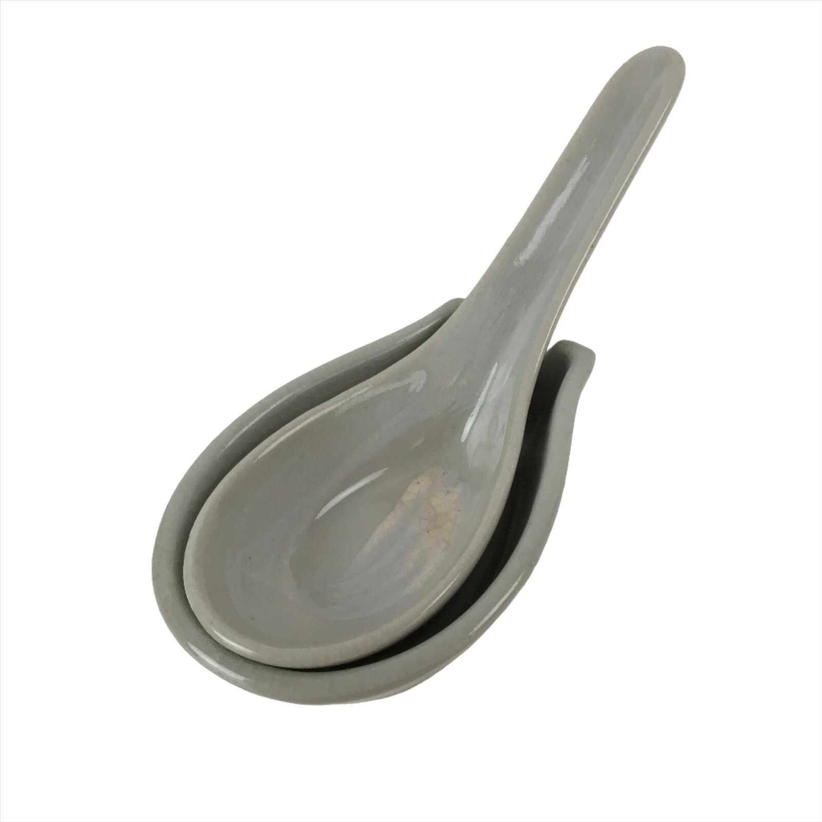 This is a Japanese vintage ceramic large spoon with matching stand/rest. This type of spoon (chirirenge) is used when eating ramen noodles or other soup dishes like nabe hot pot. The spoon has a long, easy to hold handle and features a gray crackled glaze with a white accent.