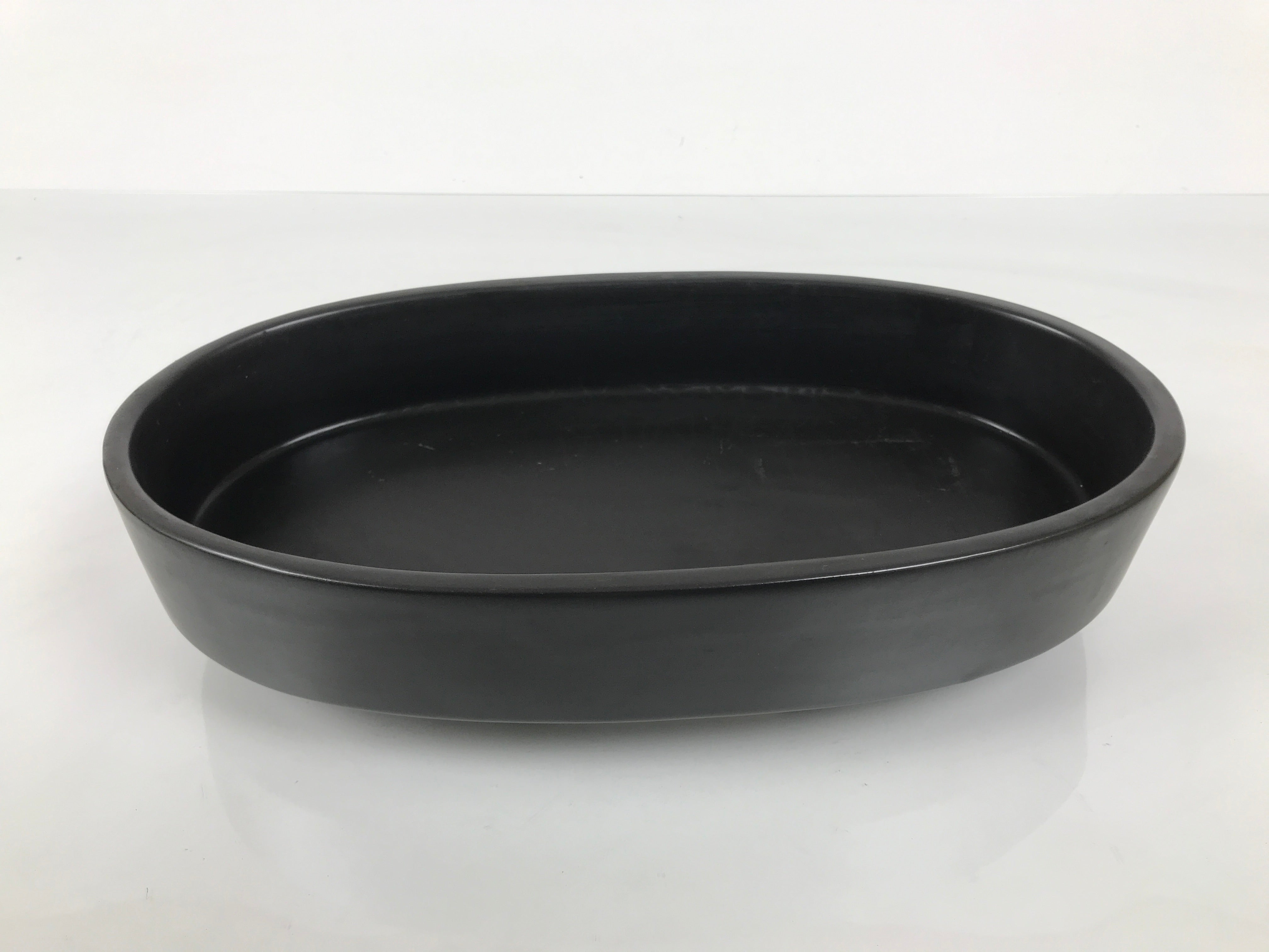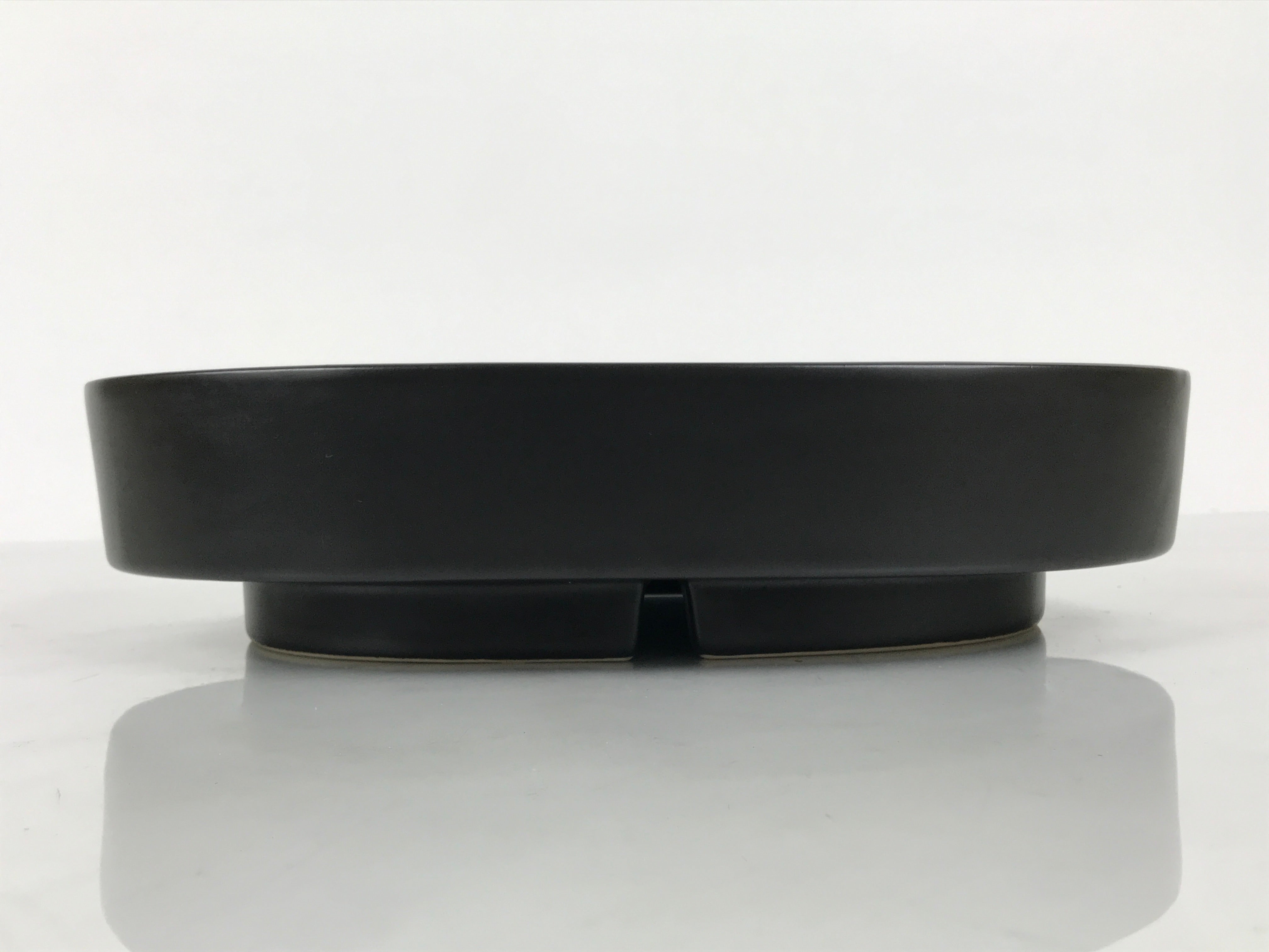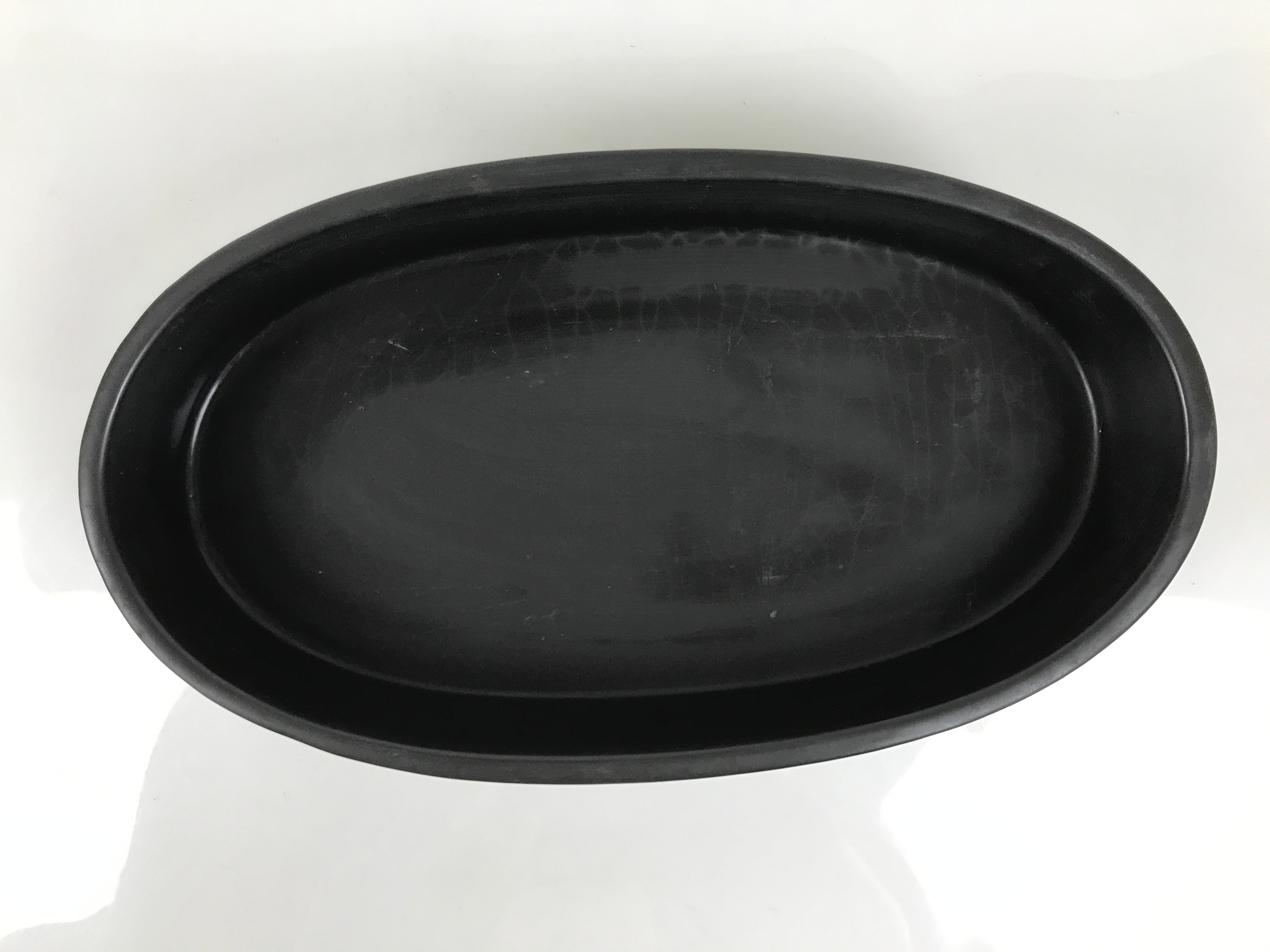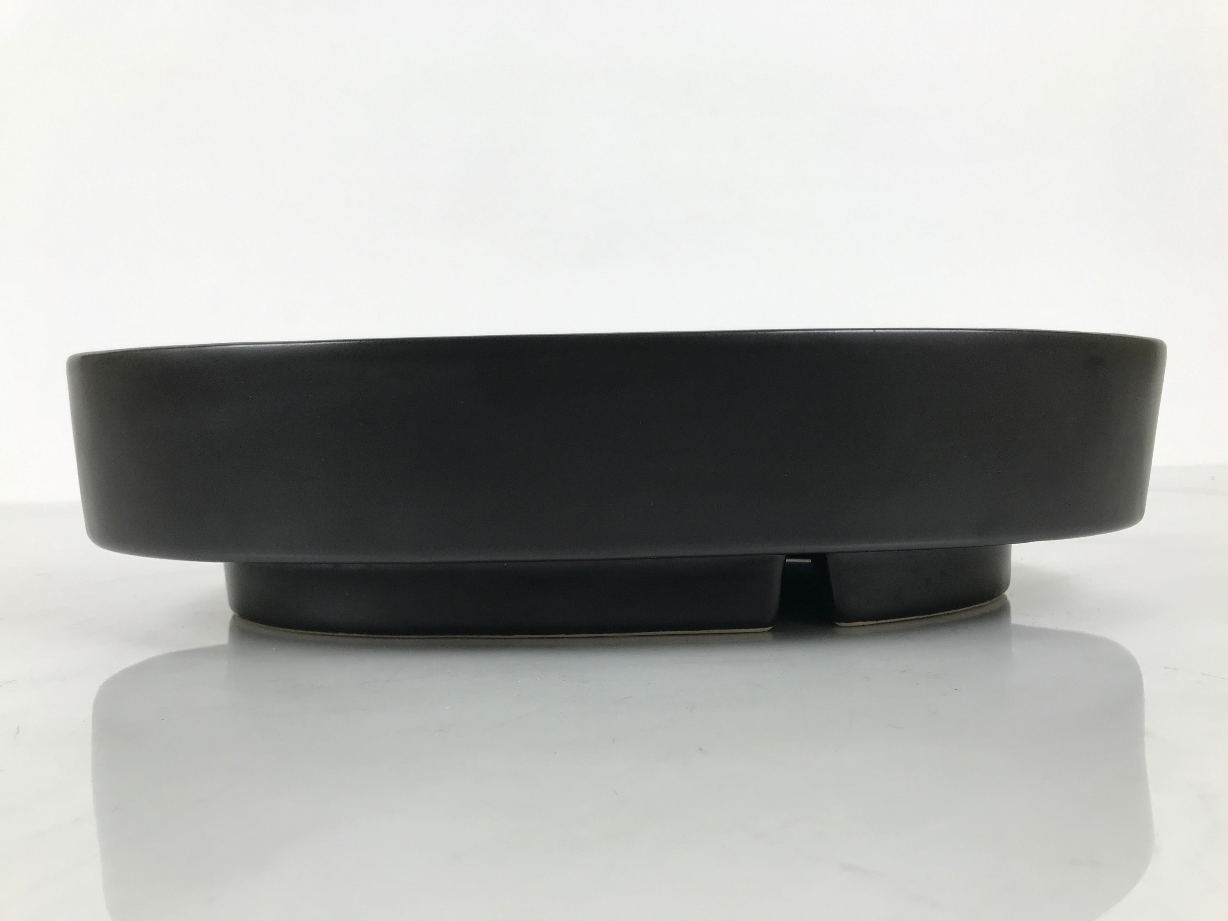 This is a vintage ceramic Japanese flower vase, or suiban. It is a glazed a matte black in a simple oval shape.