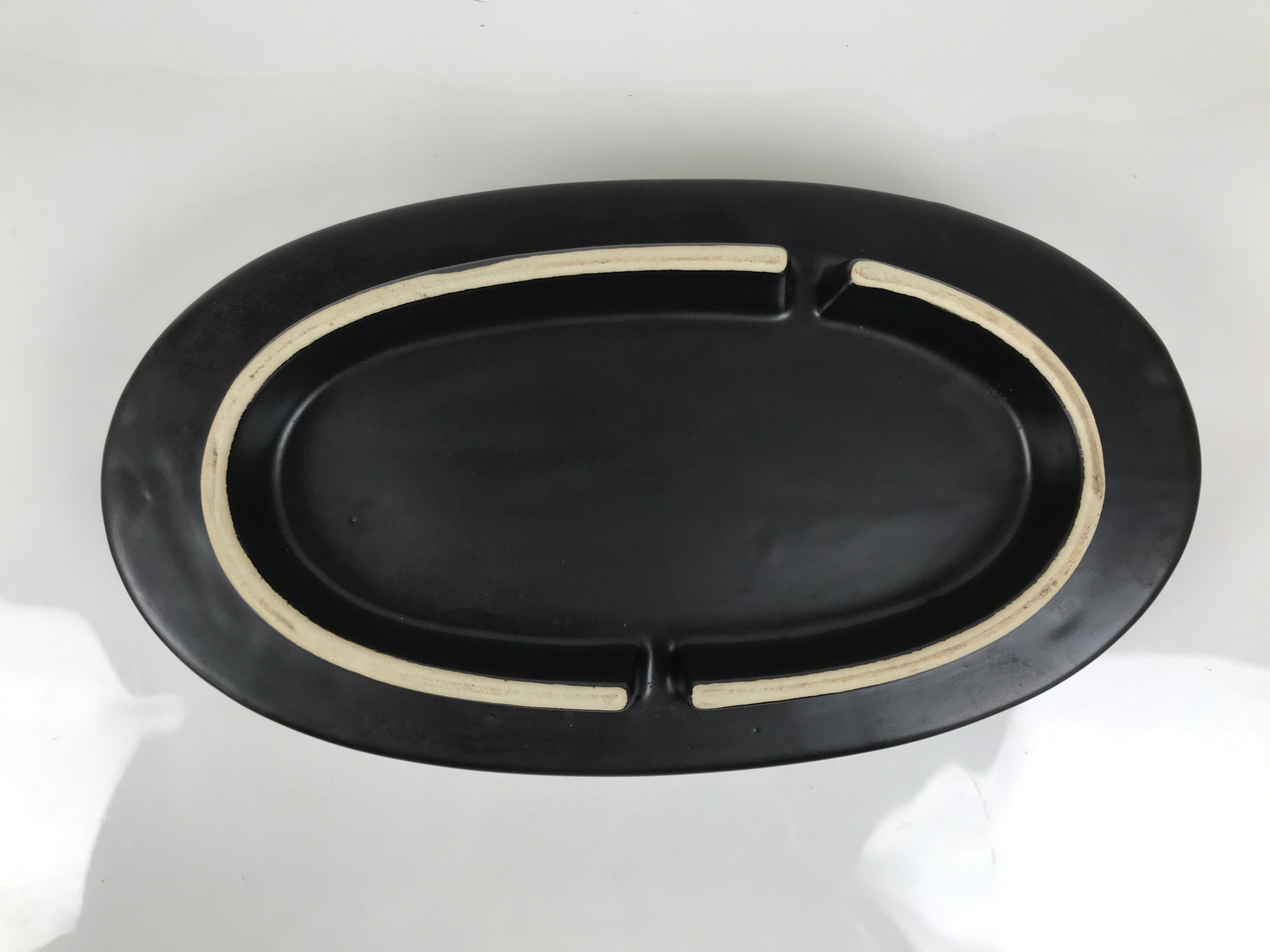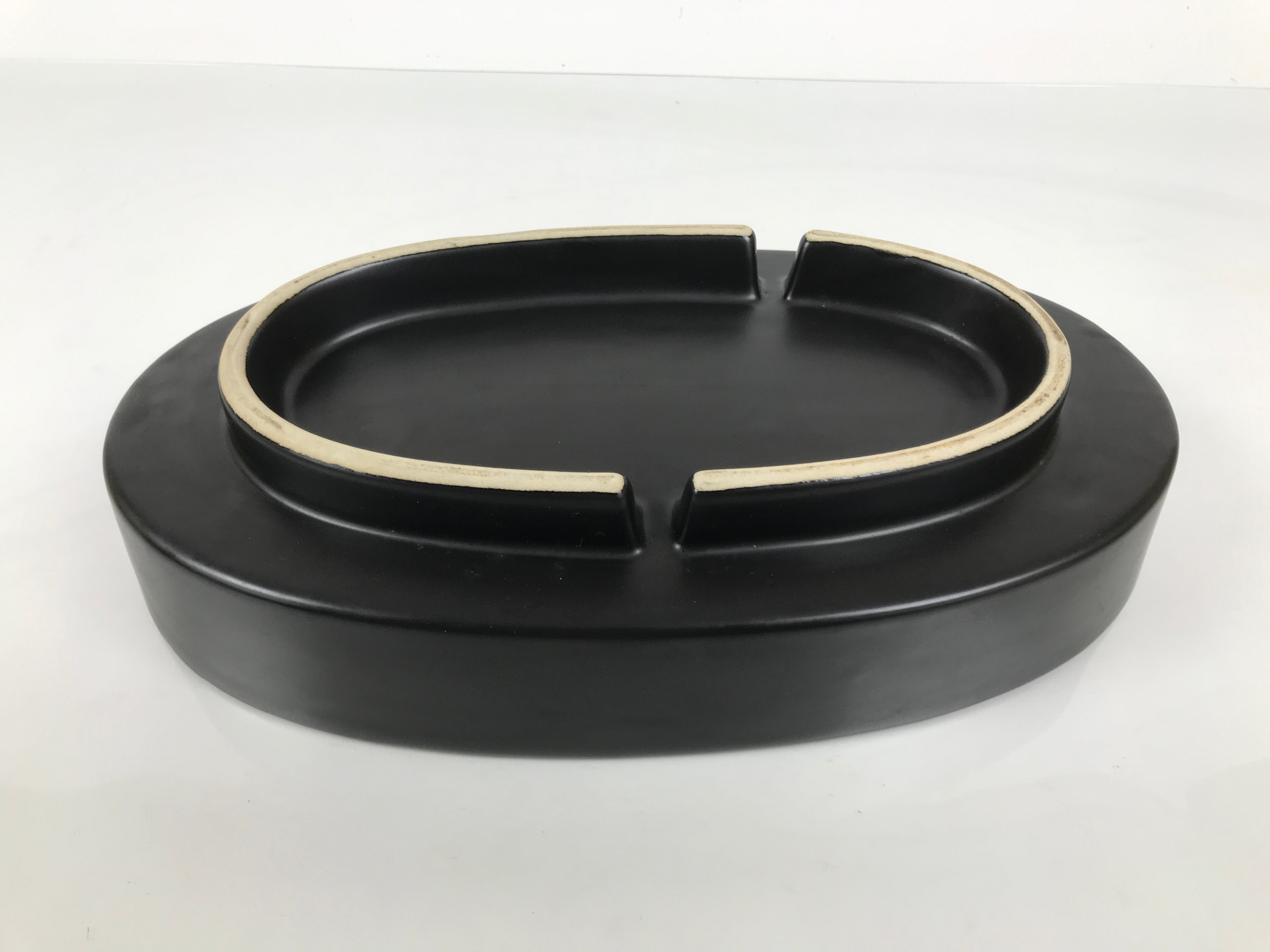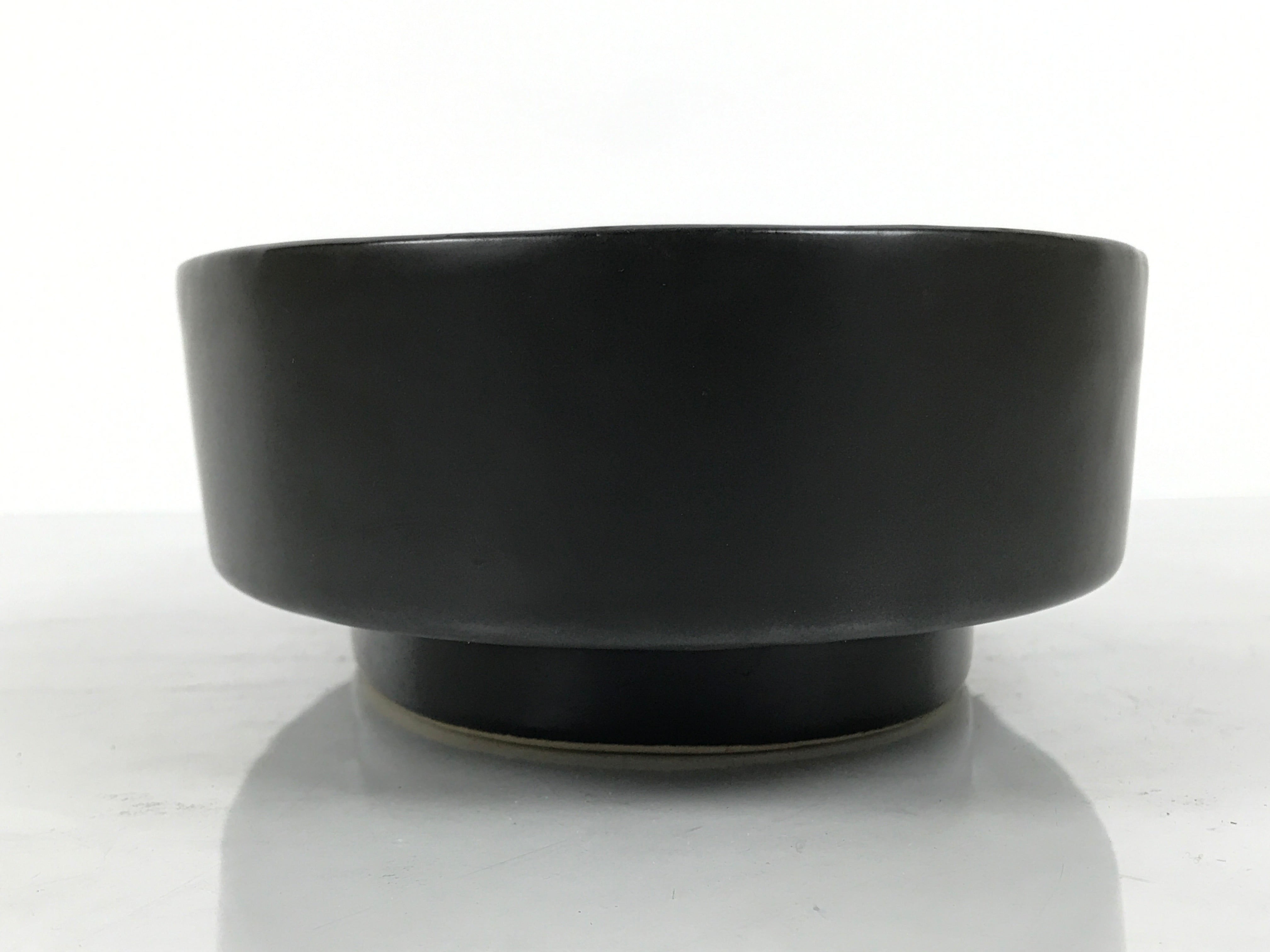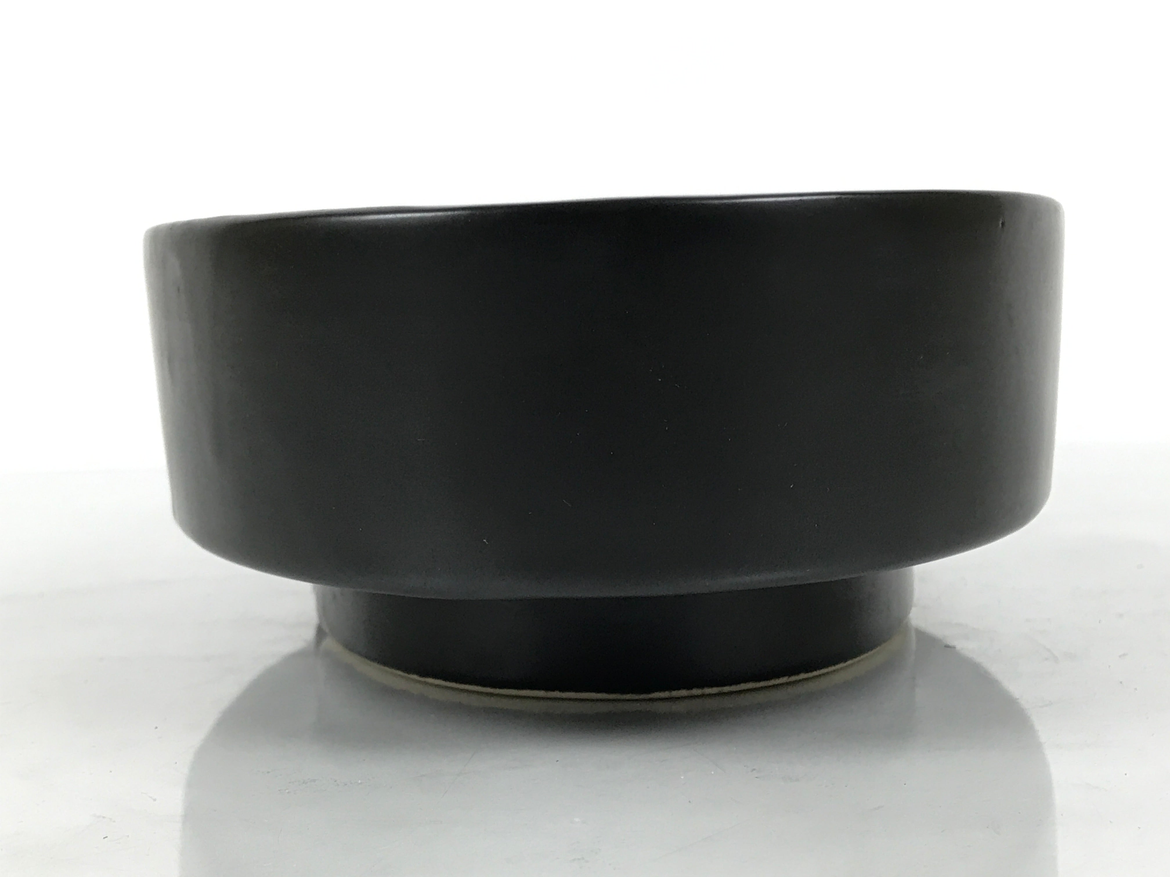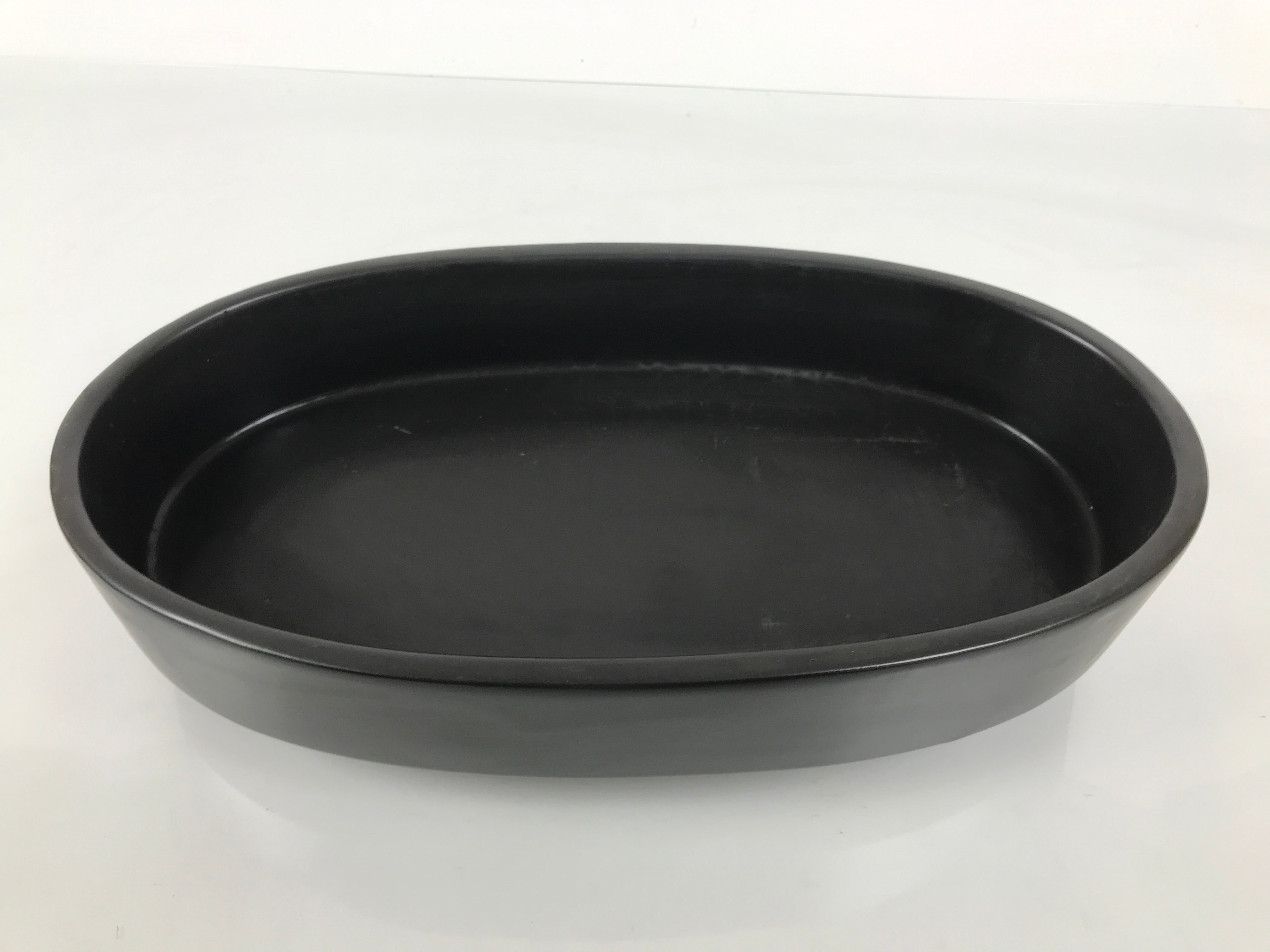 This is a vintage ceramic Japanese flower vase, or suiban. It is a glazed a matte black in a simple oval shape.