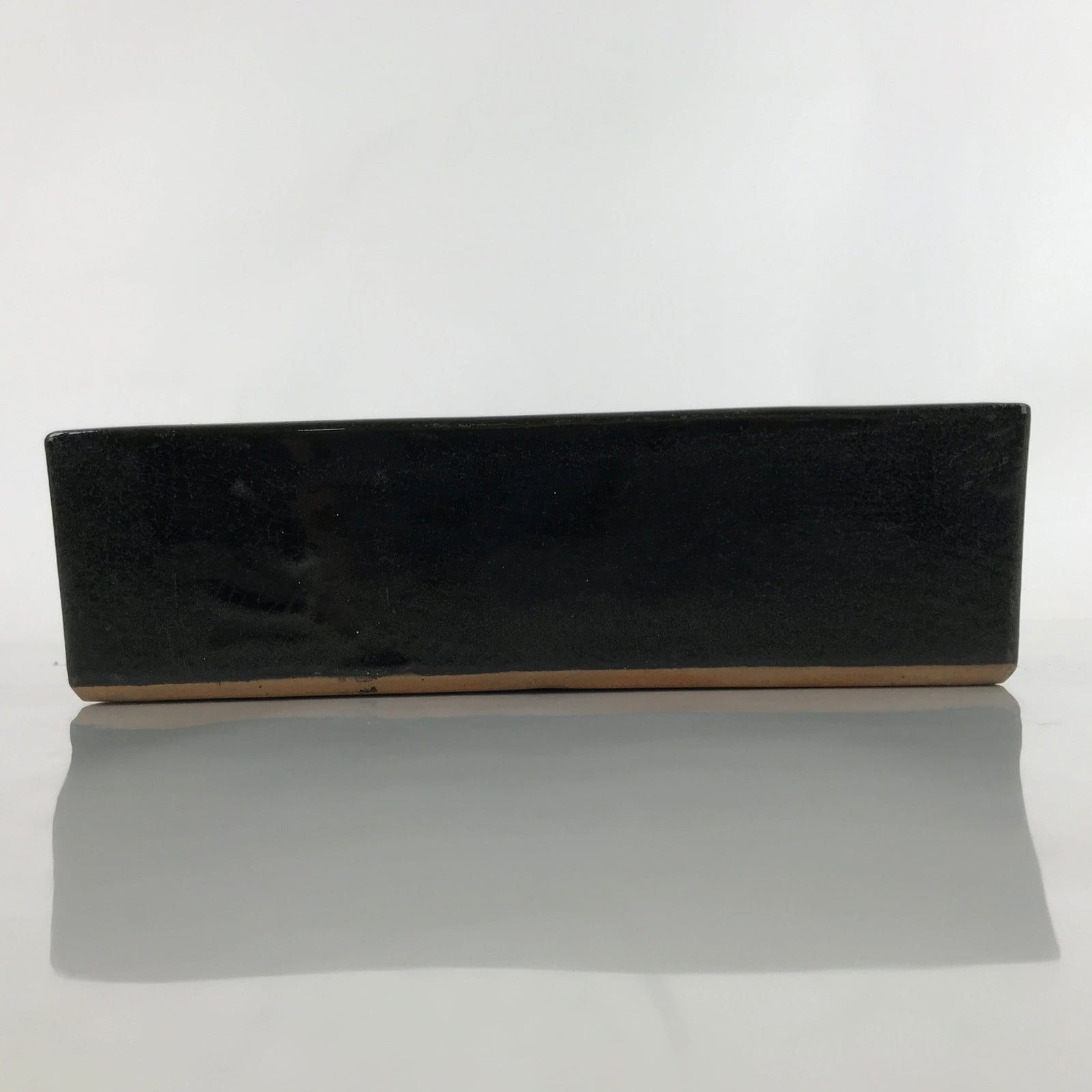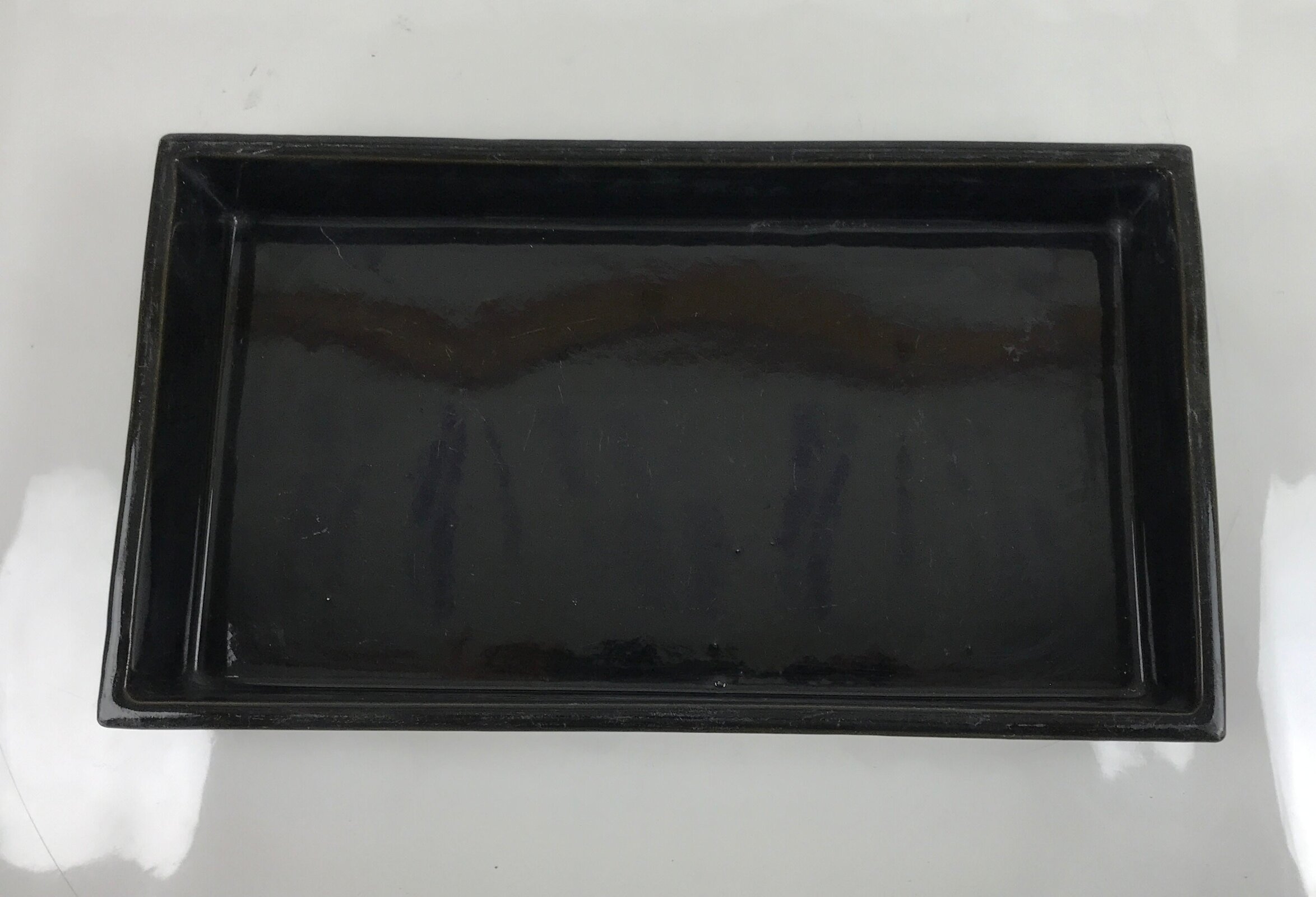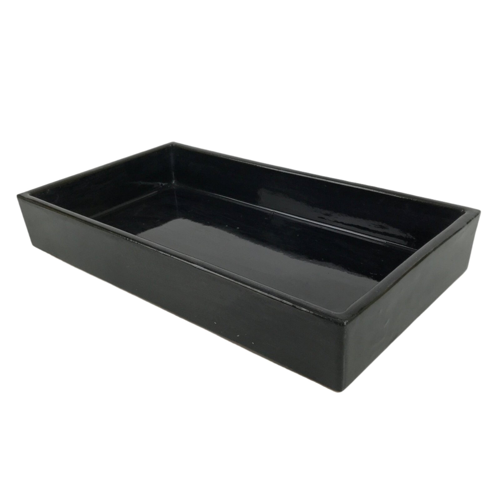 This is a vintage ceramic Japanese flower vase, or suiban. It is a glazed a glossy black color with a rectangular shape.
