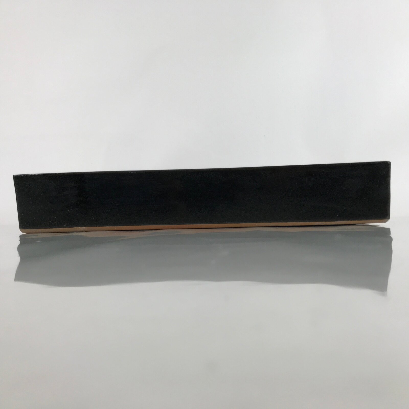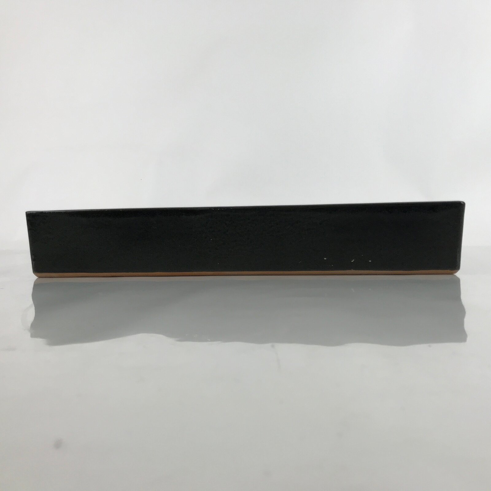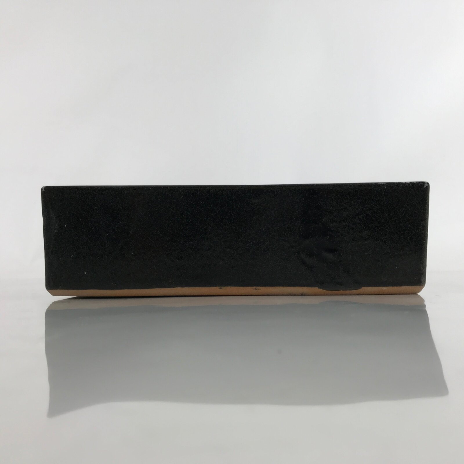 This is a vintage ceramic Japanese flower vase, or suiban. It is a glazed a glossy black color with a rectangular shape.