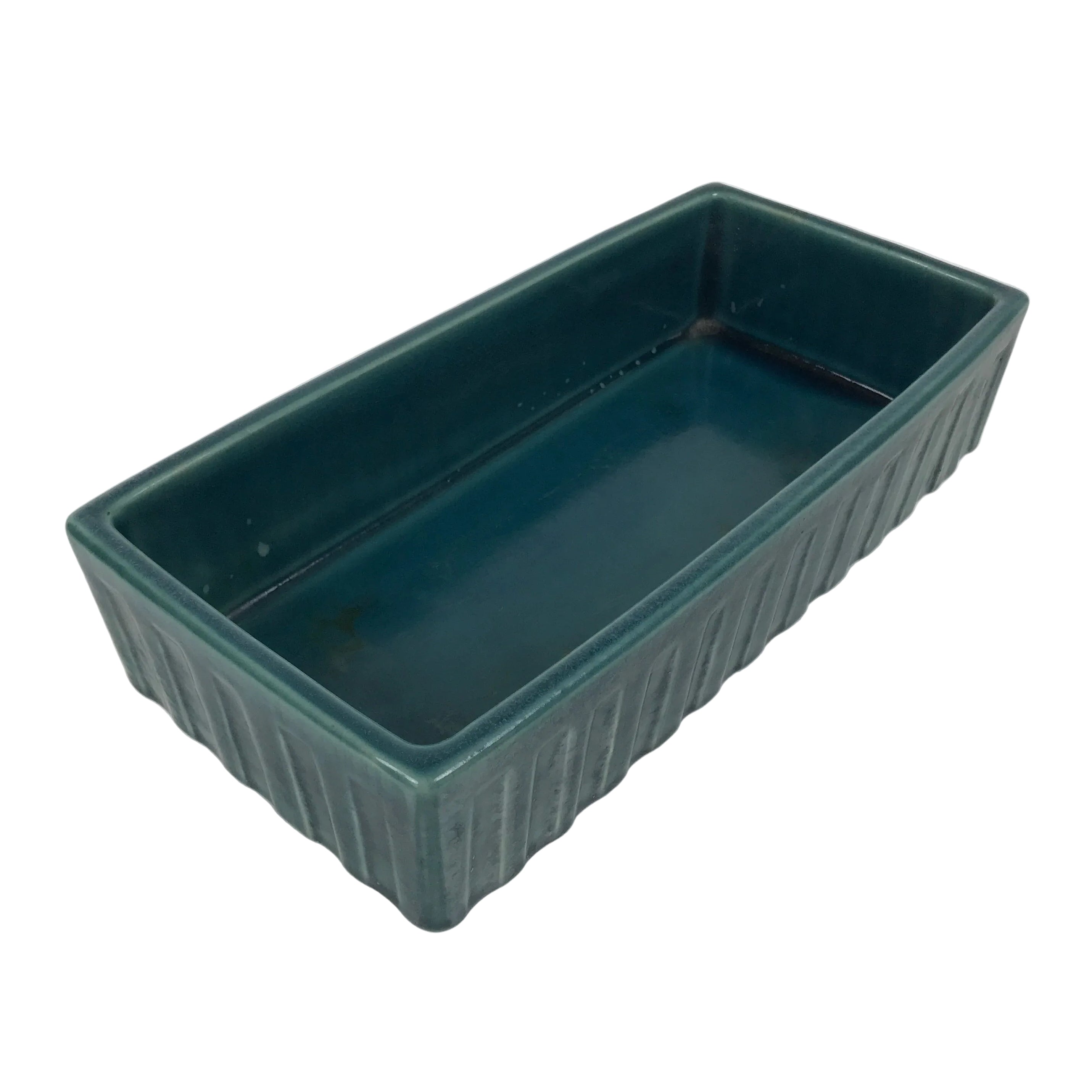 This is a vintage ceramic Japanese flower vase, or suiban. It is a simple rectangular shape and glazed with a medium blue color. There is a vertical rectangular pattern on the sides for decoration. It sits up on four small legs.