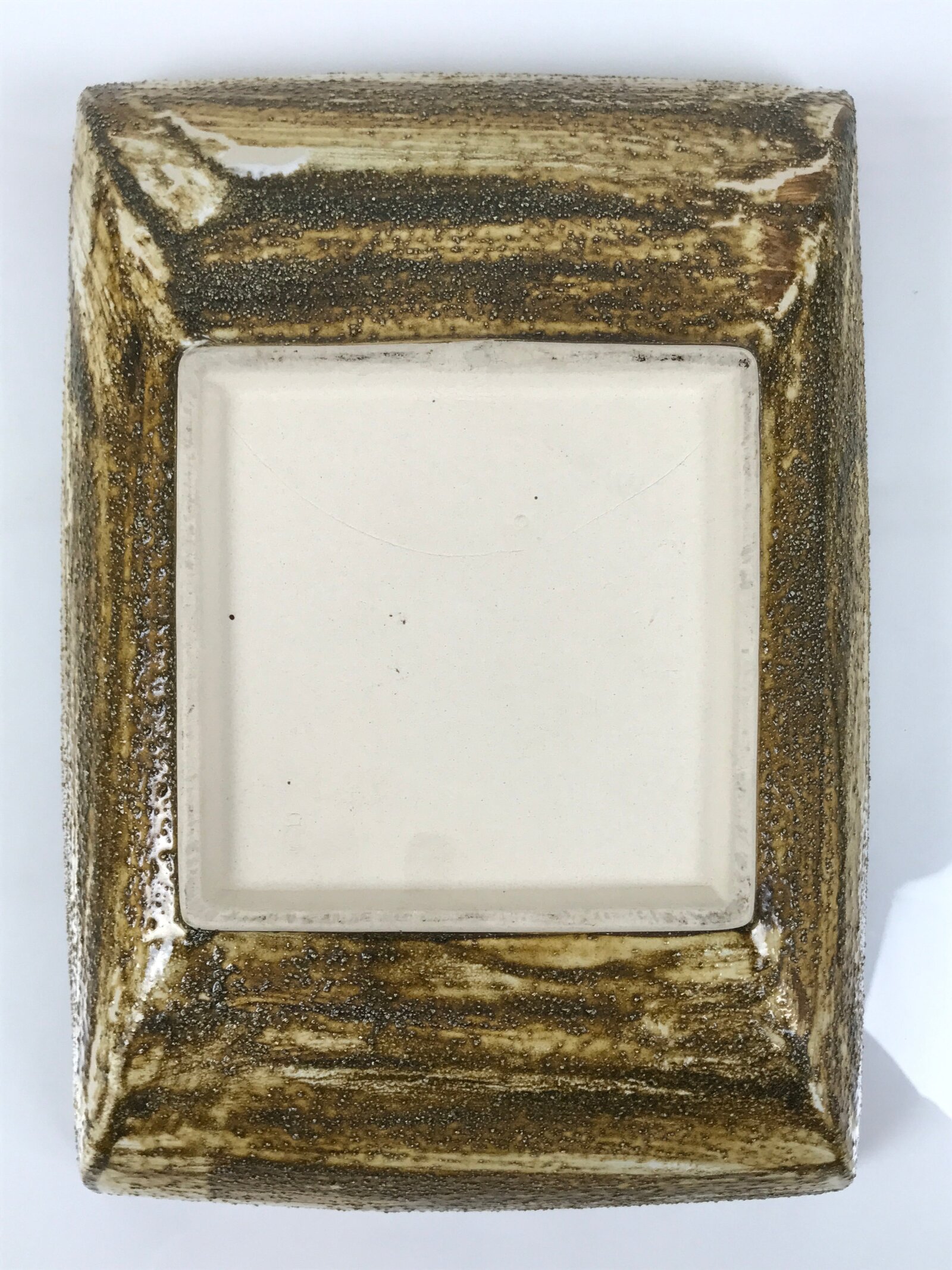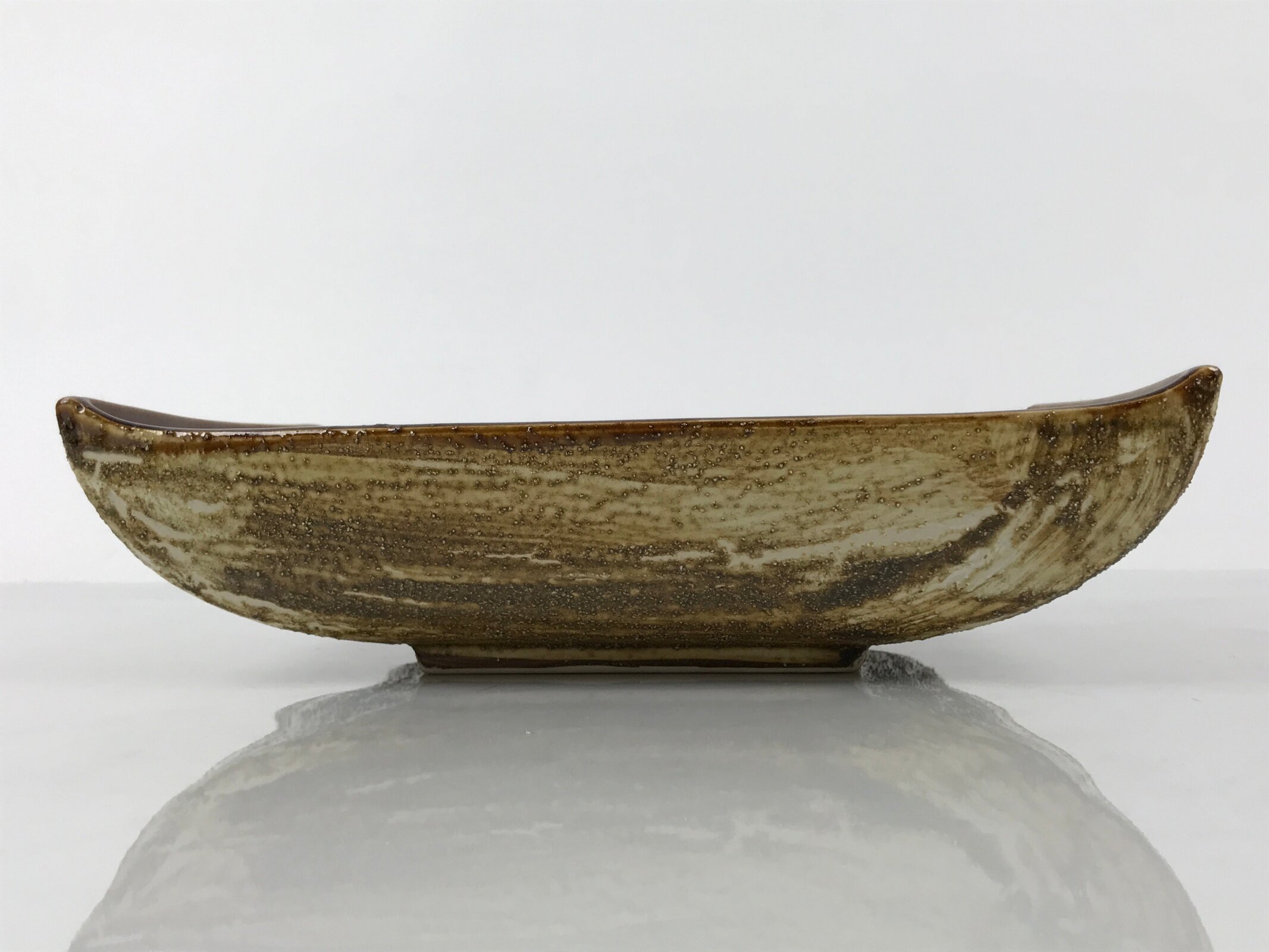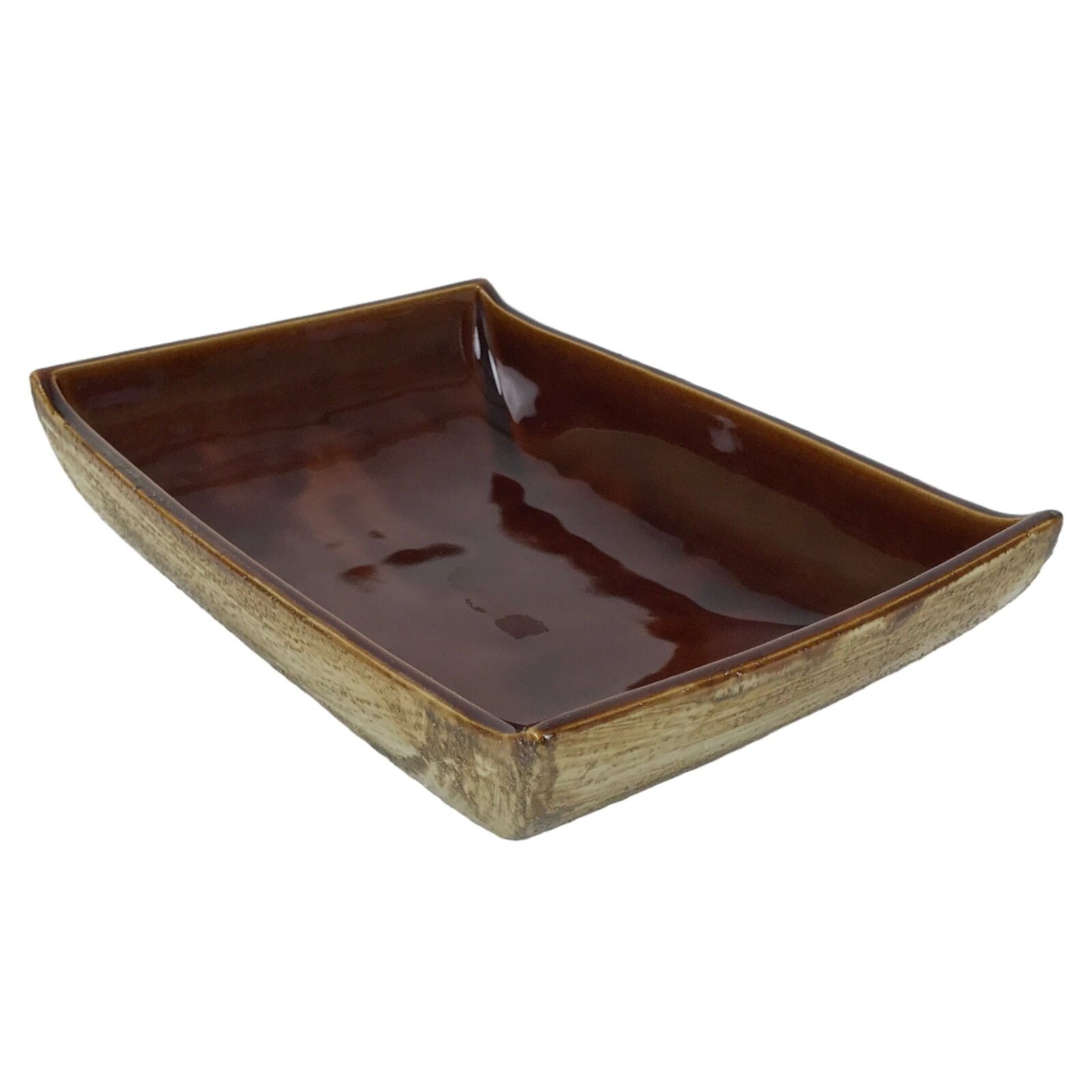 This is a vintage ceramic Japanese flower vase, or suiban. The inside is a glossy chocolate brown color, while the outside edges are a rough-textured brown glaze that mimics the look of tree bark. It is rectangular, but the bottom corners are rounded upward.