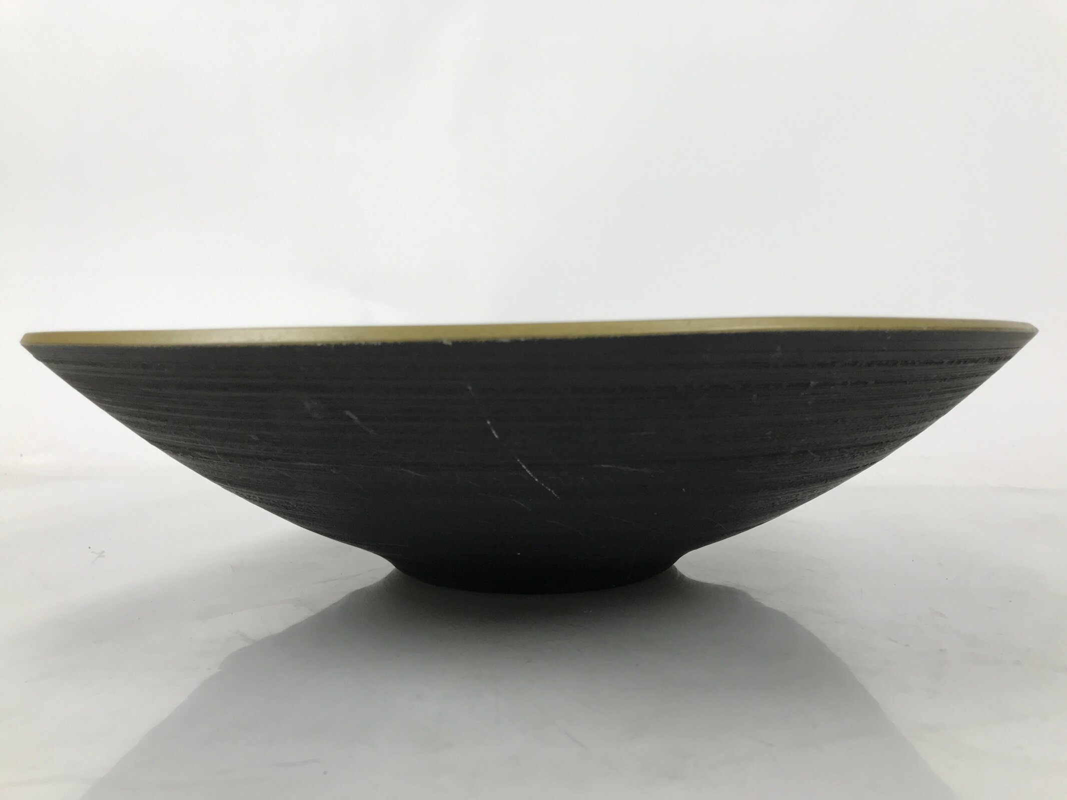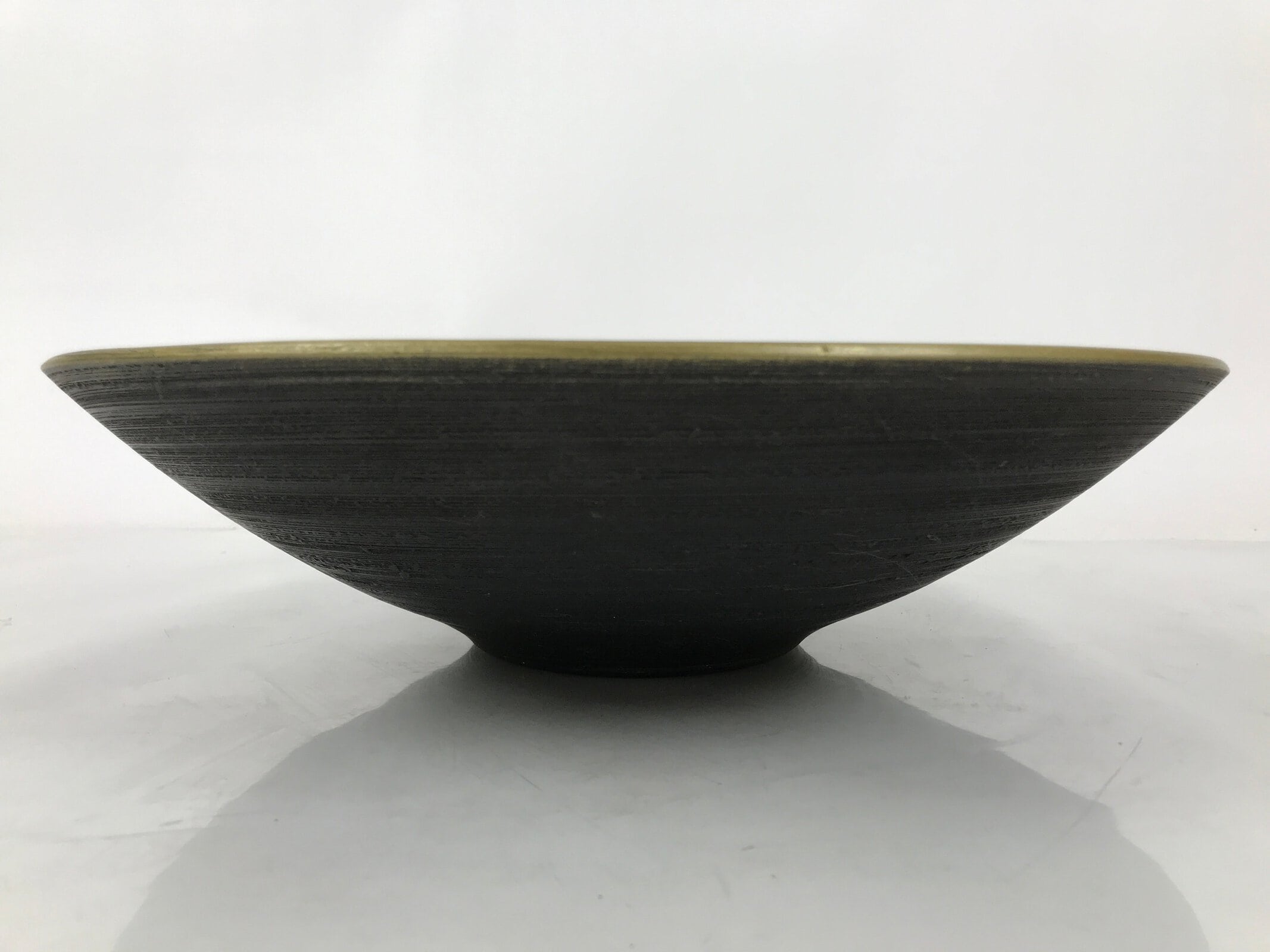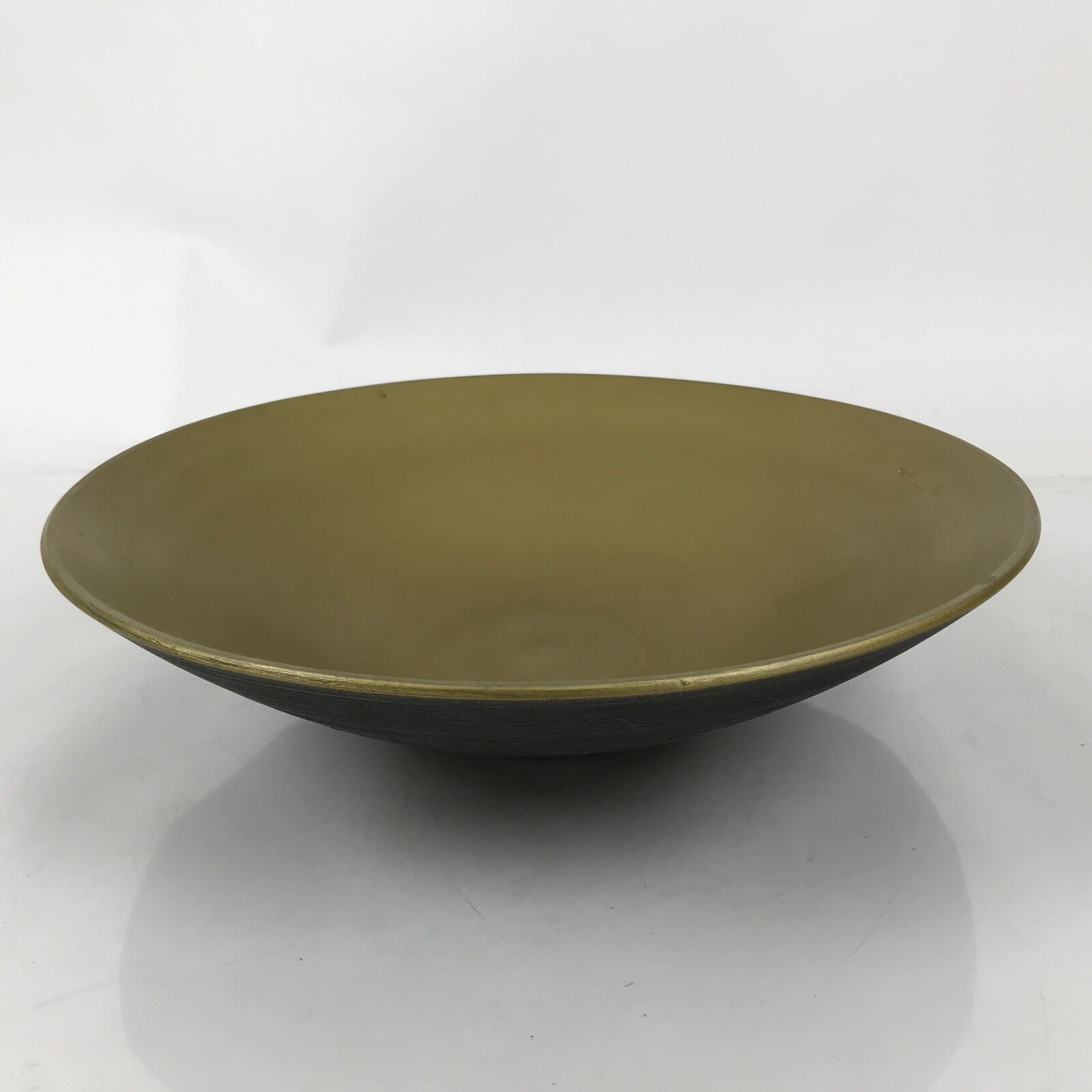 This is a vintage ceramic Japanese flower vase, or suiban. This piece is a round bowl shape with a wide mouth and flat bottom. The inside is a matte gold color while the outside is black. Overall, it is very simple and elegant and the perfect choice to dress up any ikebana arrangement.