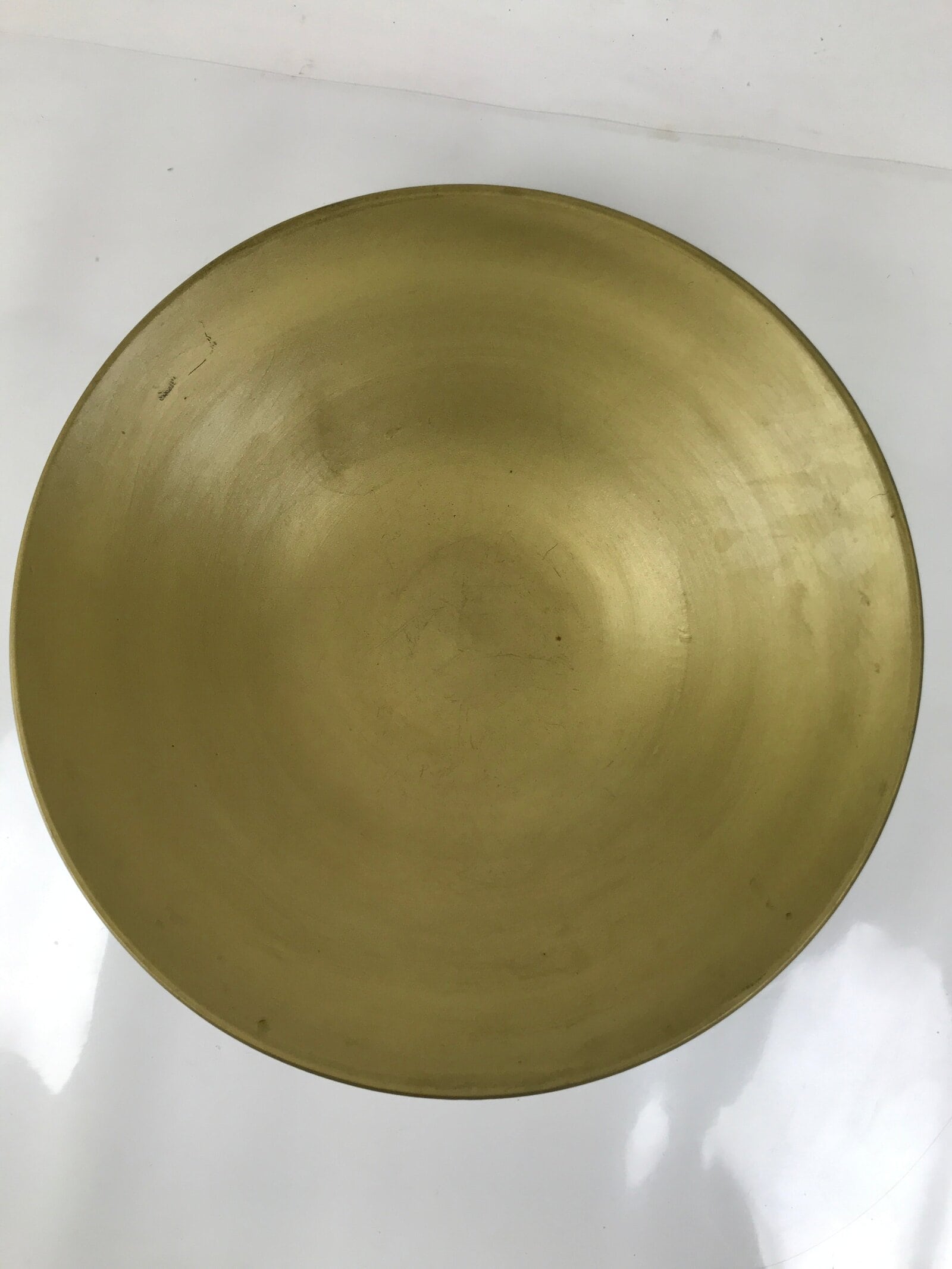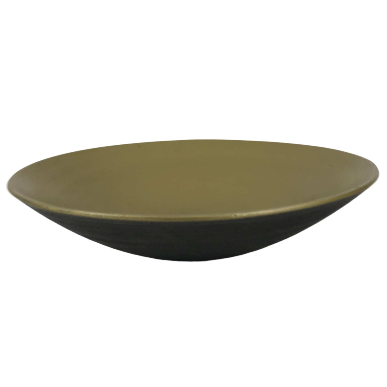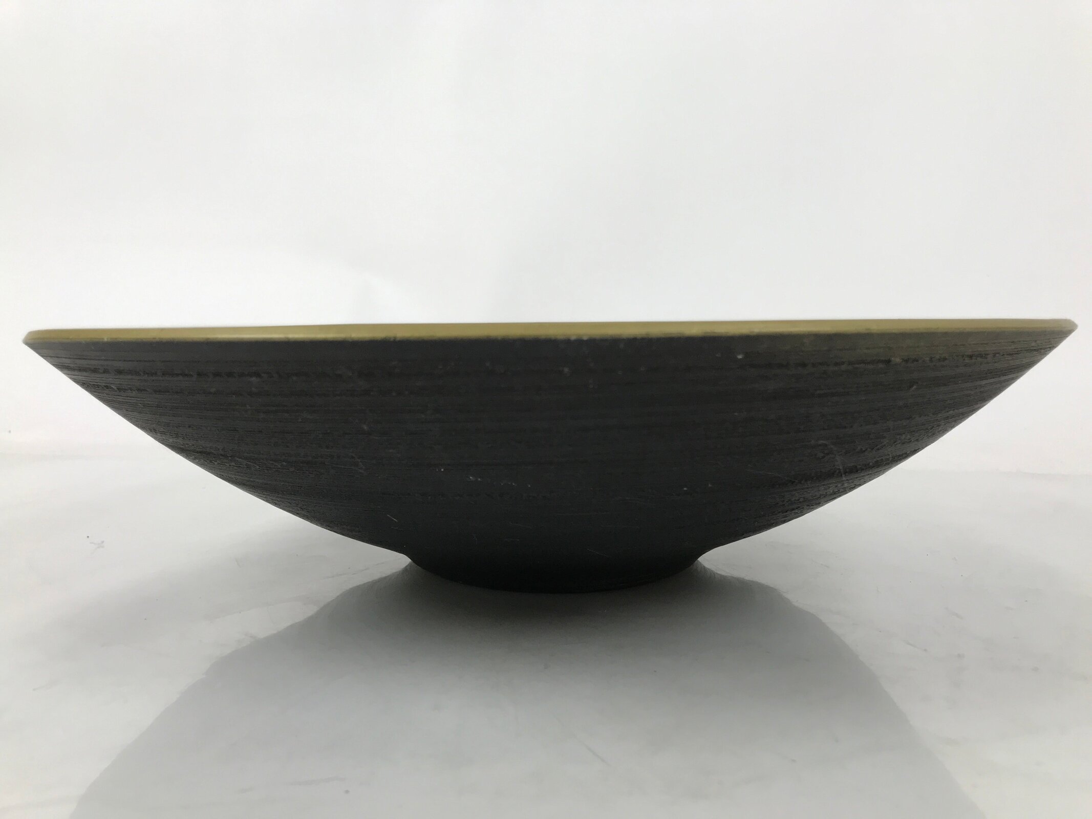 This is a vintage ceramic Japanese flower vase, or suiban. This piece is a round bowl shape with a wide mouth and flat bottom. The inside is a matte gold color while the outside is black. Overall, it is very simple and elegant and the perfect choice to dress up any ikebana arrangement.