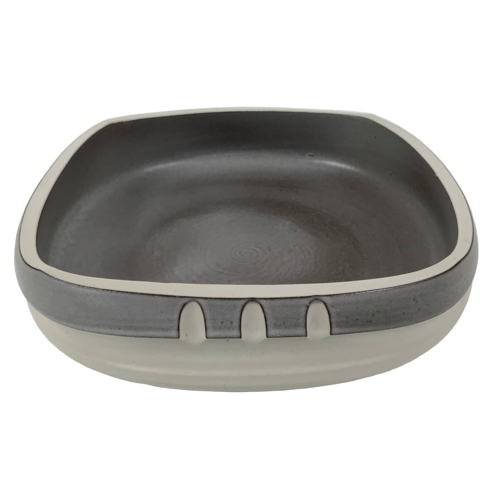 This is a vintage ceramic Japanese flower vase, or suiban. It is glazed a combination of gray and white with minimal decoration. This suiban is small with a rounded square shape. It has a mostly flat inside space and stands on a short pedestal foot.