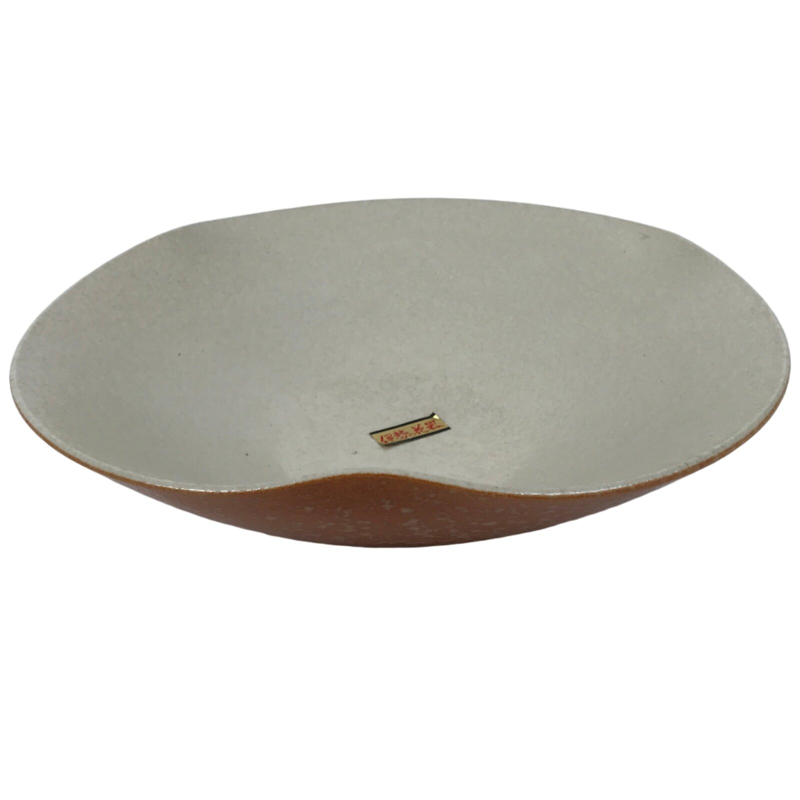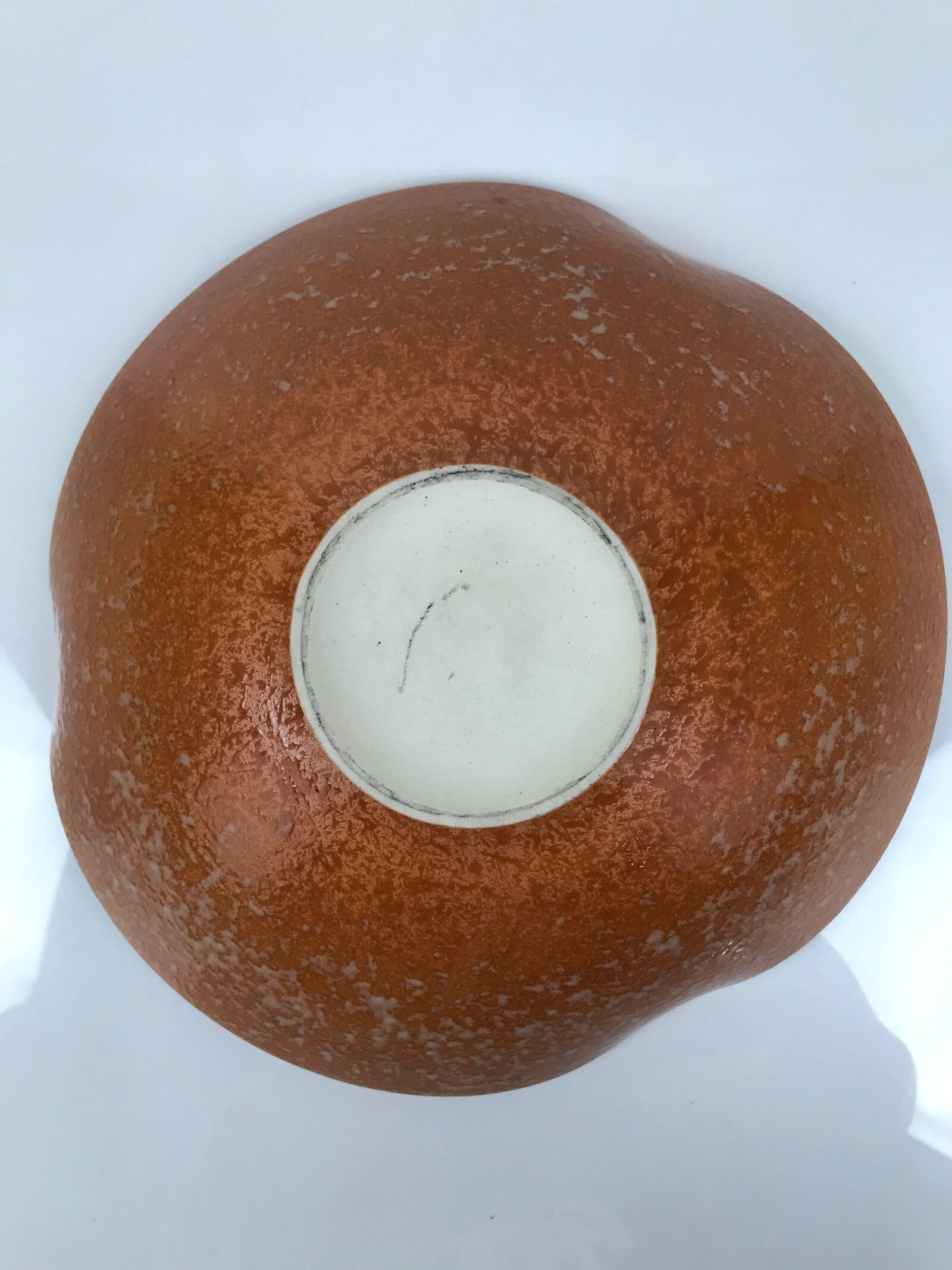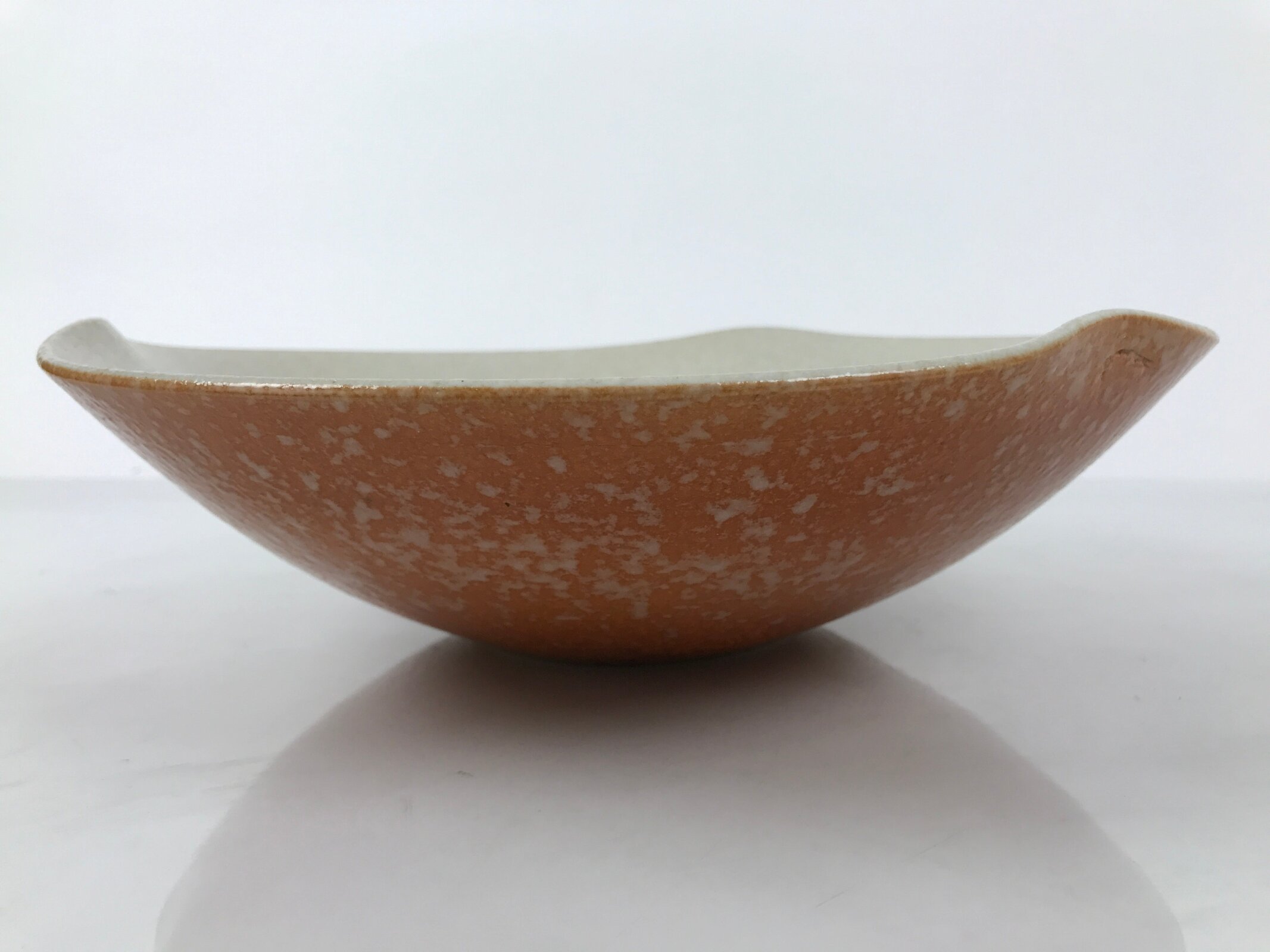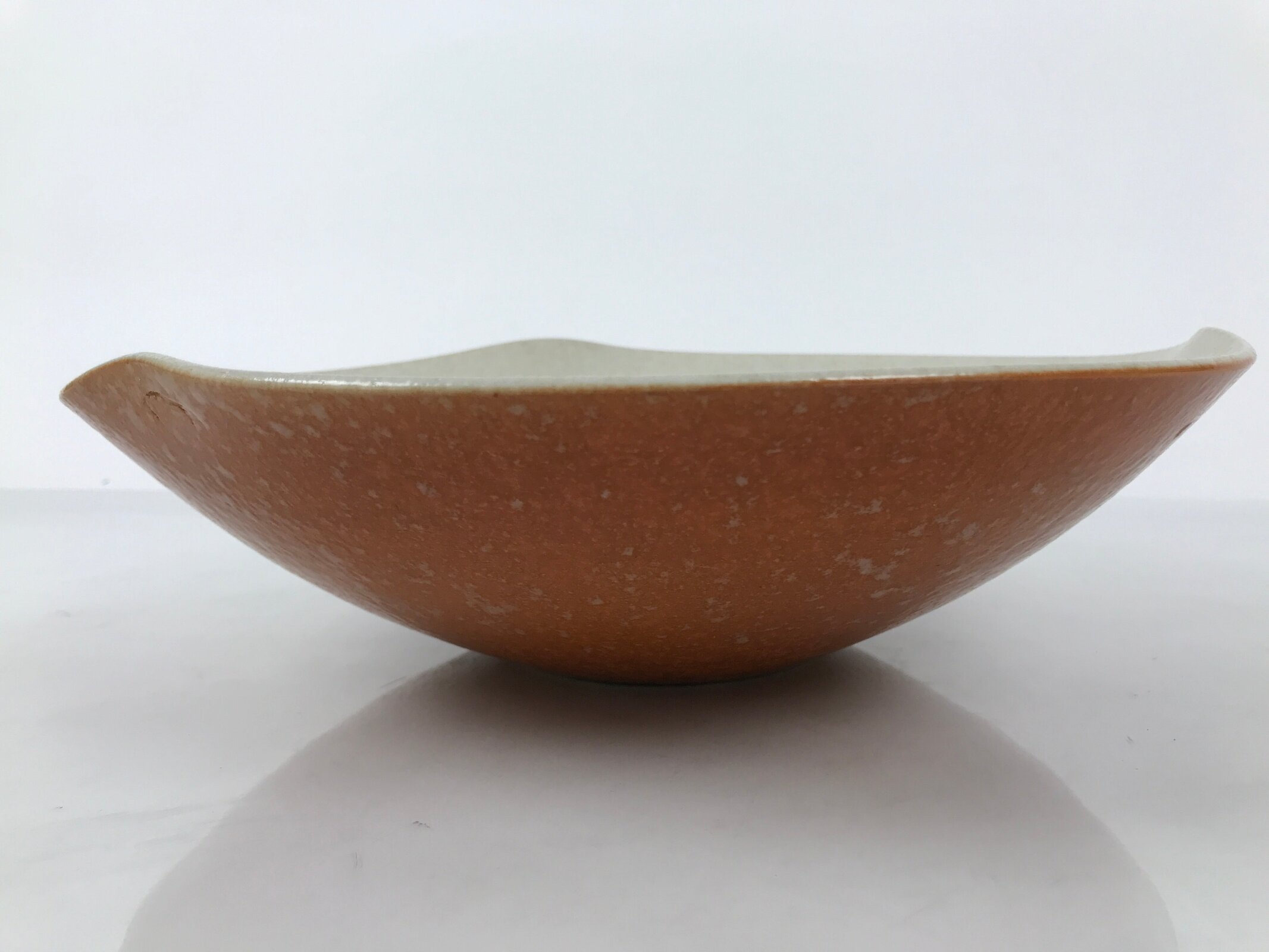 This is a vintage ceramic Japanese flower vase, or suiban. The inside is a textured off-white glaze, while the outside is the same texture but with an orange glaze. It has slightly pinched points on the rim.