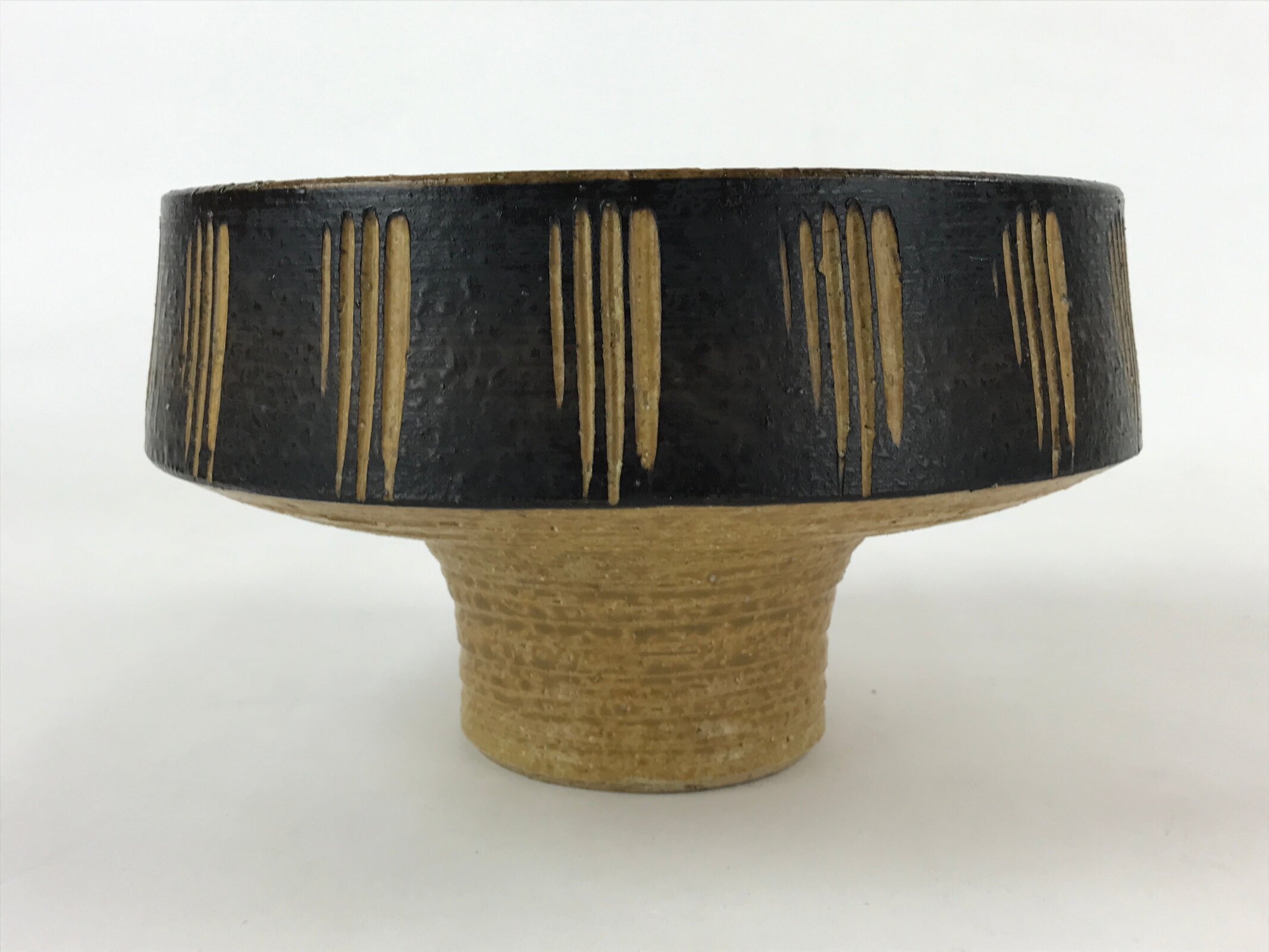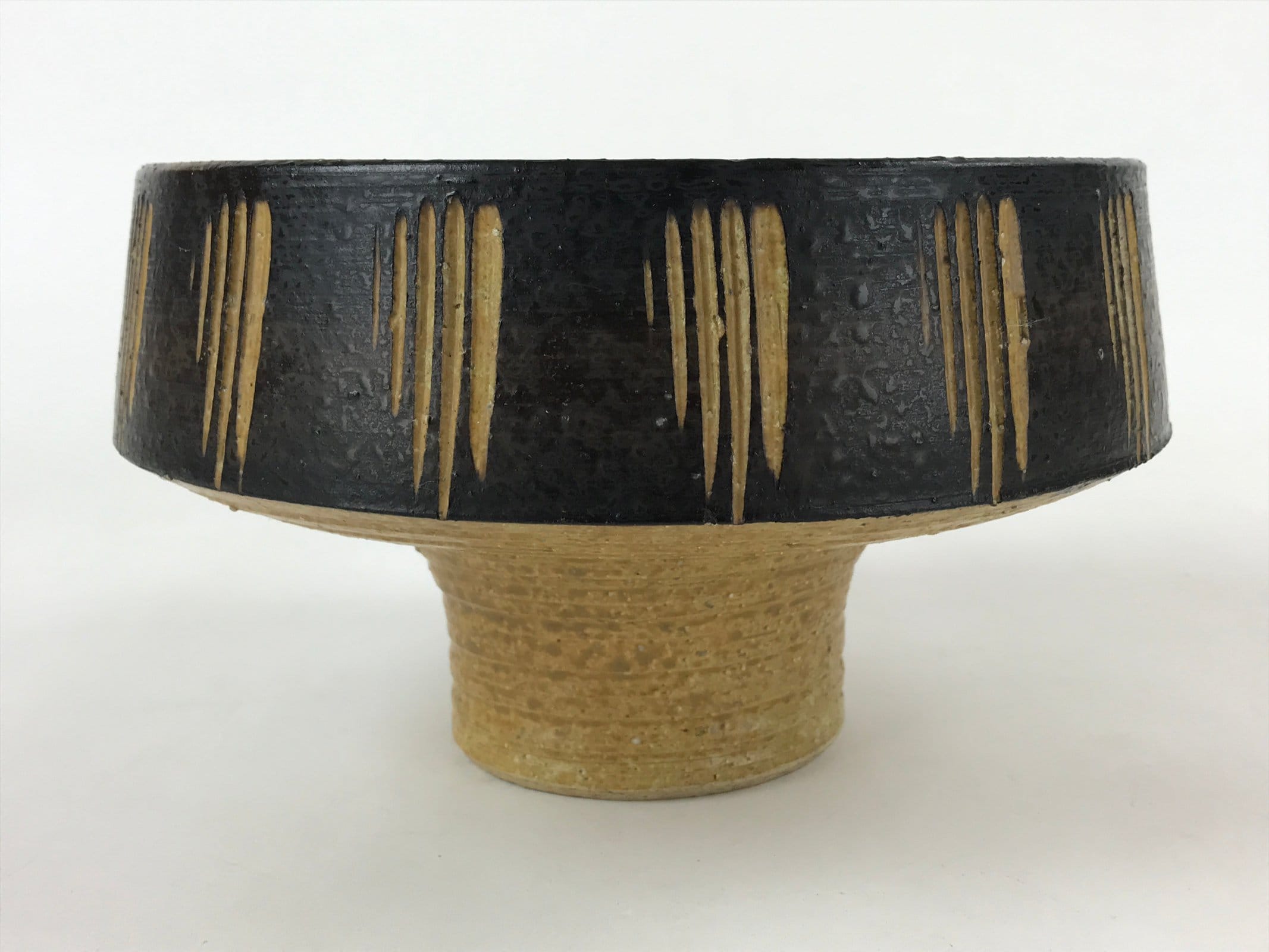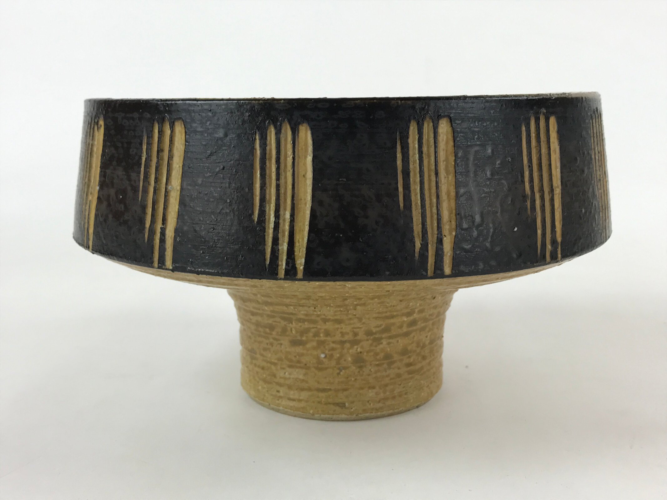 This is a vintage ceramic Japanese flower vase, or suiban. It is glazed a textured black and light brown with a line pattern on the outside edge. This suiban is round and stands tall via sculpted platform.
