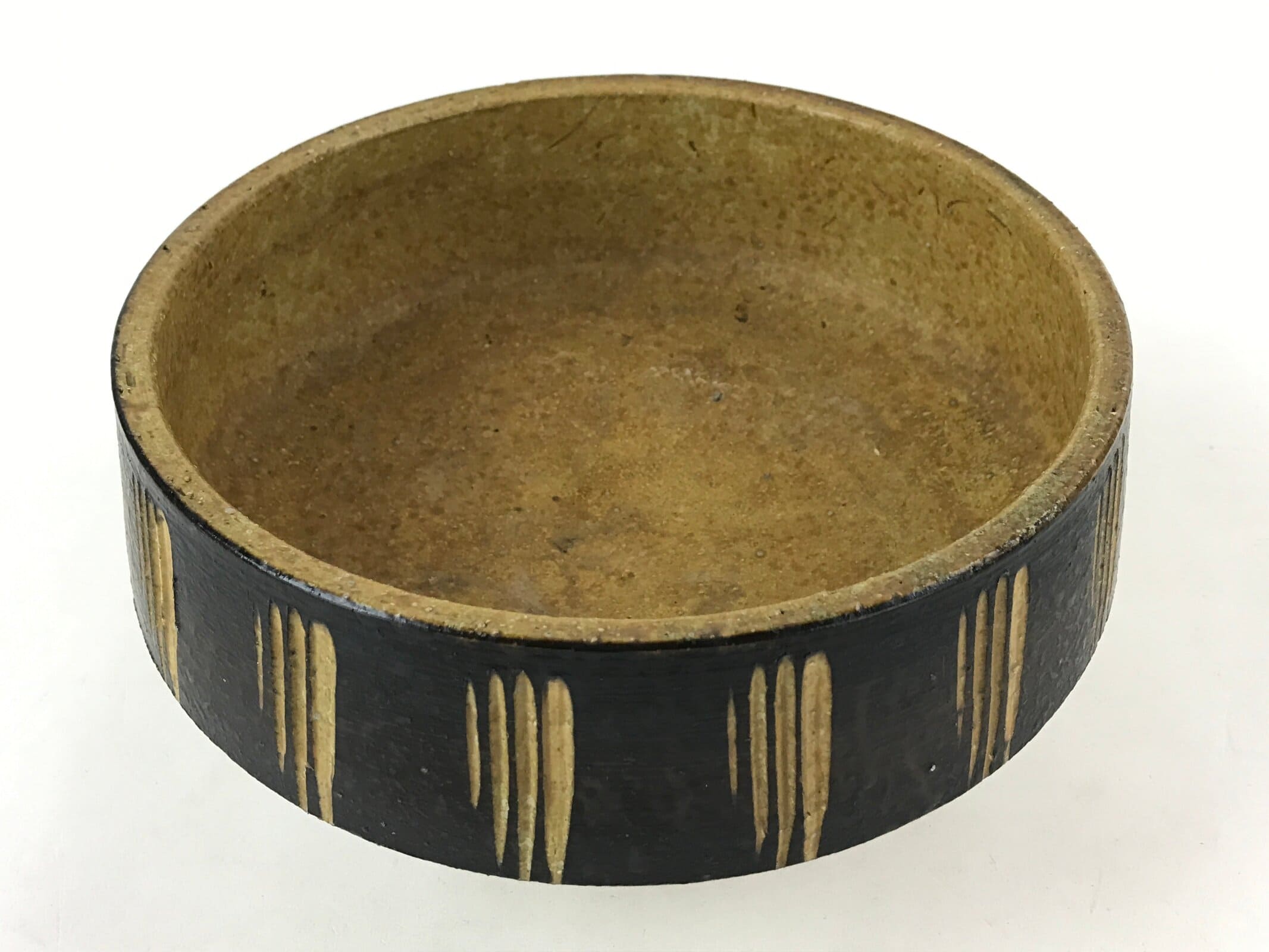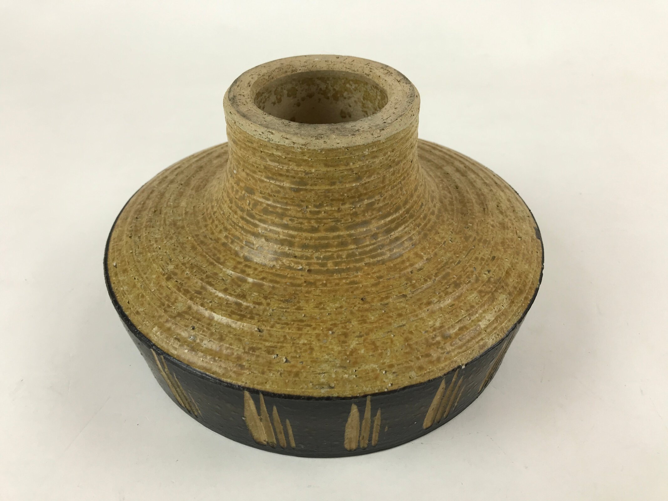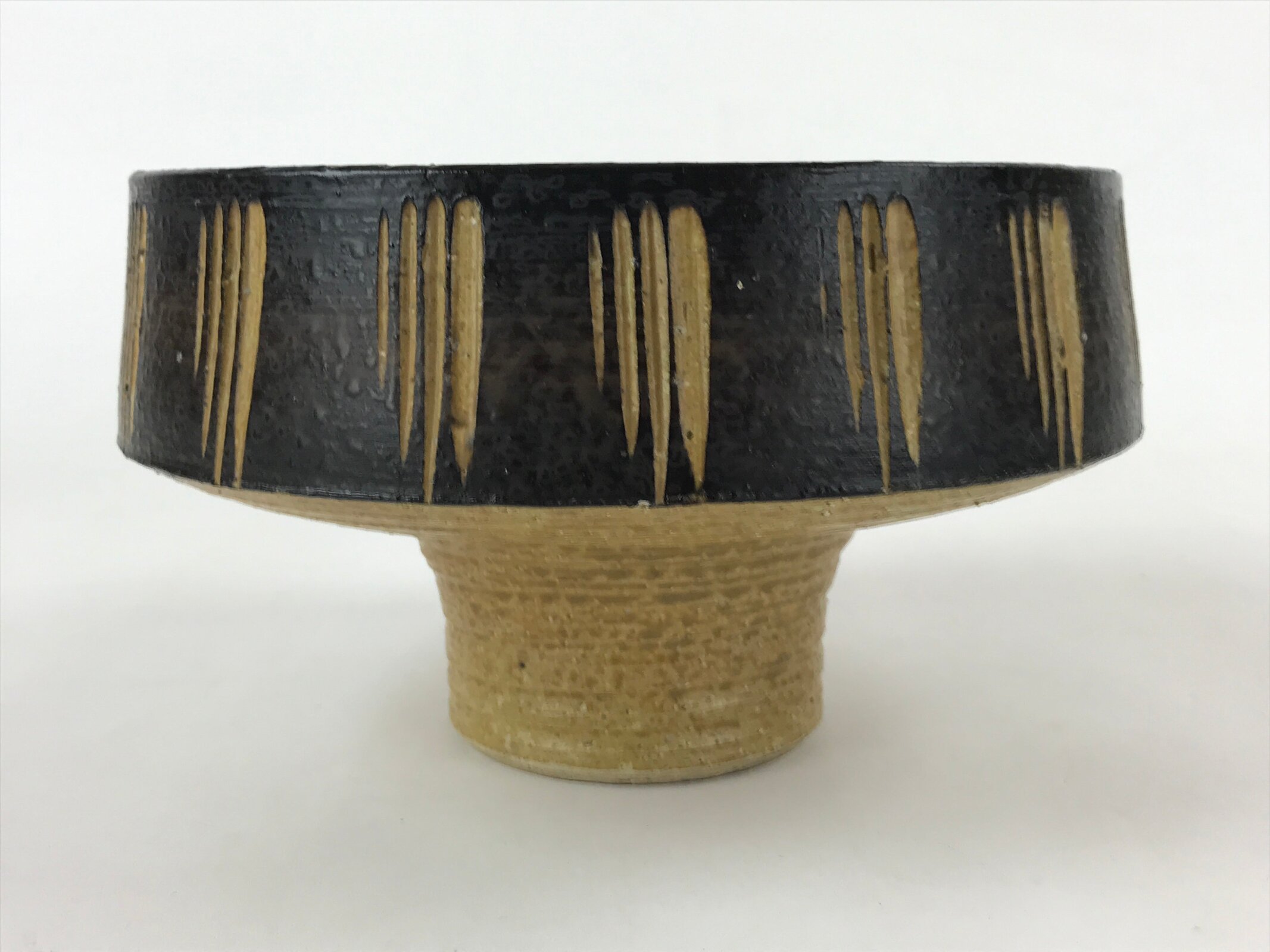 This is a vintage ceramic Japanese flower vase, or suiban. It is glazed a textured black and light brown with a line pattern on the outside edge. This suiban is round and stands tall via sculpted platform.