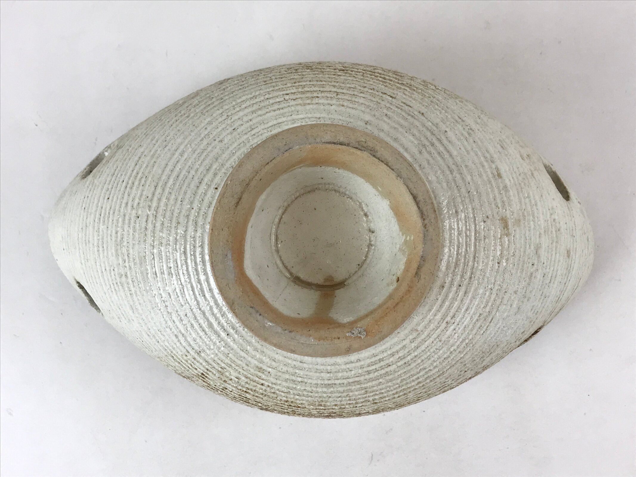 This is a vintage ceramic Japanese flower vase, or suiban. It is glazed a textured beige with brown accents and an oval shape with cut out holes. It stands tall via a short pedestal.