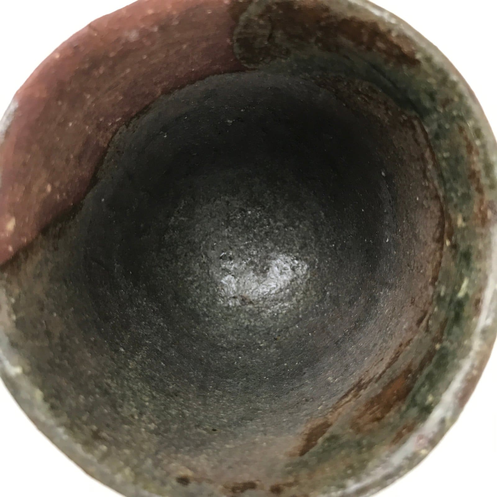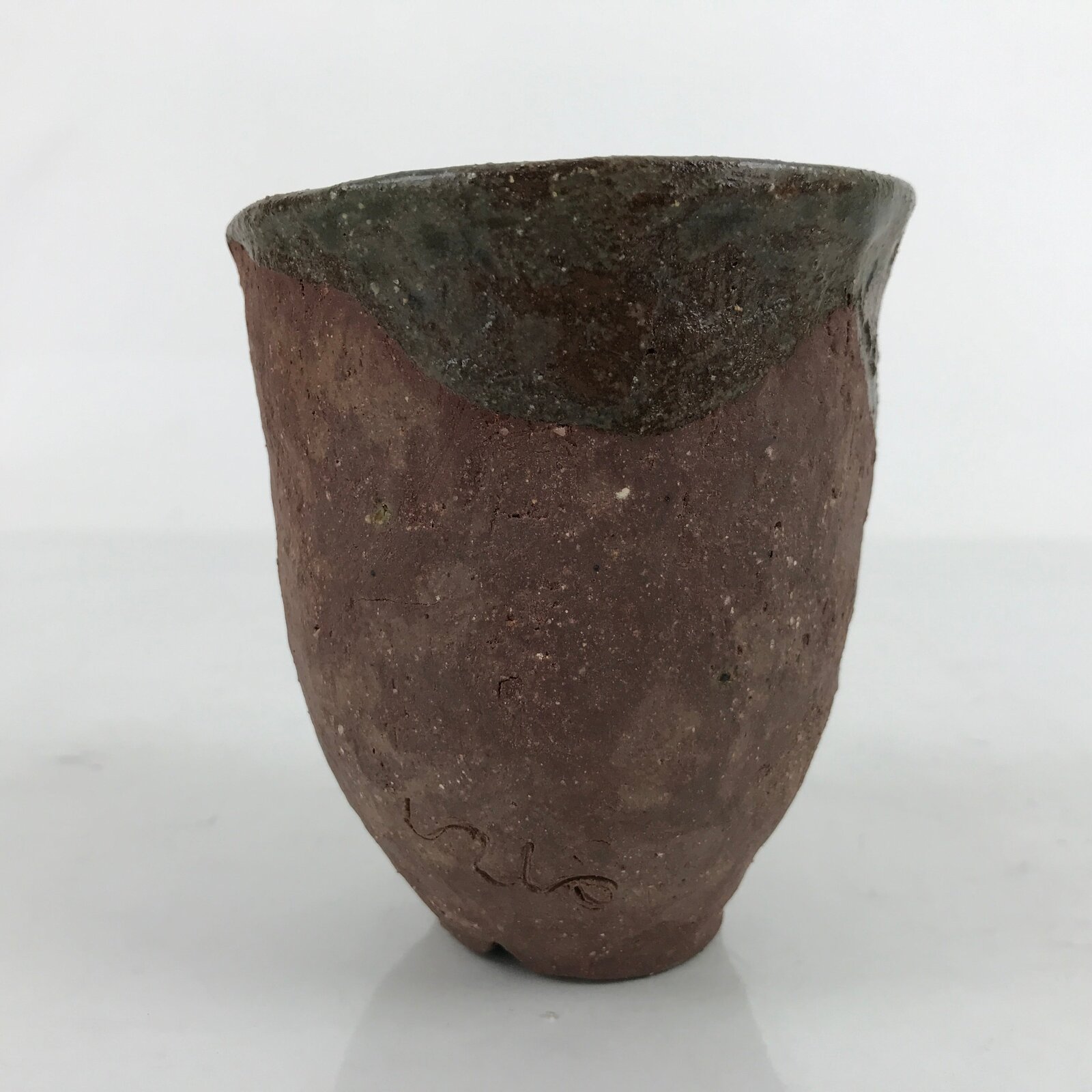 This is a Japanese vintage ceramic tea cup (Yunomi). The teacup is an unglazed textured dark brown color with a deep gray glaze covering the inside. There is a rustic charm to this piece as it was handmade. There is a signature carved into the side. This cup is for serving sencha (steeped loose leaf tea). This cup is the larger of a set of two (traditionally the men’s cup in a set).