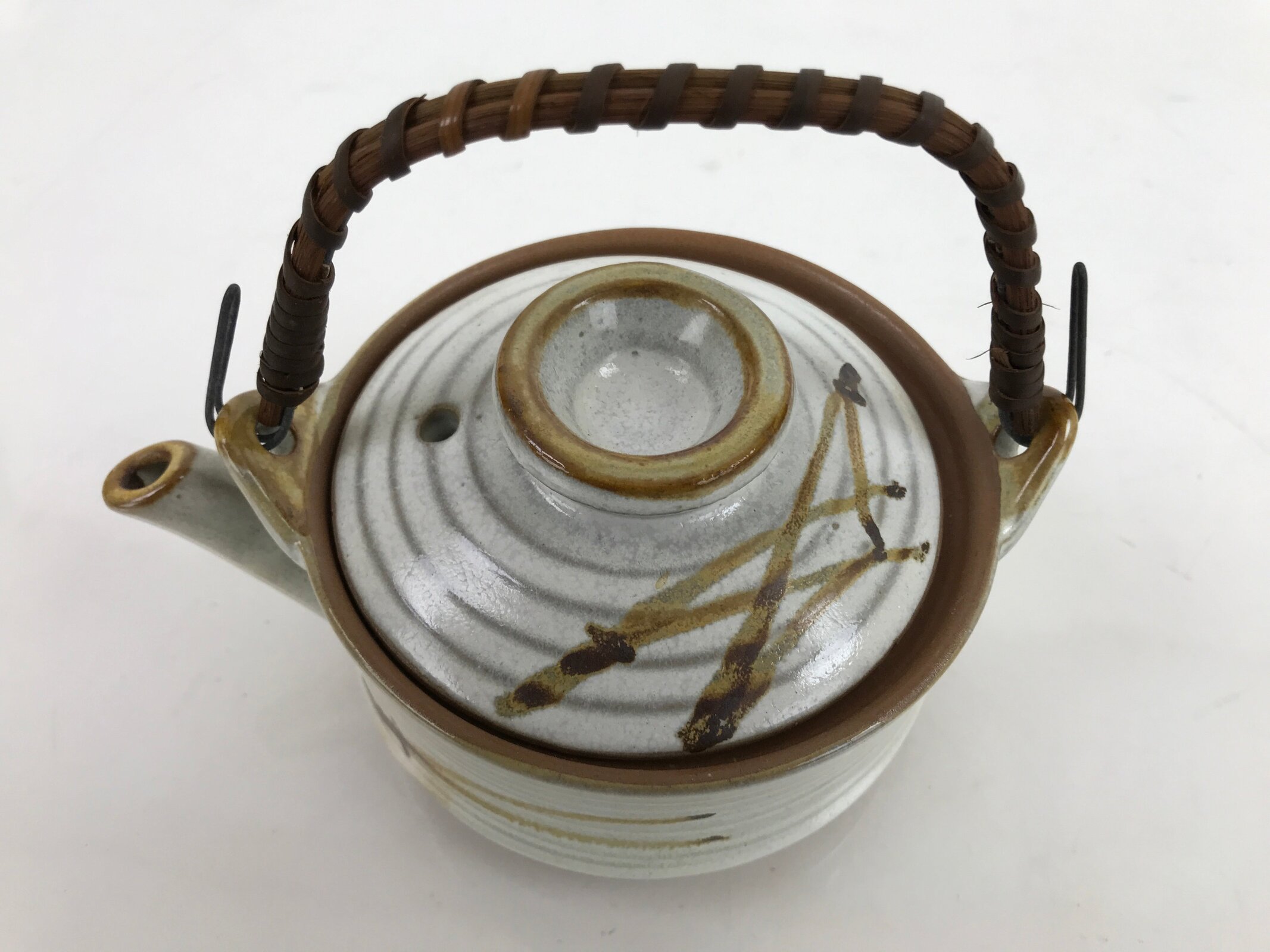 This is a small vintage Japanese ceramic teapot/kettle, or kyusu. It is glazed white with brown rings, and it features a pine needle design on the lid and on the side. It has a wound reed handle with a metal wire base. The handle is removable. This pot can also be used to serve sake.