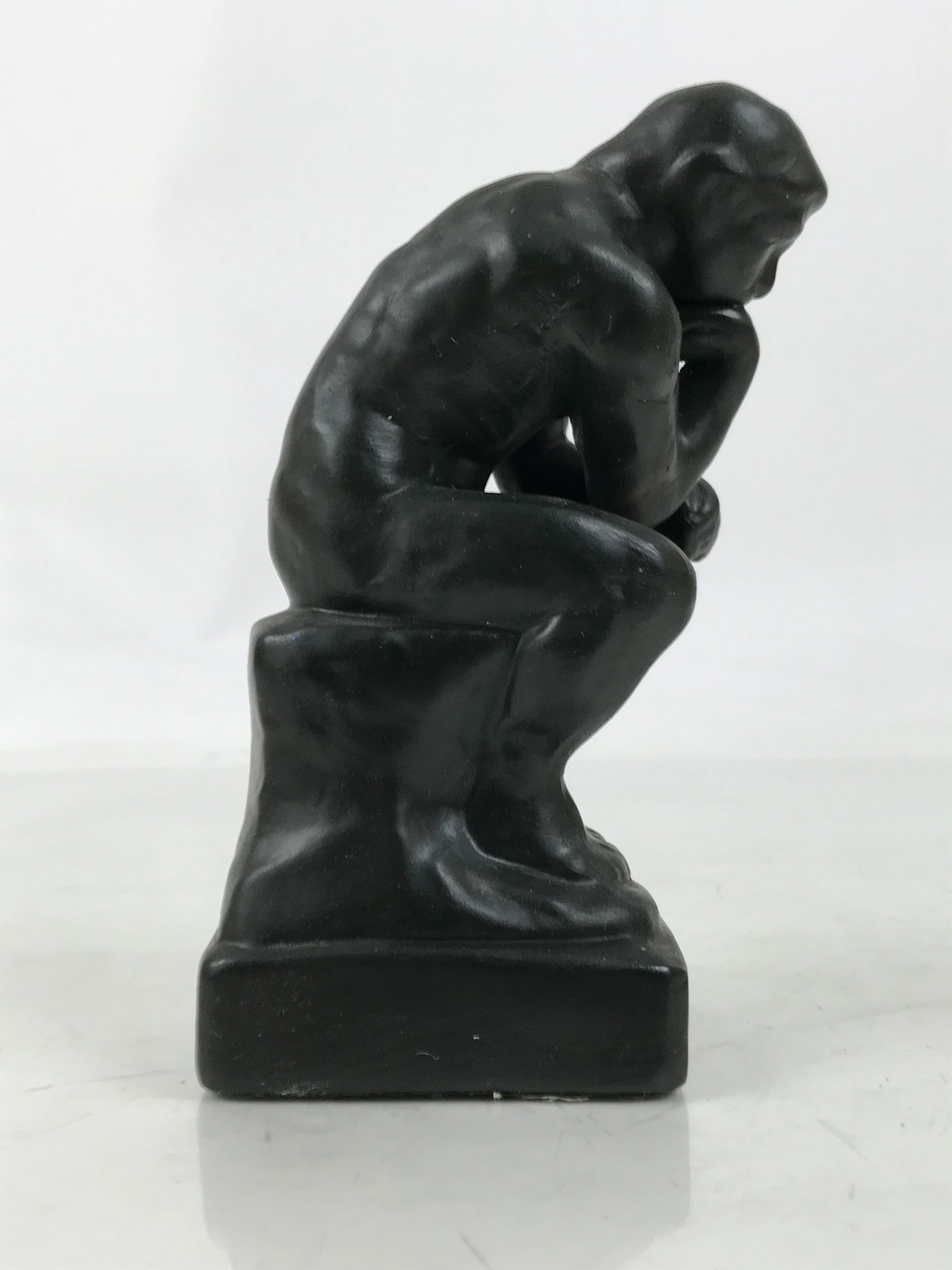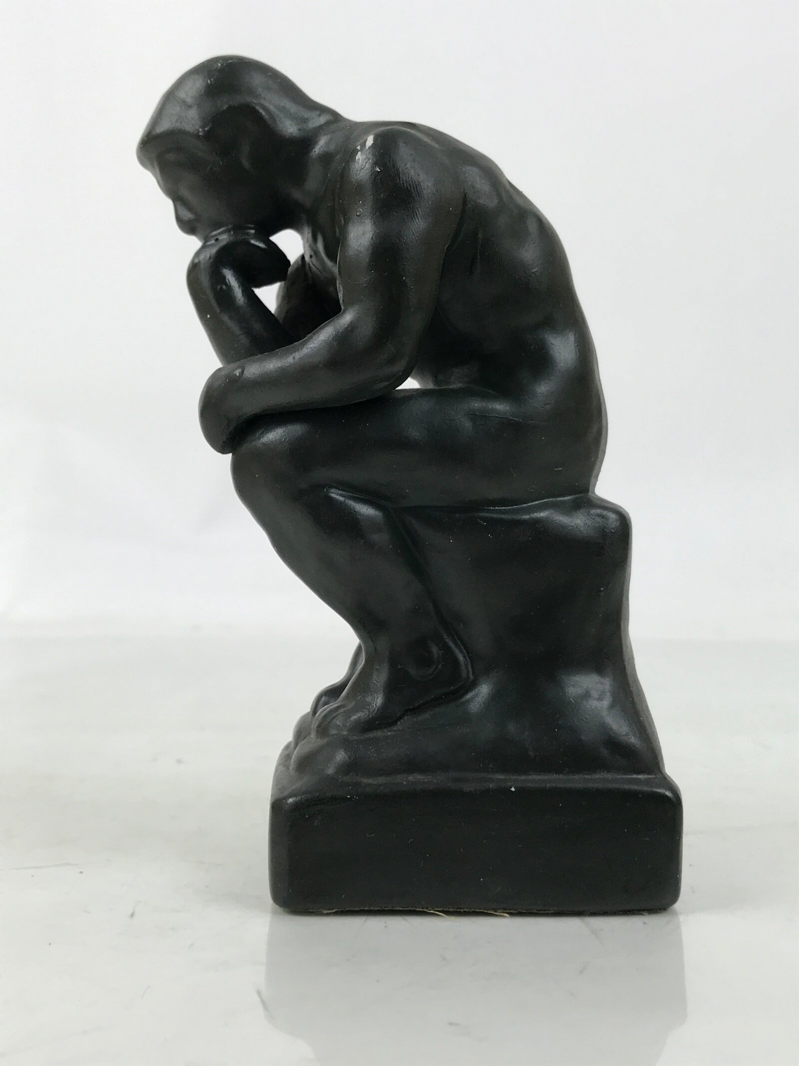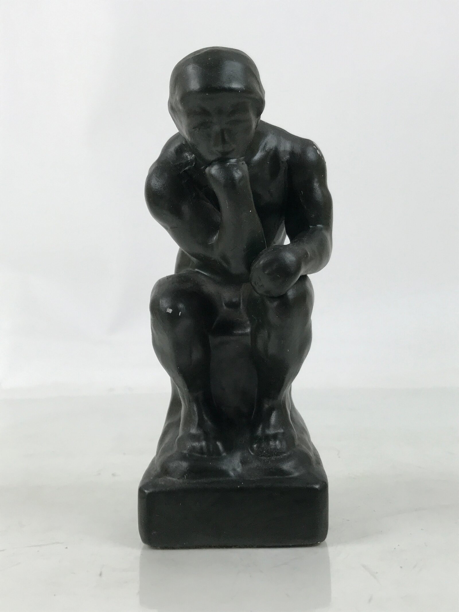 This is a vintage Japanese ceramic rendition of The Thinker sculpture by Auguste Rodin. Much like other famous sculptures throughout history, this particular piece was used as a model for teaching drawing/sketching various angles of human bodies to art students. It is all black to mimic the look of the original bronze sculpture and has a blue felt pad on the bottom to protect surfaces from scratching.