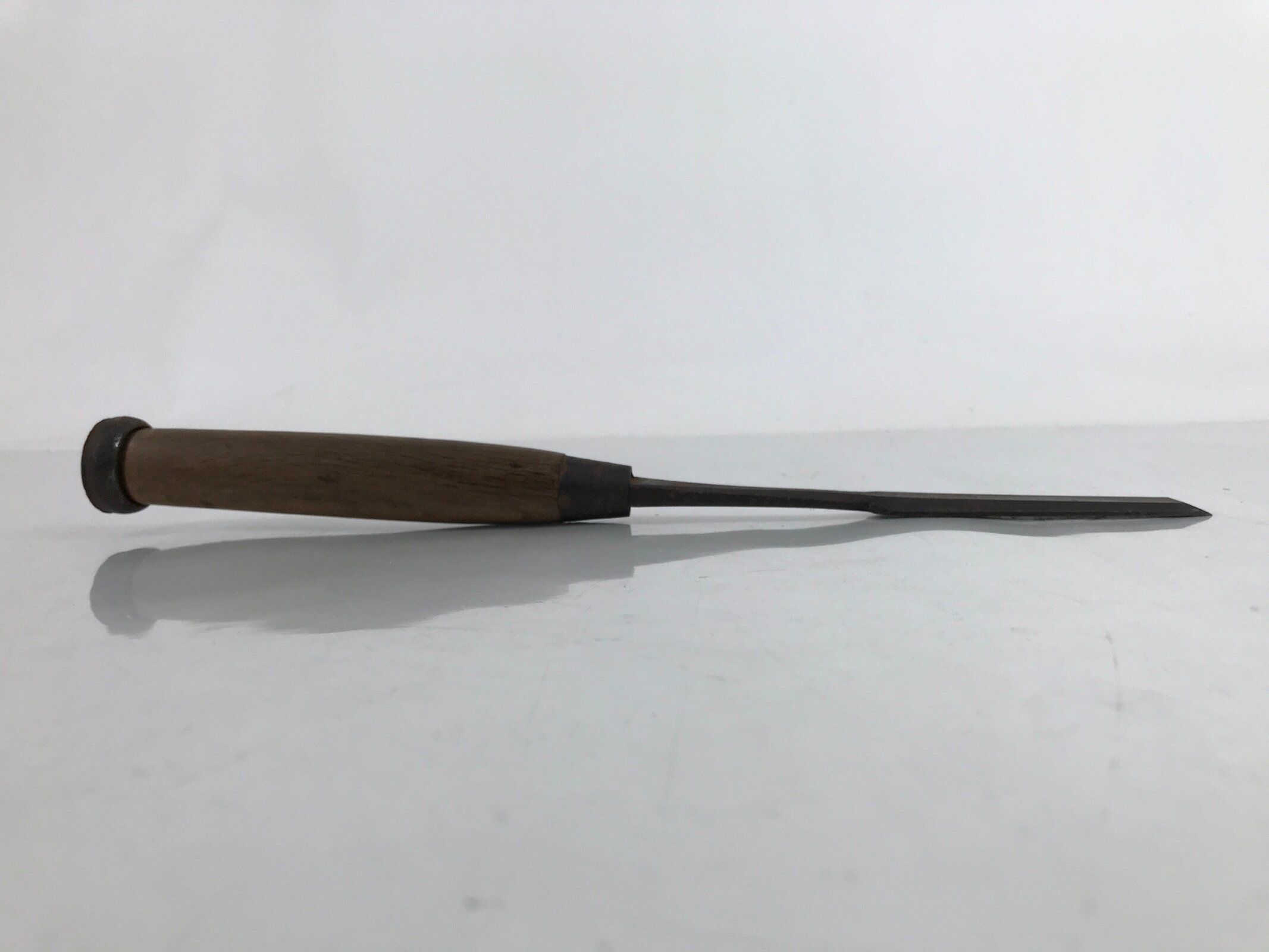 This vintage Japanese nomi, or chisel, is a traditional carpenter tool for woodworking. It has a metal ring on the handle to prevent cracks when hitting with a hammer. It has some inscriptions on the front of the blade.