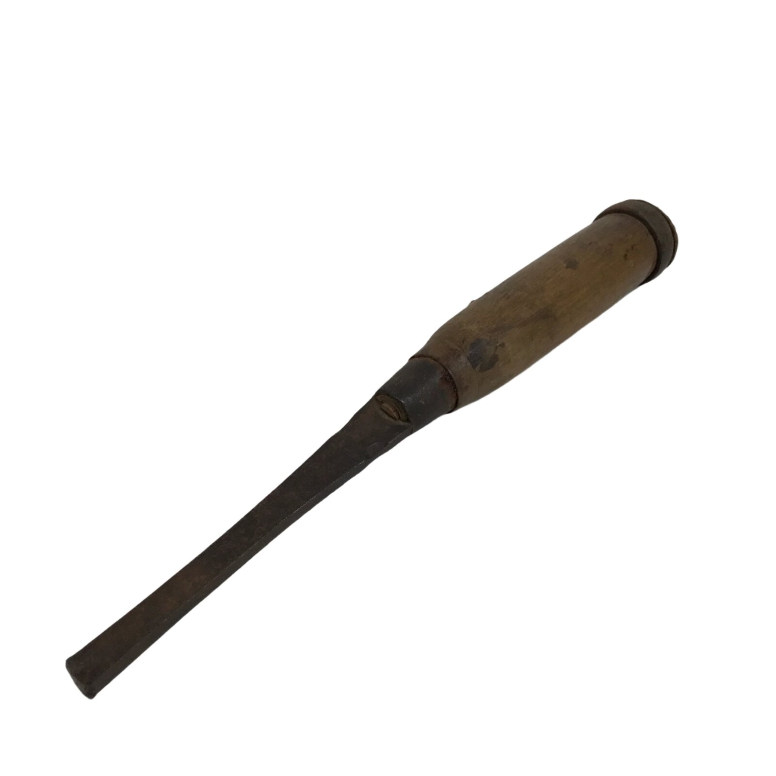 This vintage Japanese nomi, or chisel, is a traditional carpenter tool for woodworking. It has a metal ring on the handle to prevent cracks when hitting with a hammer. The end of the blade is flat and rectangular. Please note that it has some irregularities.
