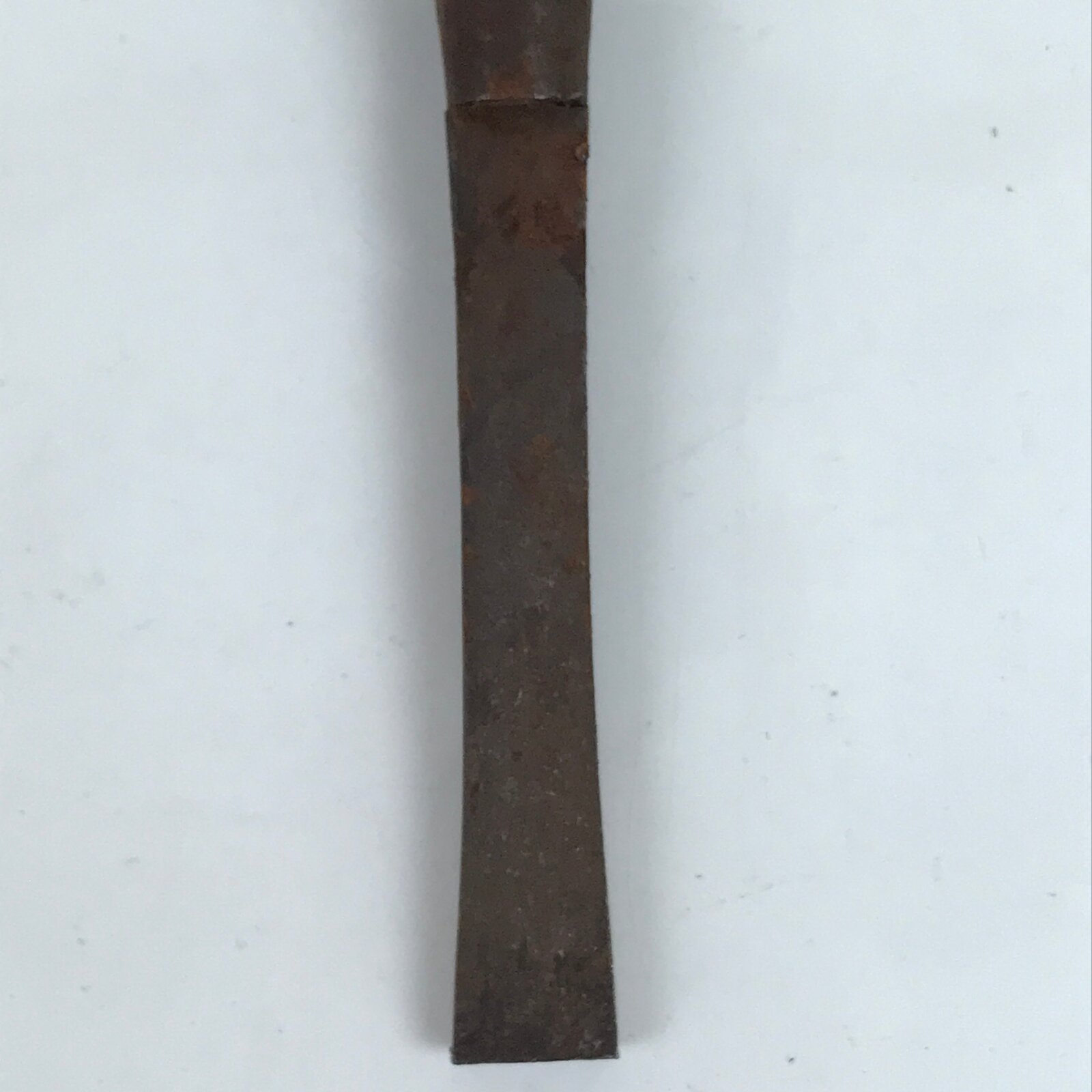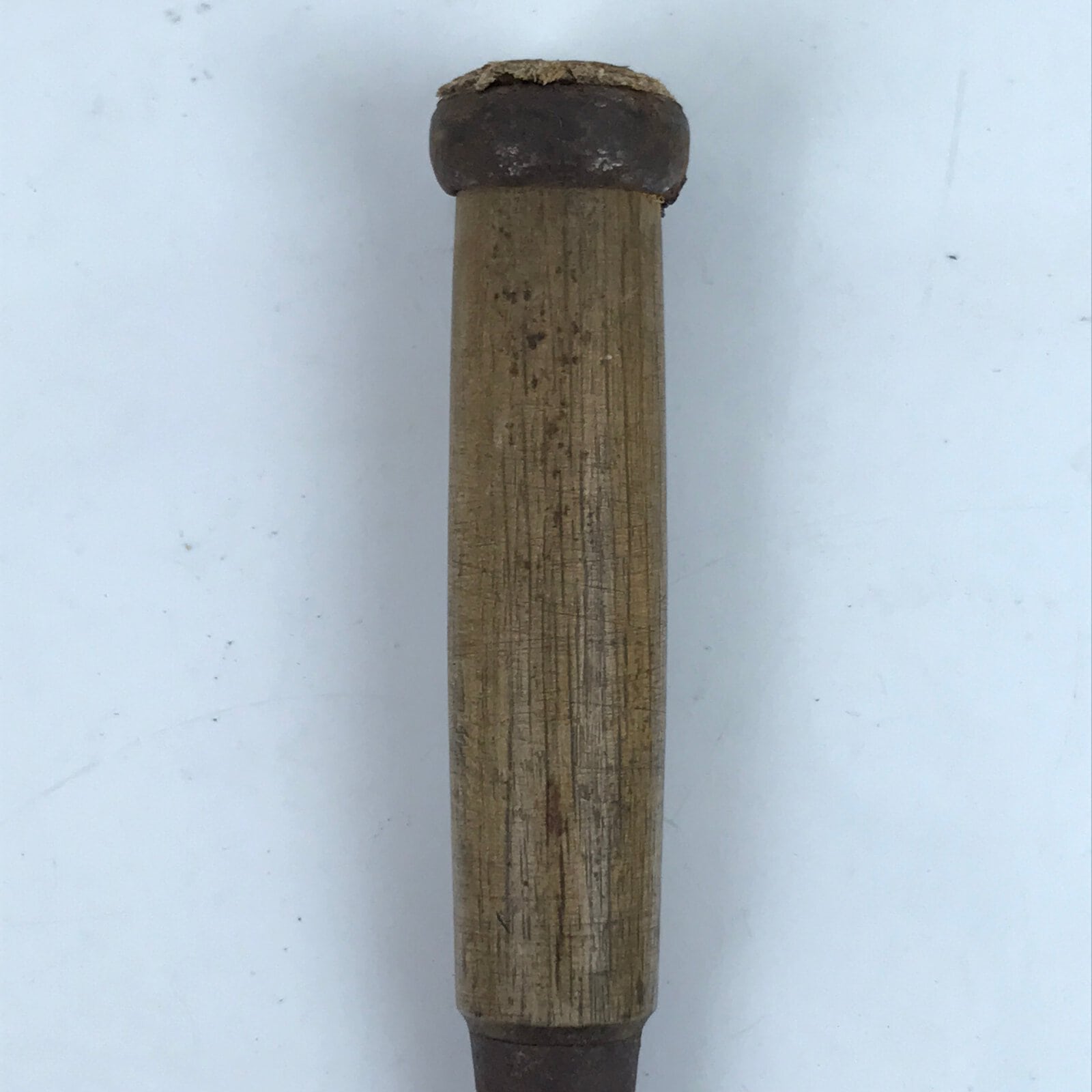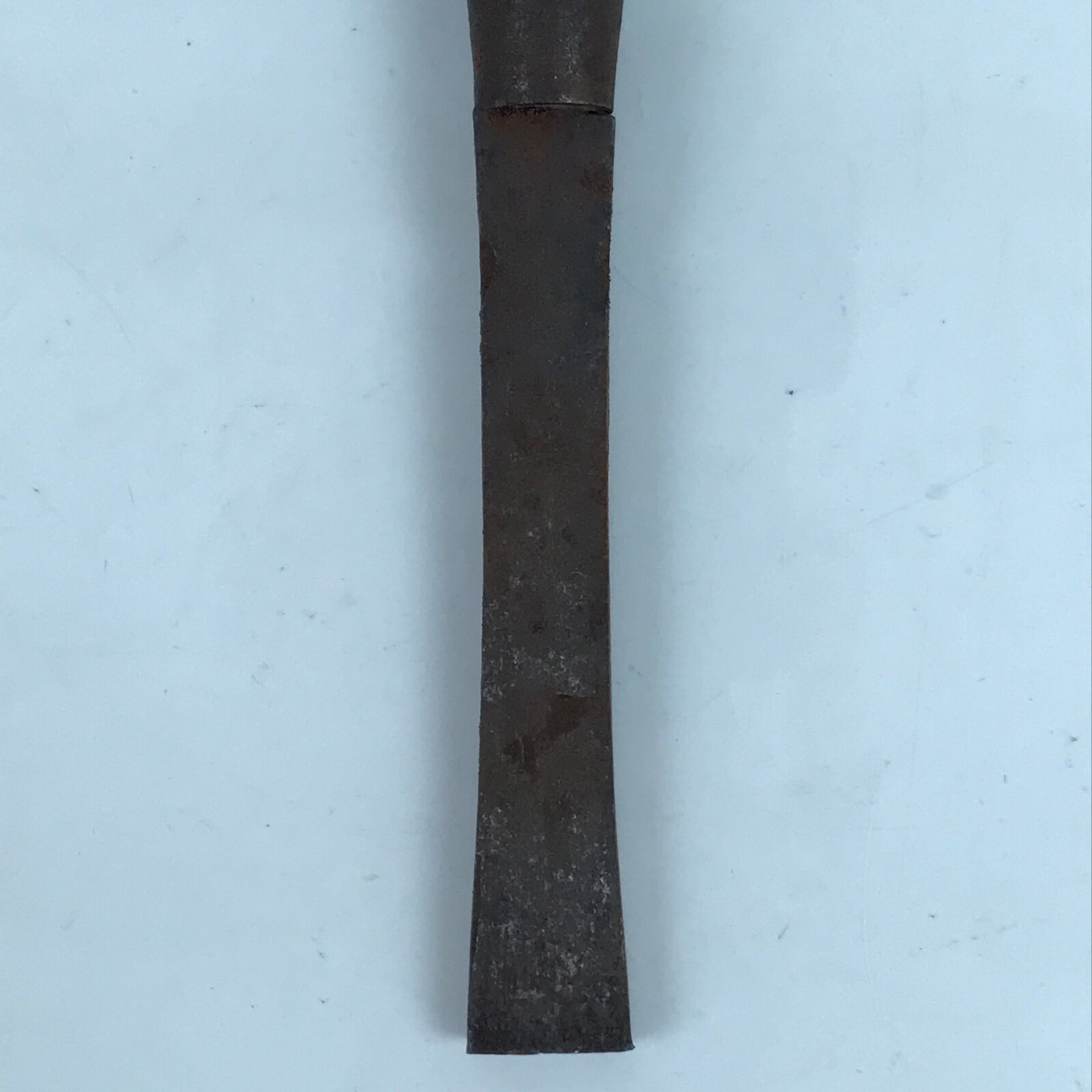 This vintage Japanese nomi, or chisel, is a traditional carpenter tool for woodworking. It has a metal ring on the handle to prevent cracks when hitting with a hammer. This tool has a flat and wide end.