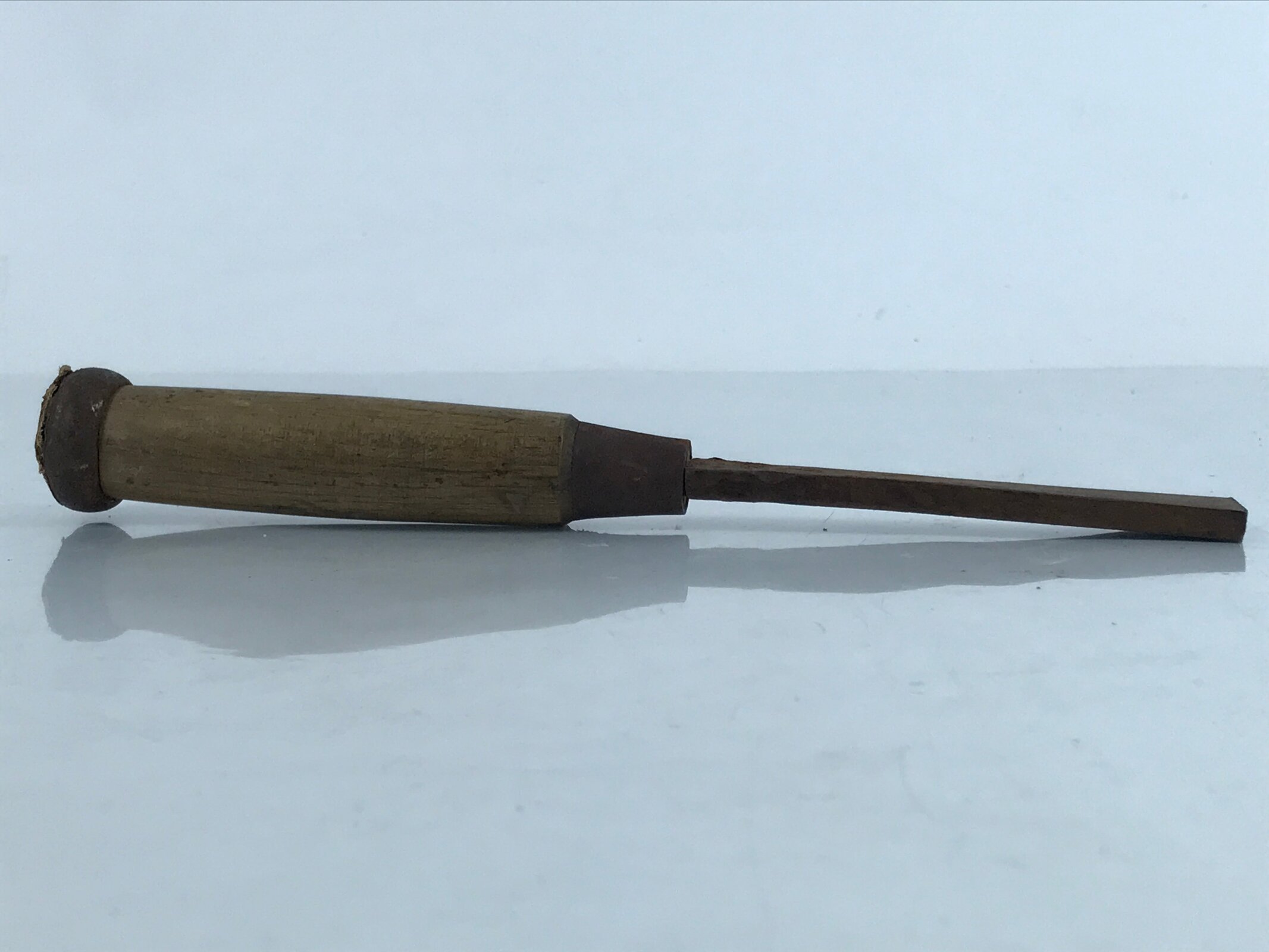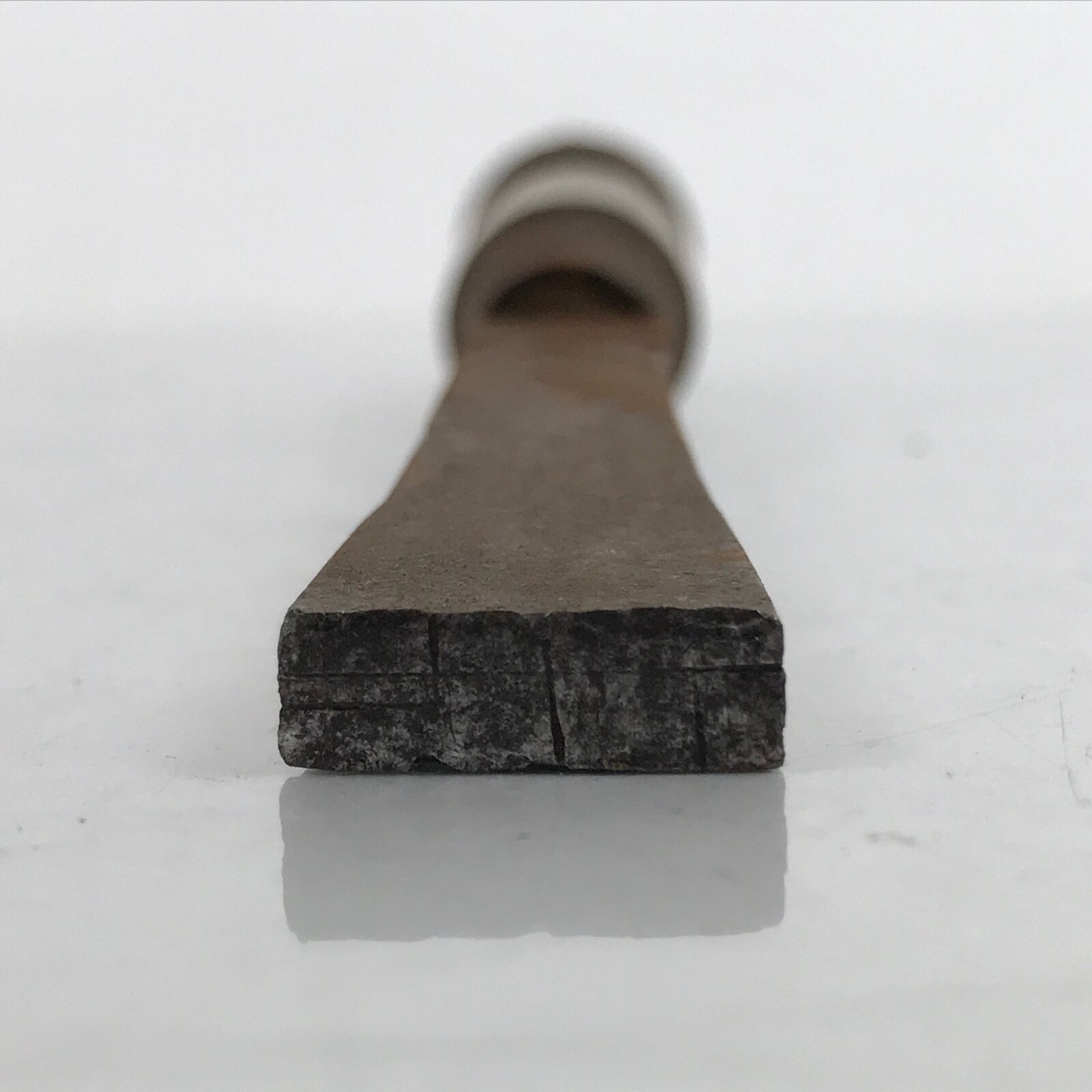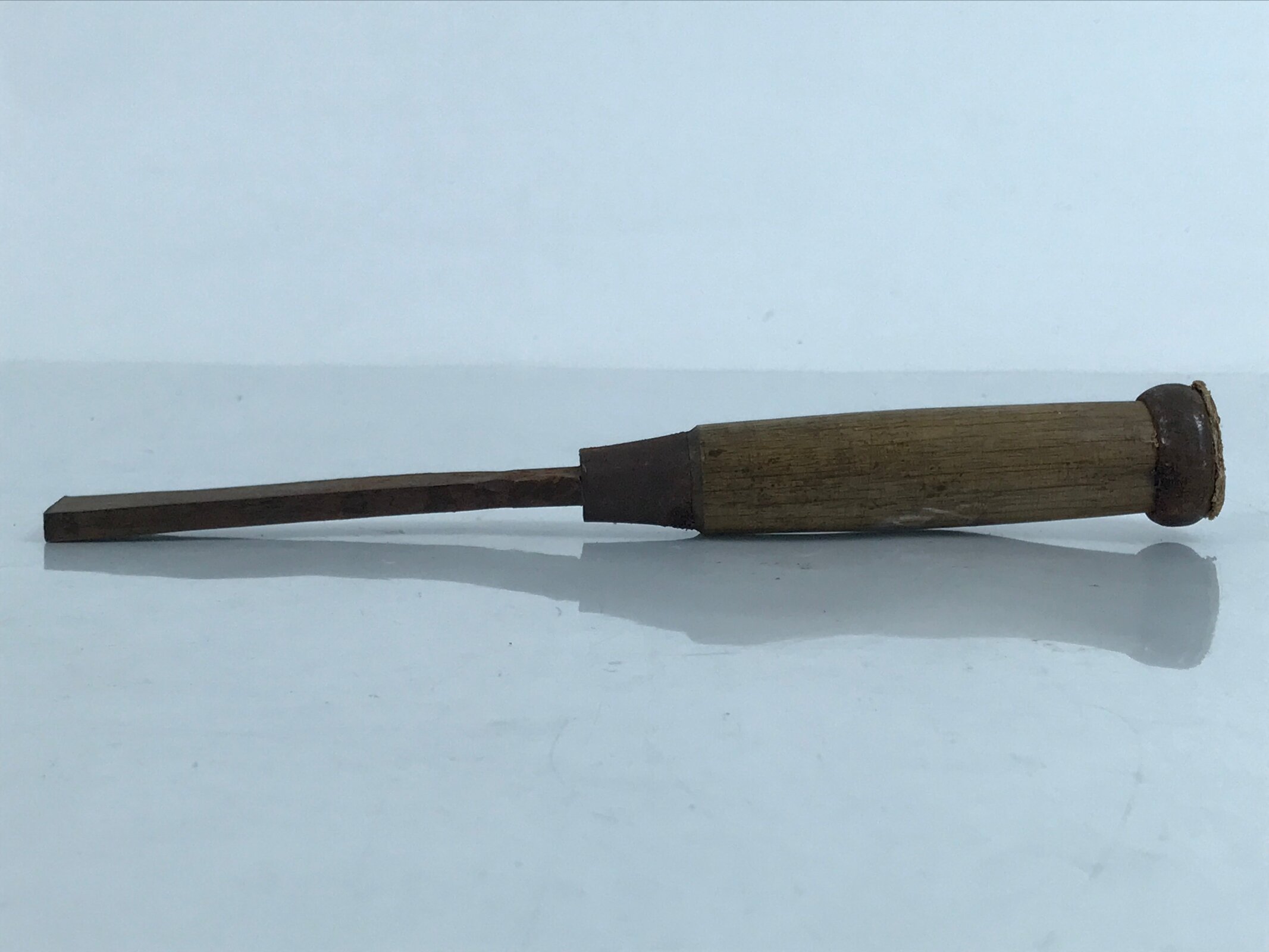 This vintage Japanese nomi, or chisel, is a traditional carpenter tool for woodworking. It has a metal ring on the handle to prevent cracks when hitting with a hammer. This tool has a flat and wide end.