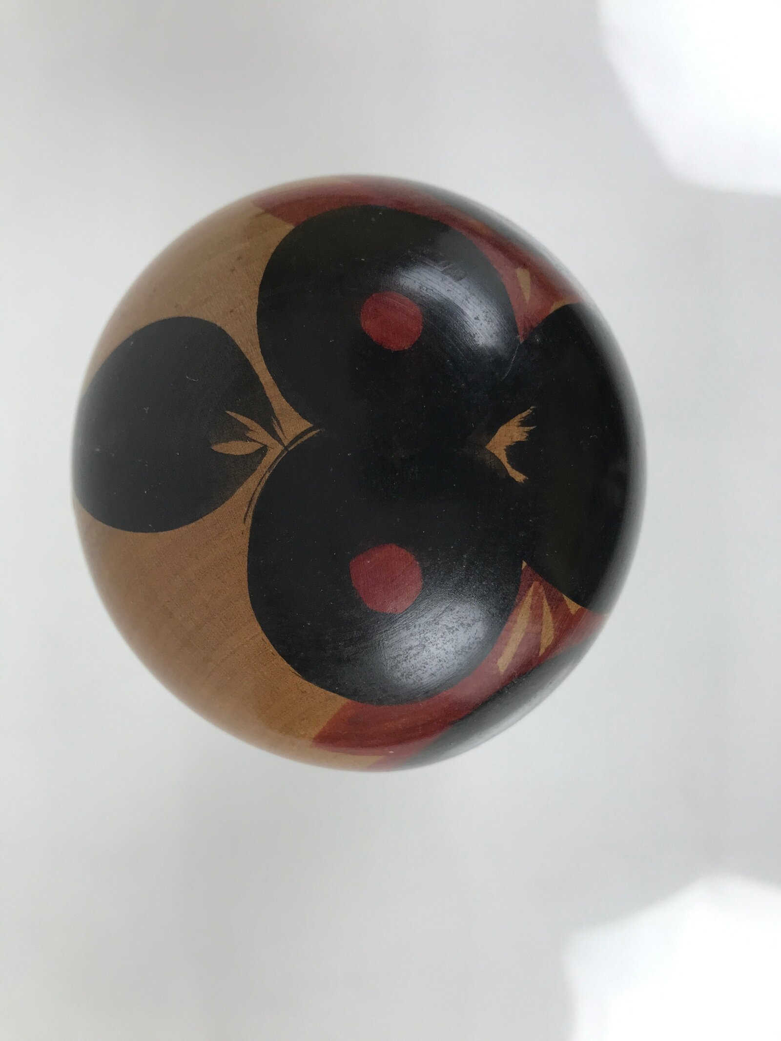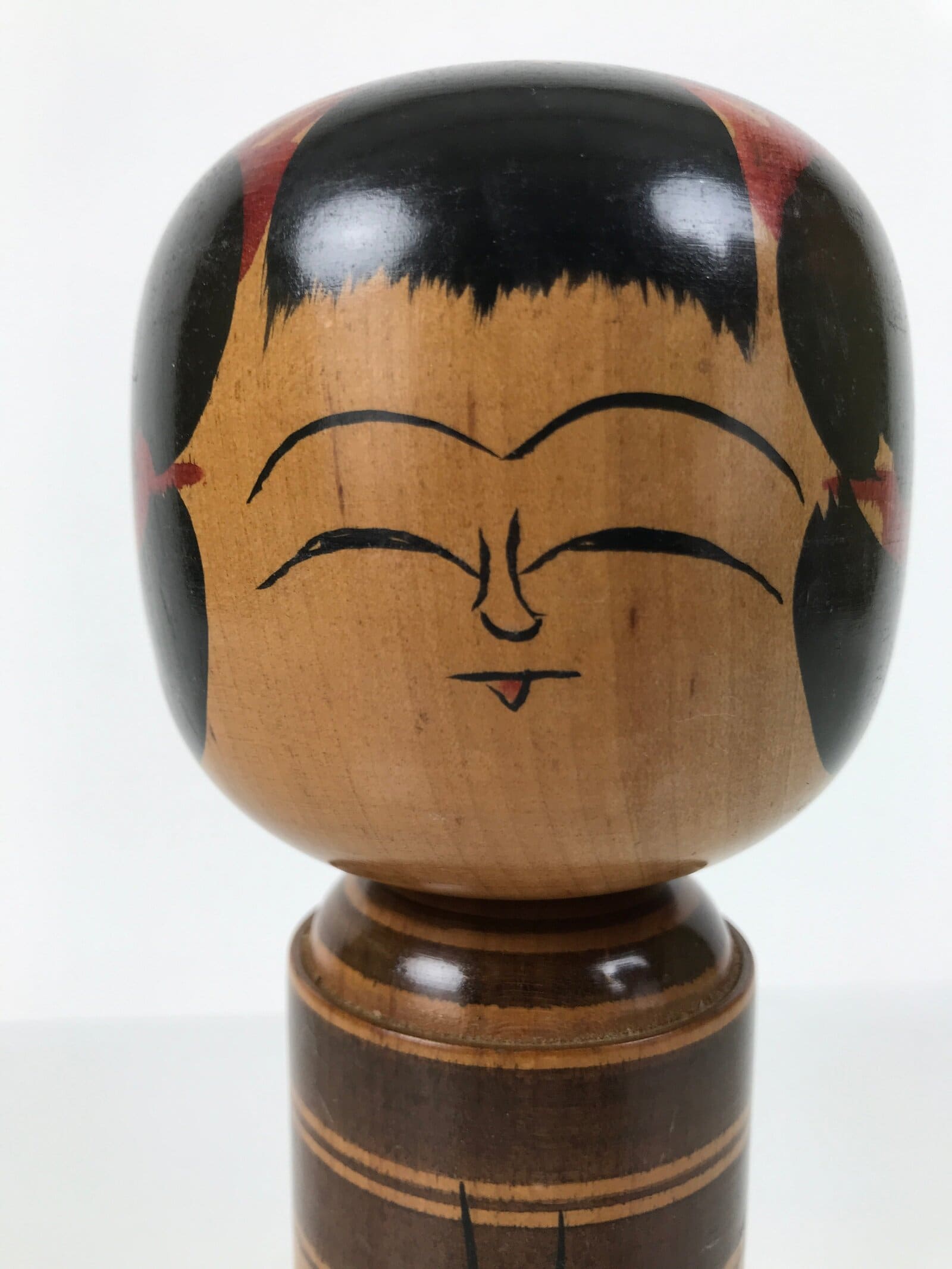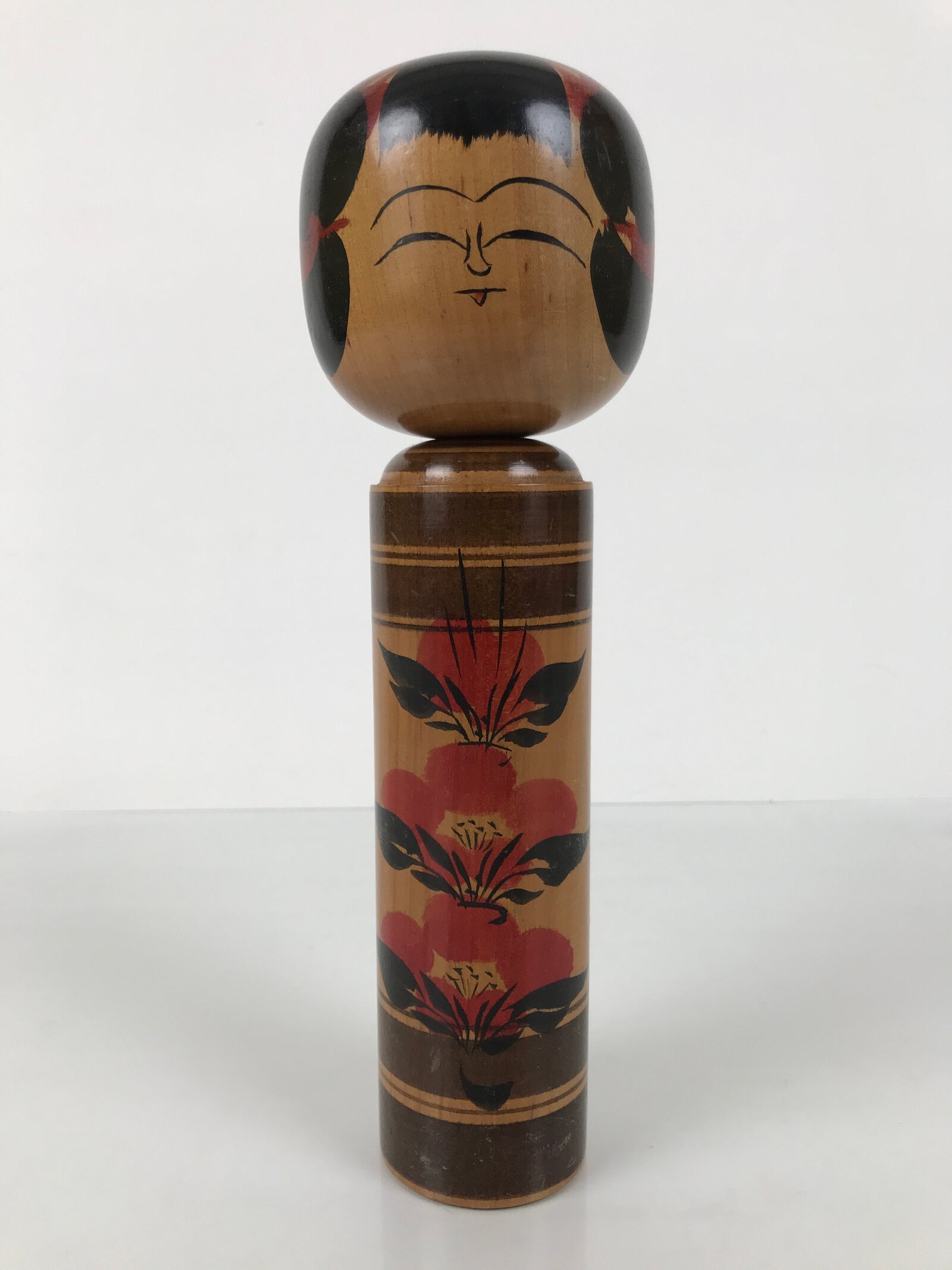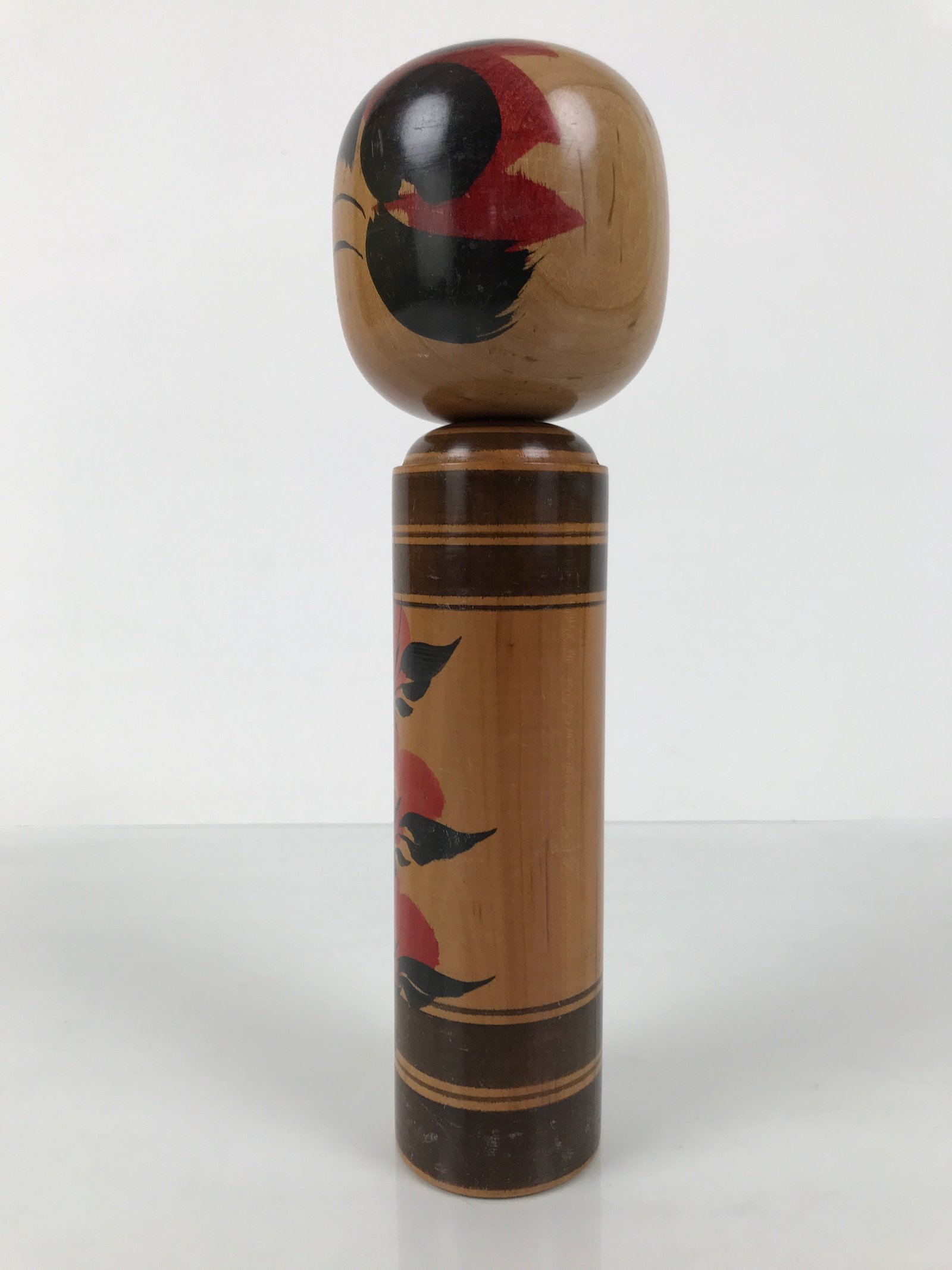 This vintage Japanese wooden kokeshi doll has a classic design (round head, cylindrical body). The body is straight, and it is painted with black line bands and what appear to be red plum blossoms. The facial expression is youthful and mischievous, and it is surrounded by tufts of black painted hair and extra red details to match the body. It has been brushed with a clear lacquer coating to give it shine.