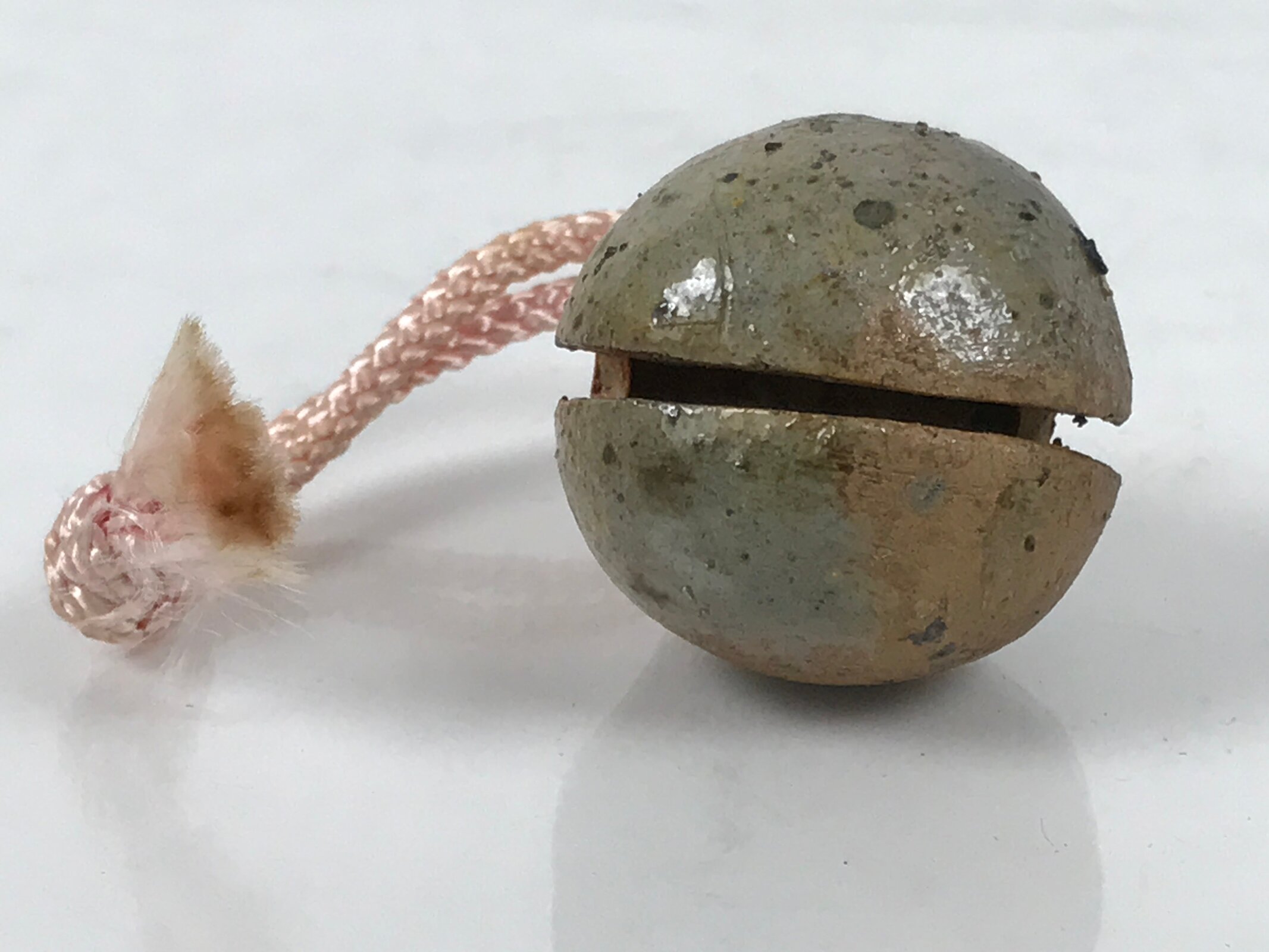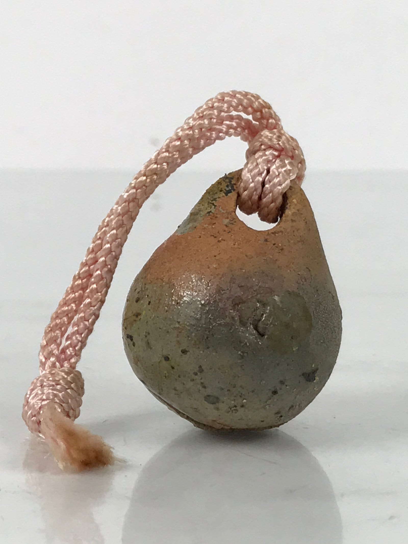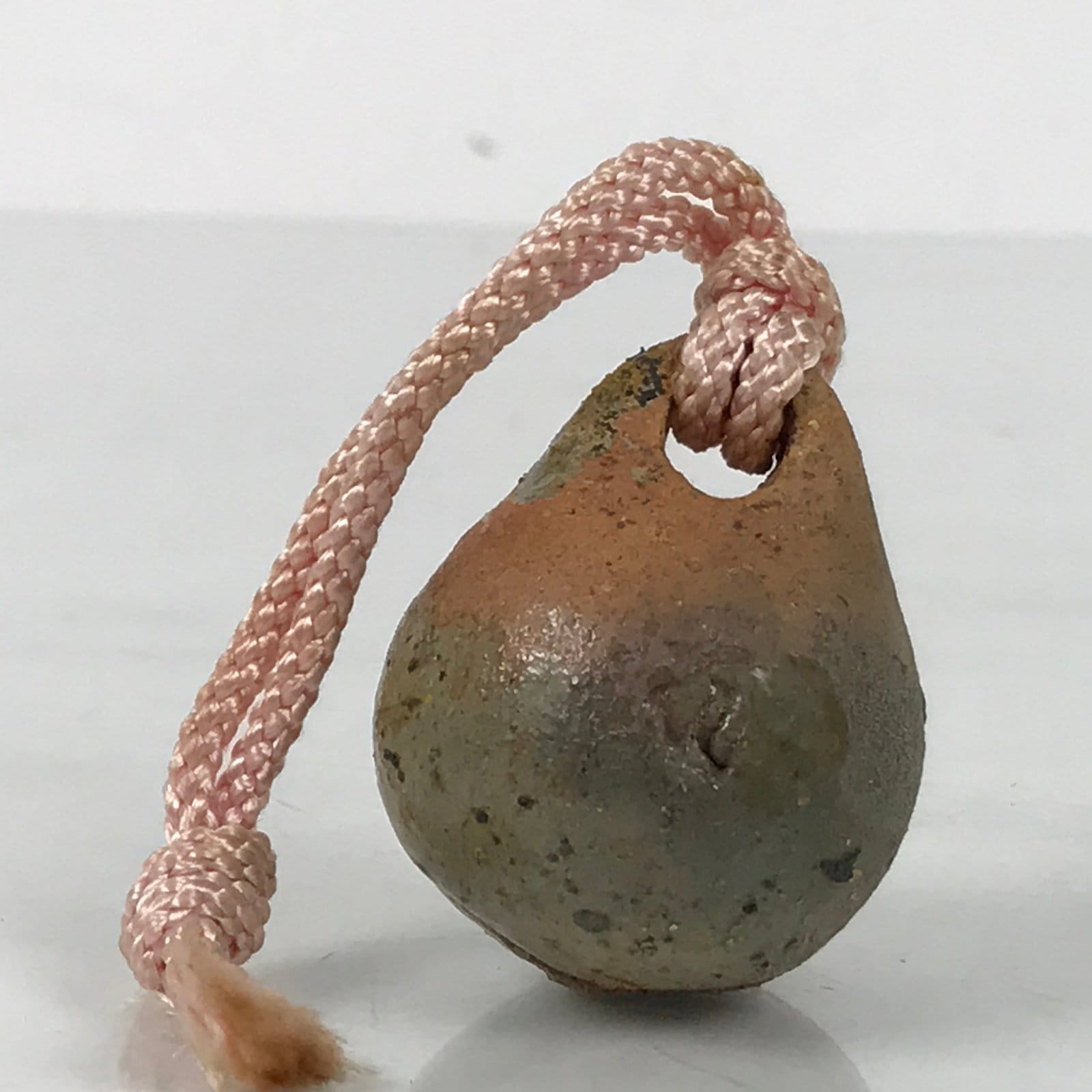 This is a vintage Japanese clay bell, Dorei or Tsuchi-Suzu, in a classic rounded shape. It is a terracotta orange color with a partial light gray glaze. There is a braided pink string a small brown clay ball inside.