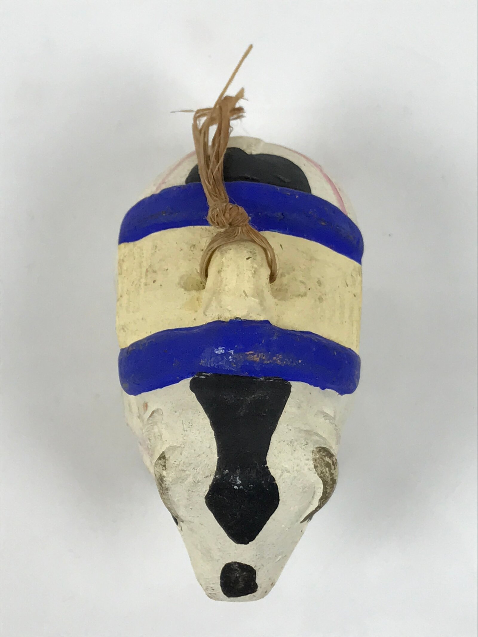 This is a vintage Japanese clay bell, or dorei. Representing the animals of the zodiac, this bell is in the shape of a sitting cow. It is mostly white with a blue and beige pack or blanket on its back. It has a small brown clay ball inside and has a twine string tied at the top via a loop.