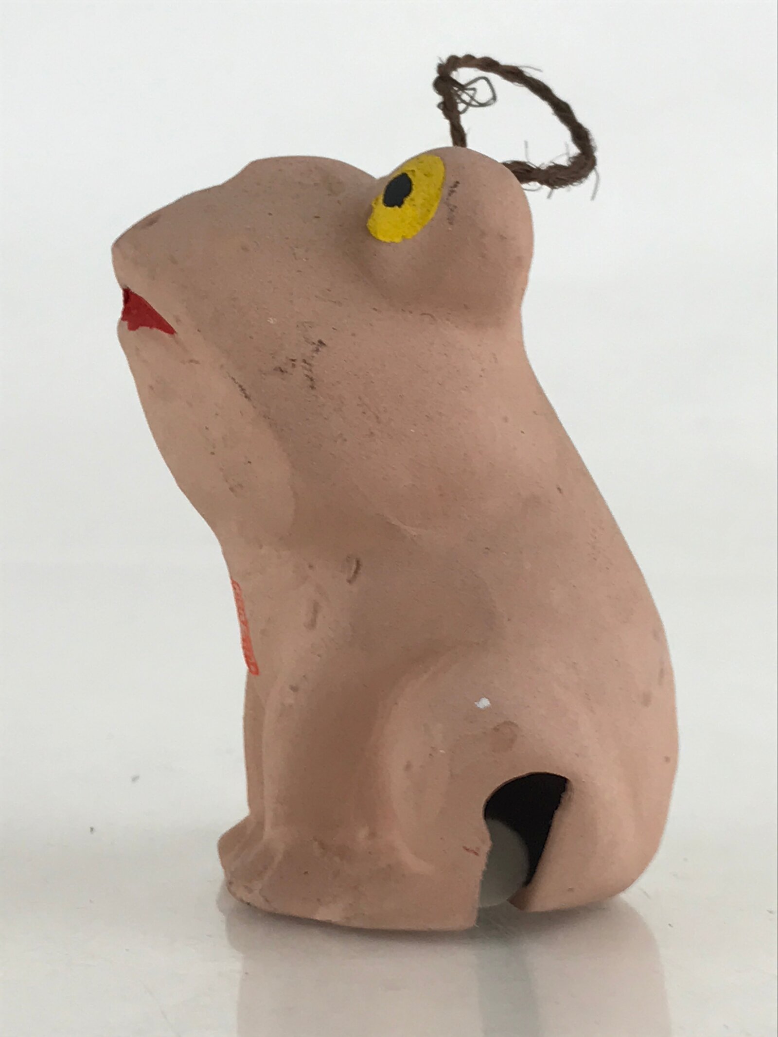 This is a vintage Japanese clay bell, Dorei or Tsuchi-Suzu. It is a folk craft of Hida, Gifu Prefecture, a frog shape Dorei bell. Dorei bells have a long history and have been used in festivals and ceremonies since the Jomon period (about 13000 to 2300 years ago) when they were said to have the power to ward off evil spirits.