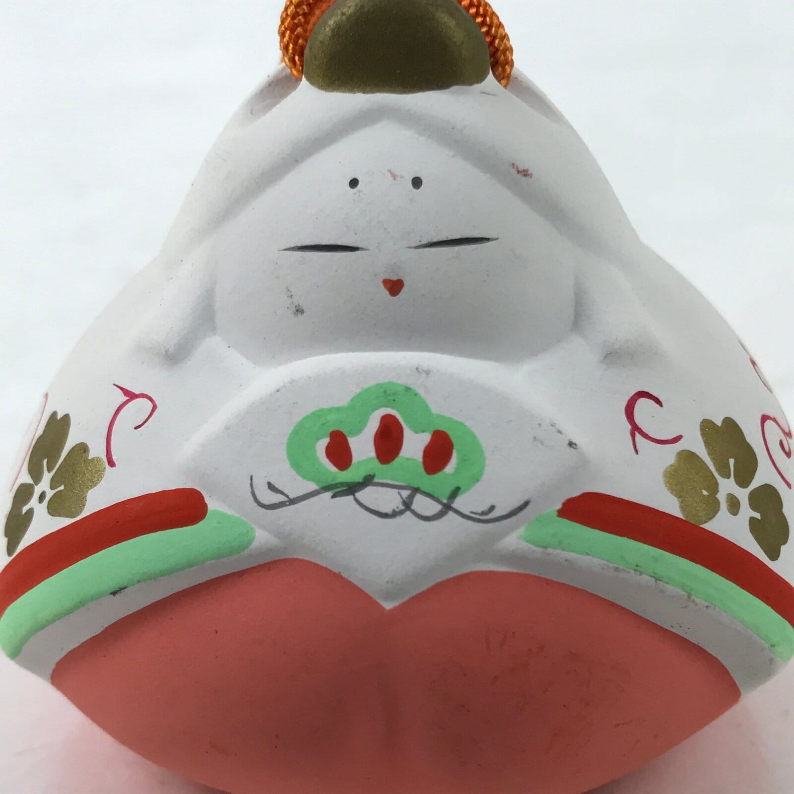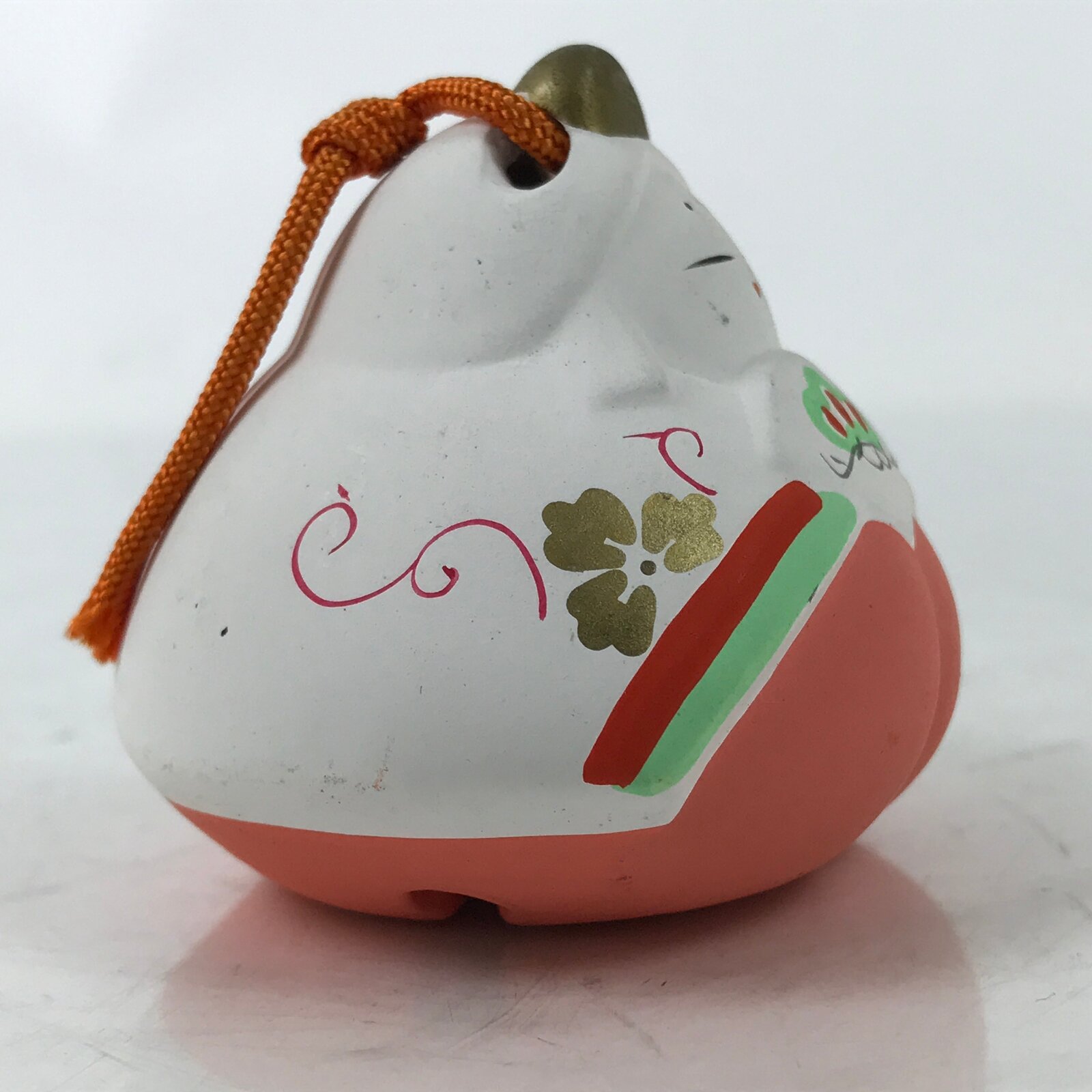 This is a vintage Japanese clay bell, Dorei or Tsuchi-Suzu. It is the bell of the Hina doll for the Hinamatsuri festival. It has a small white clay ball inside and an orange string tied at the top. Dorei bells have a long history and have been used in festivals and ceremonies since the Jomon period (about 13000 to 2300 years ago) when they were said to have the power to ward off evil spirits.