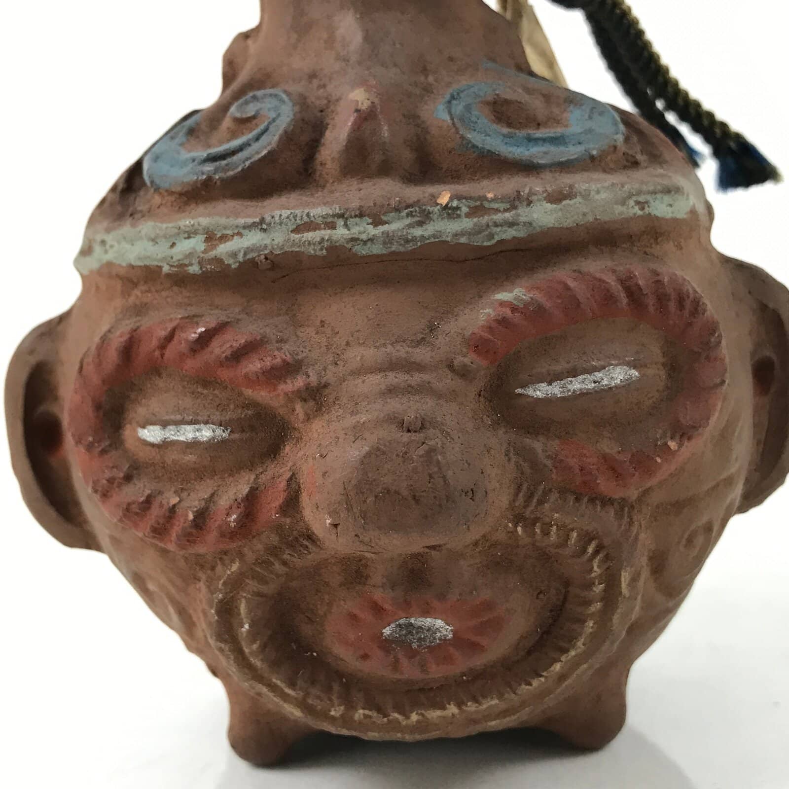 This is a vintage Japanese clay bell or dorei. It is brown. It features a head of Dogu. It has a brown clay ball inside and a brown cord tied at the top.