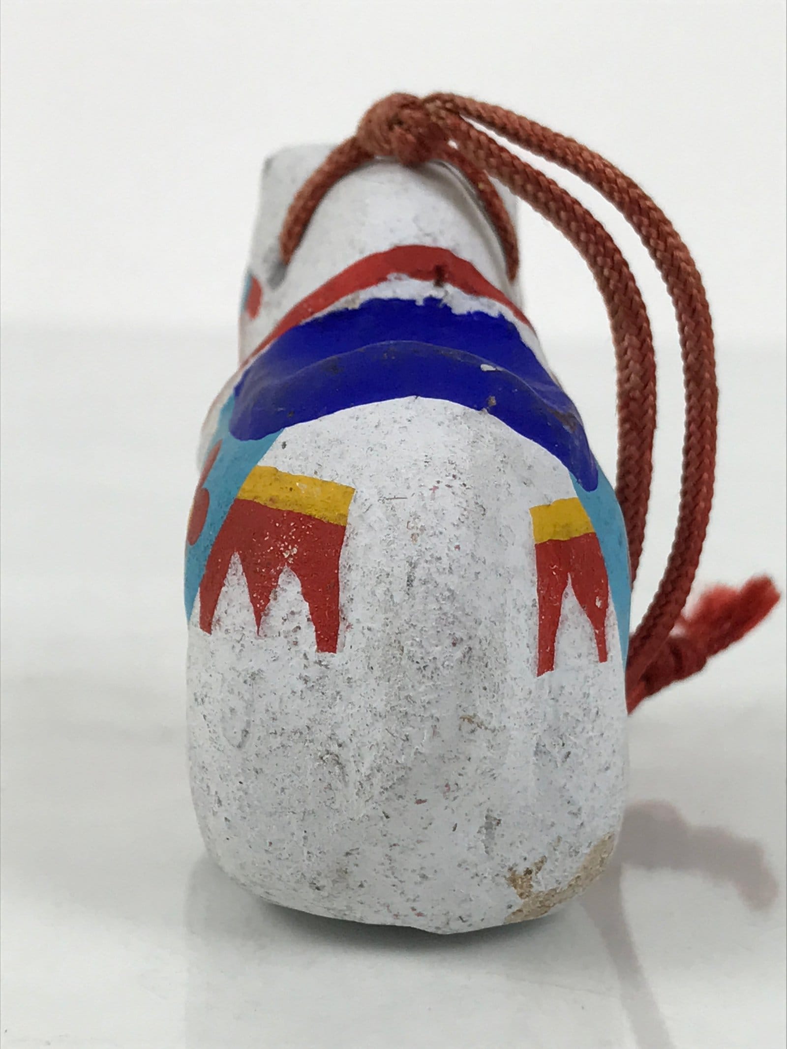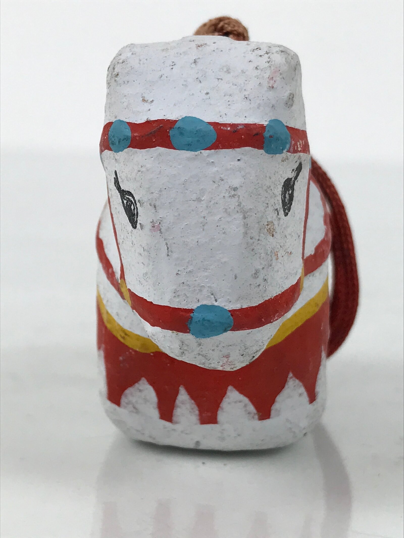 This is a vintage Japanese clay bell, or dorei. Representing the animals of the zodiac, this bell is in the shape of a horse. It is mostly white with handpainted reins and saddle in red, blue, and yellow. It has a small brown clay ball inside and has a faded red cord tied at the top via a loop.