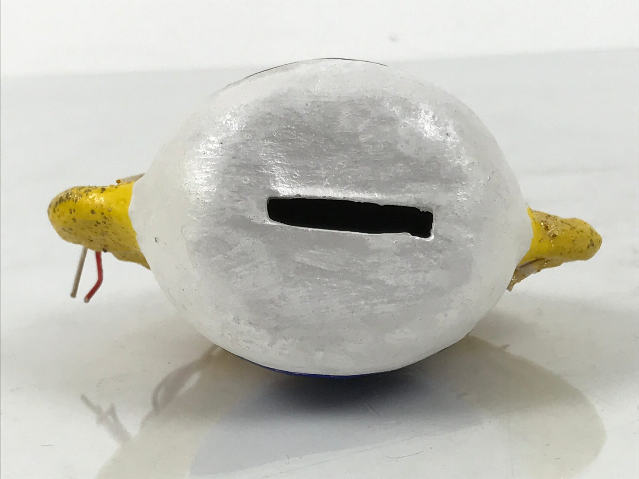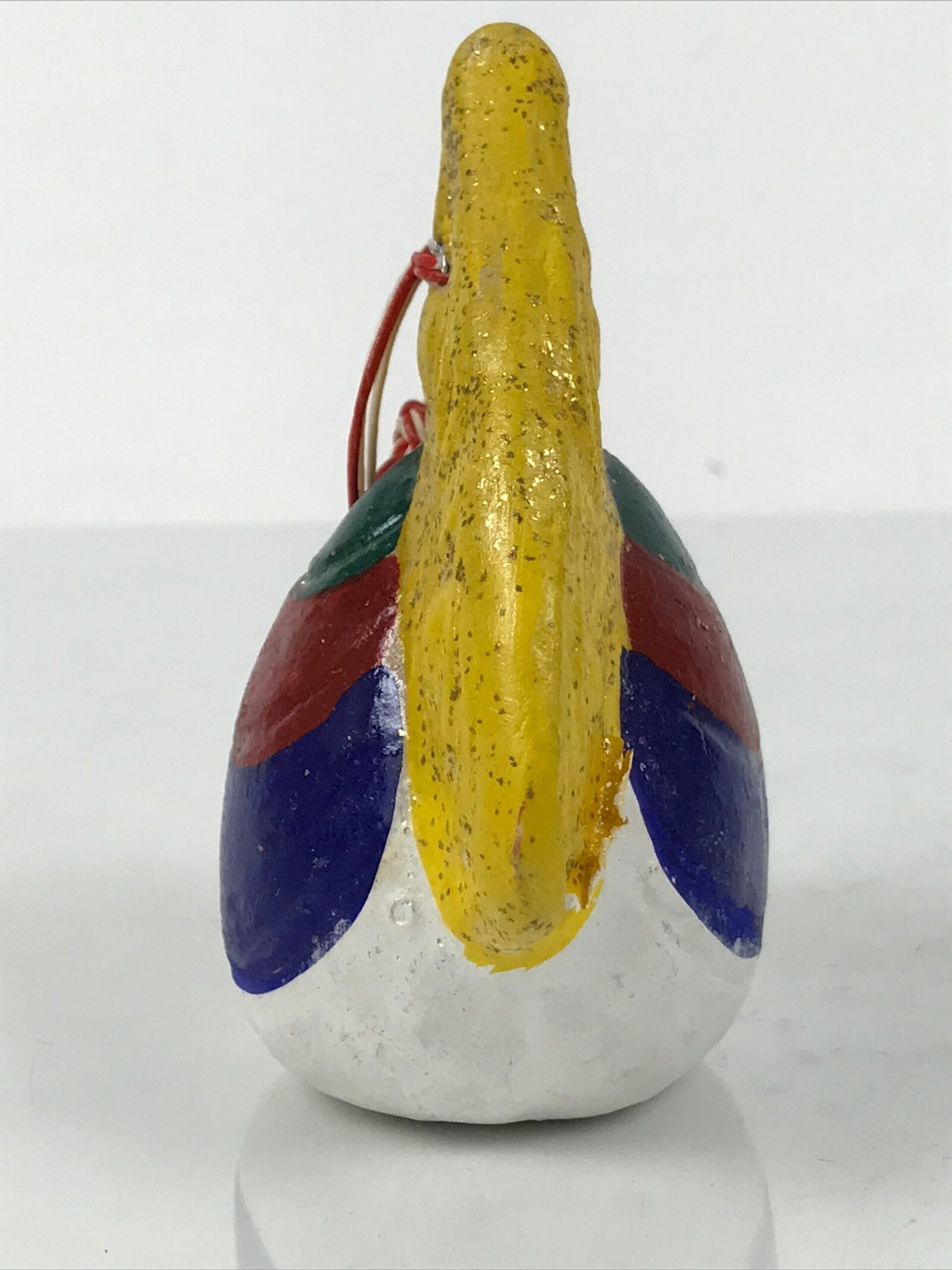 This is a vintage Japanese clay bell, Dorei or Tsuchi-Suzu. This dorei is in the shape of a houshu no tama, a pear-like emblem with small flames, a common symbolic feature in inari shrines across Japan. This item is carried by fox spirits and said to grant wishes. It is painted yellow, red, green, and blue with gold glitter on the flame section. There is a small brown clay ball inside as well as a red and white string tied at the top.