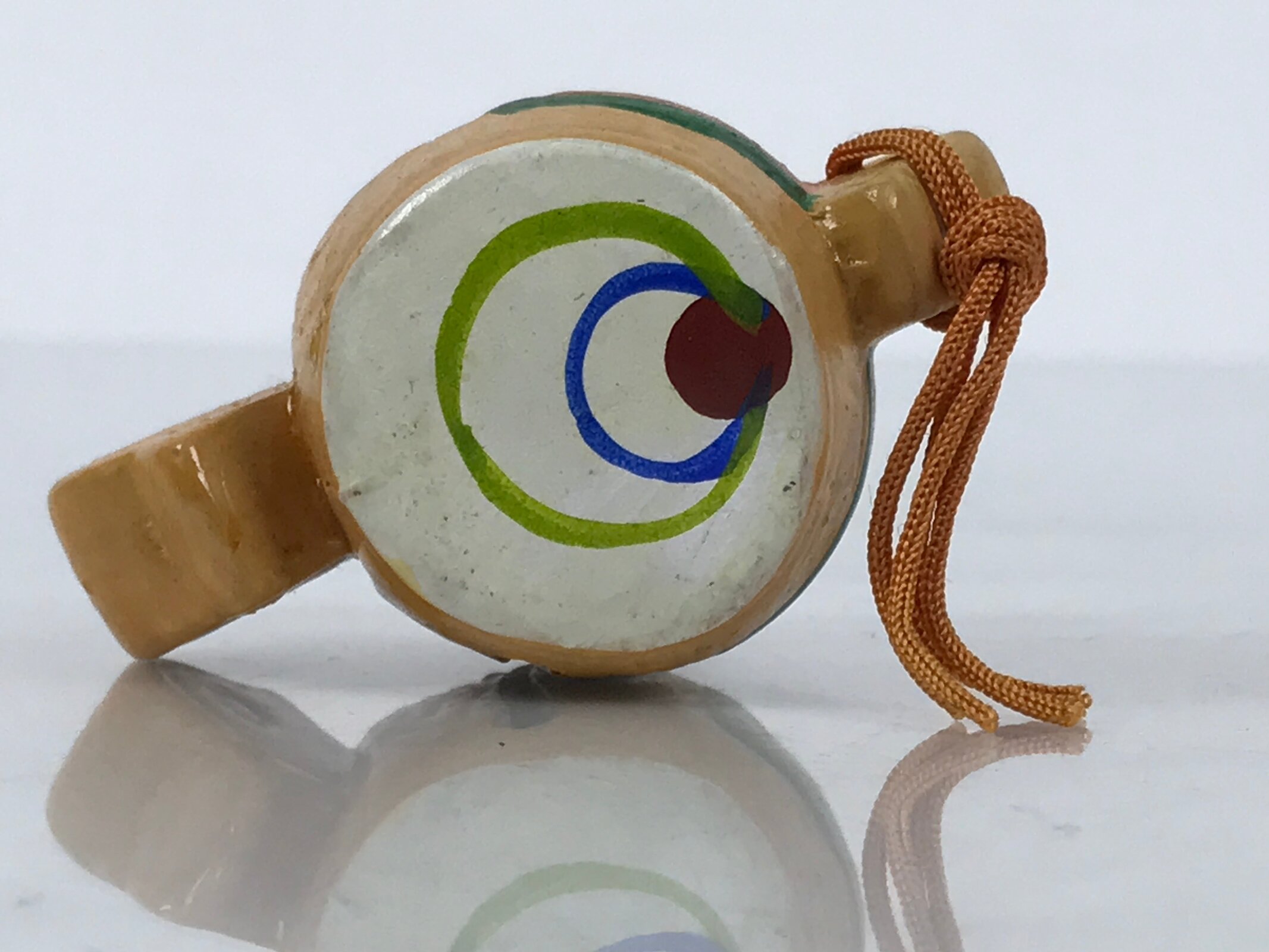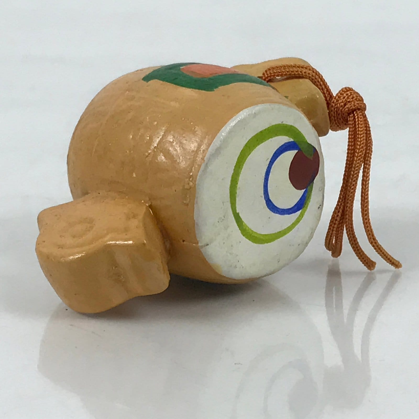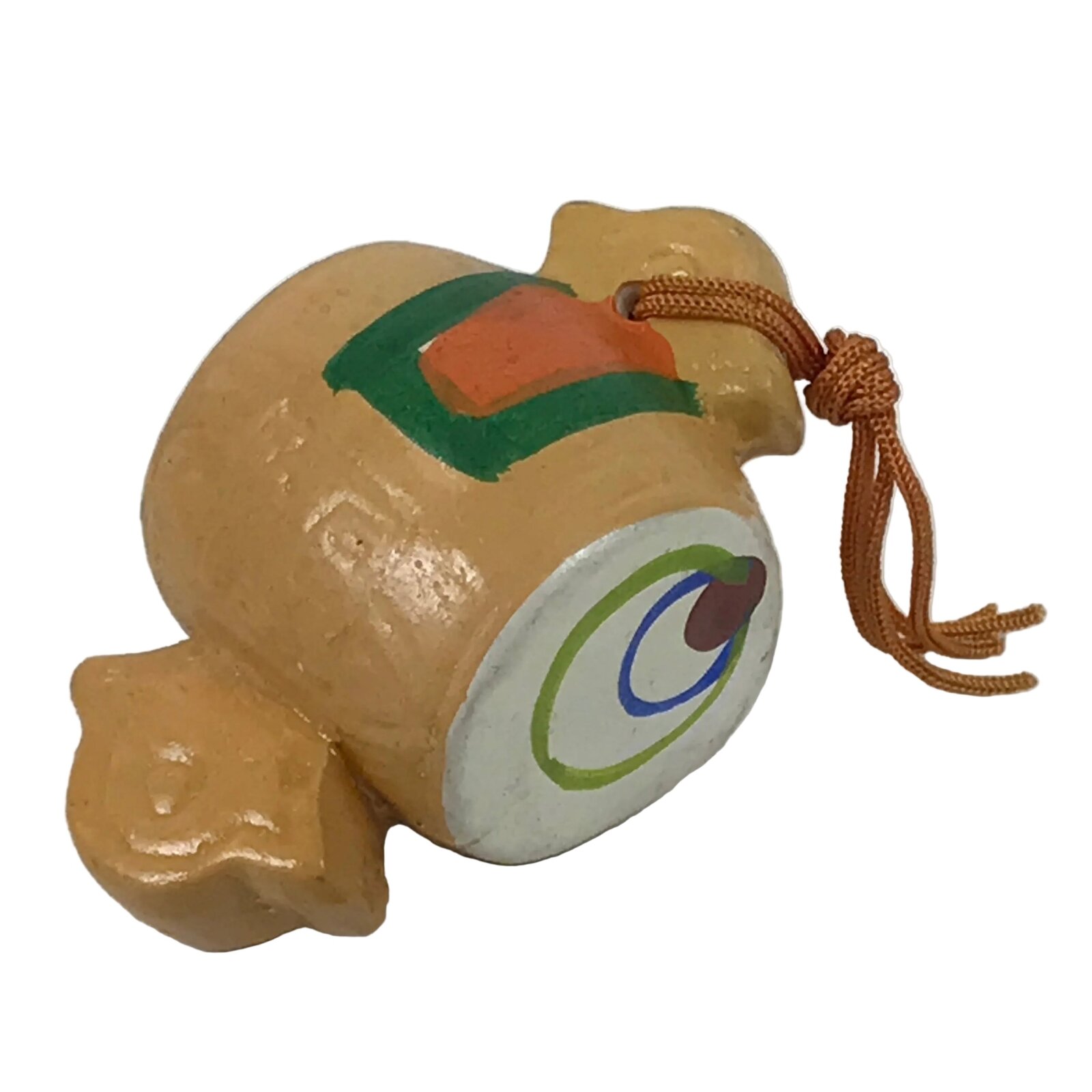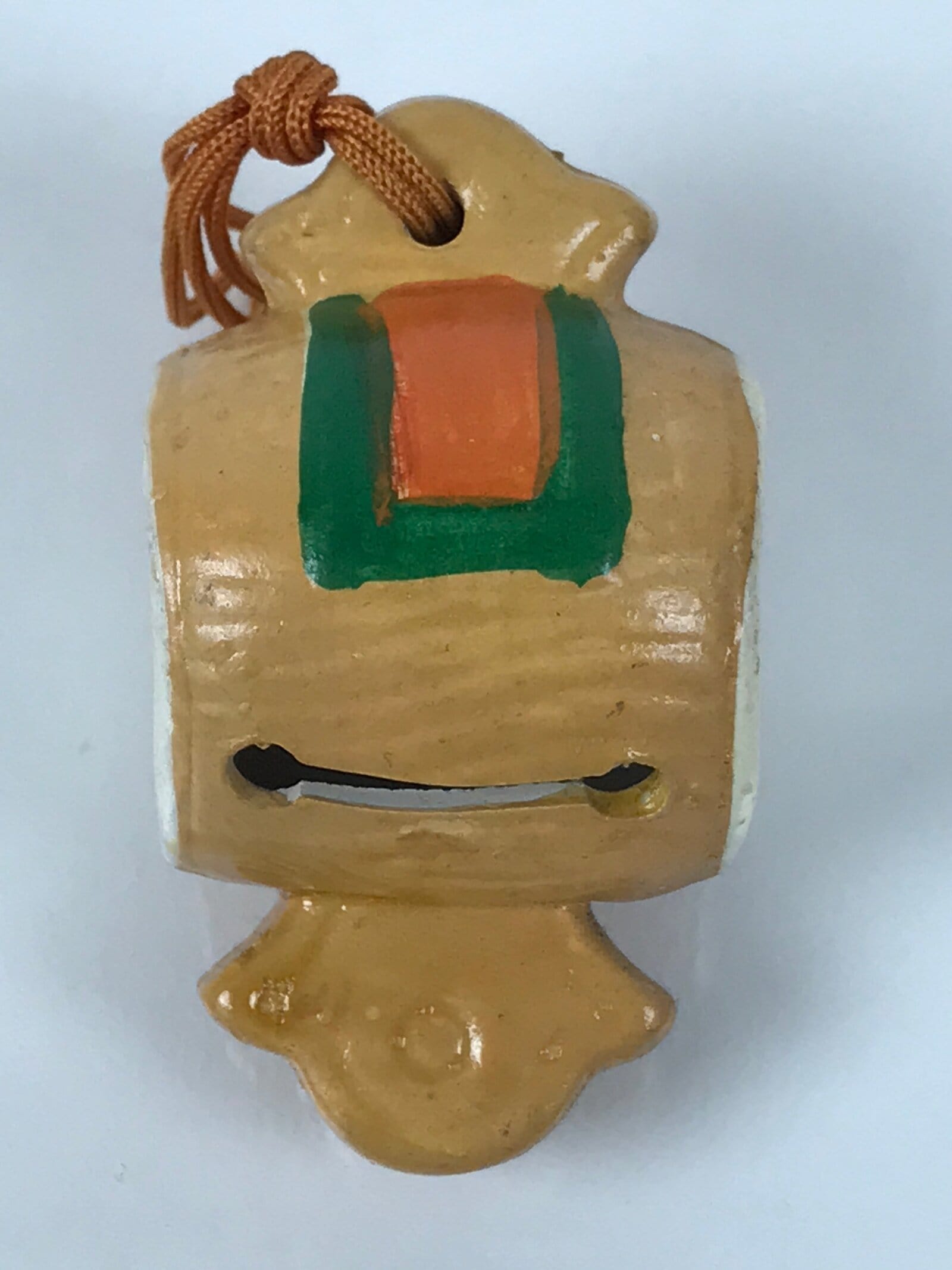 This is a vintage Japanese clay bell, Dorei or Tsuchi-Suzu, in the shape of the famous lucky/magic hammer (uchide no kozuchi) wielded by one of the Seven Lucky Gods, Daikokuten. It is said that the hammer can cause anything one desires to appear. It is mostly brown with various colorful painted decorations. There is a small orange tassel at the top end attached via a loop.