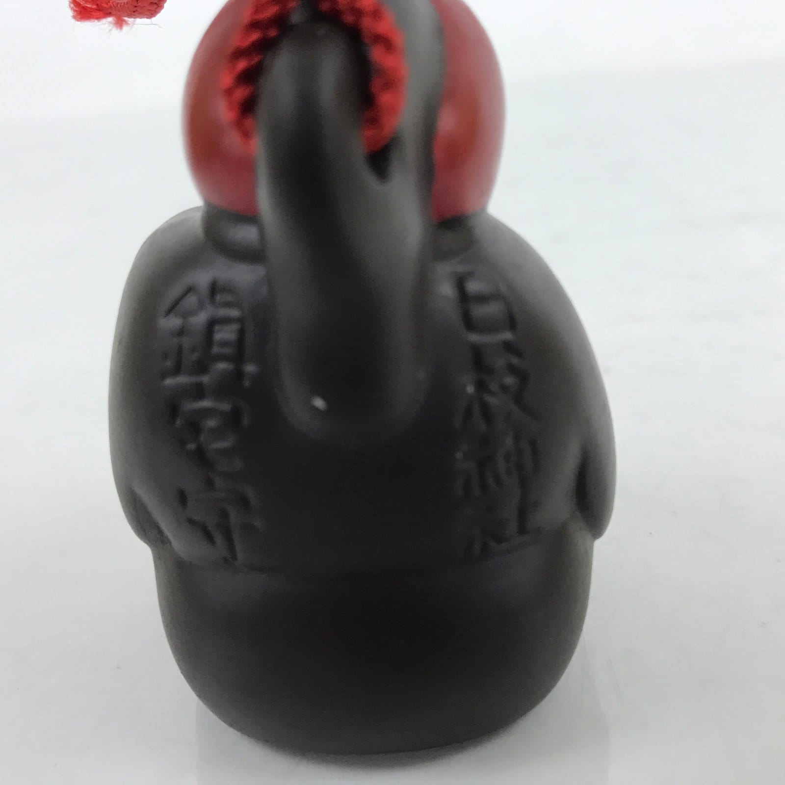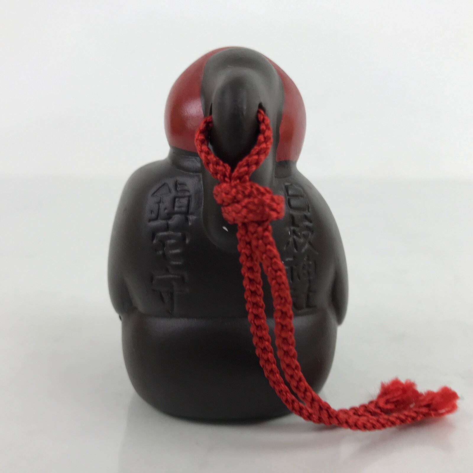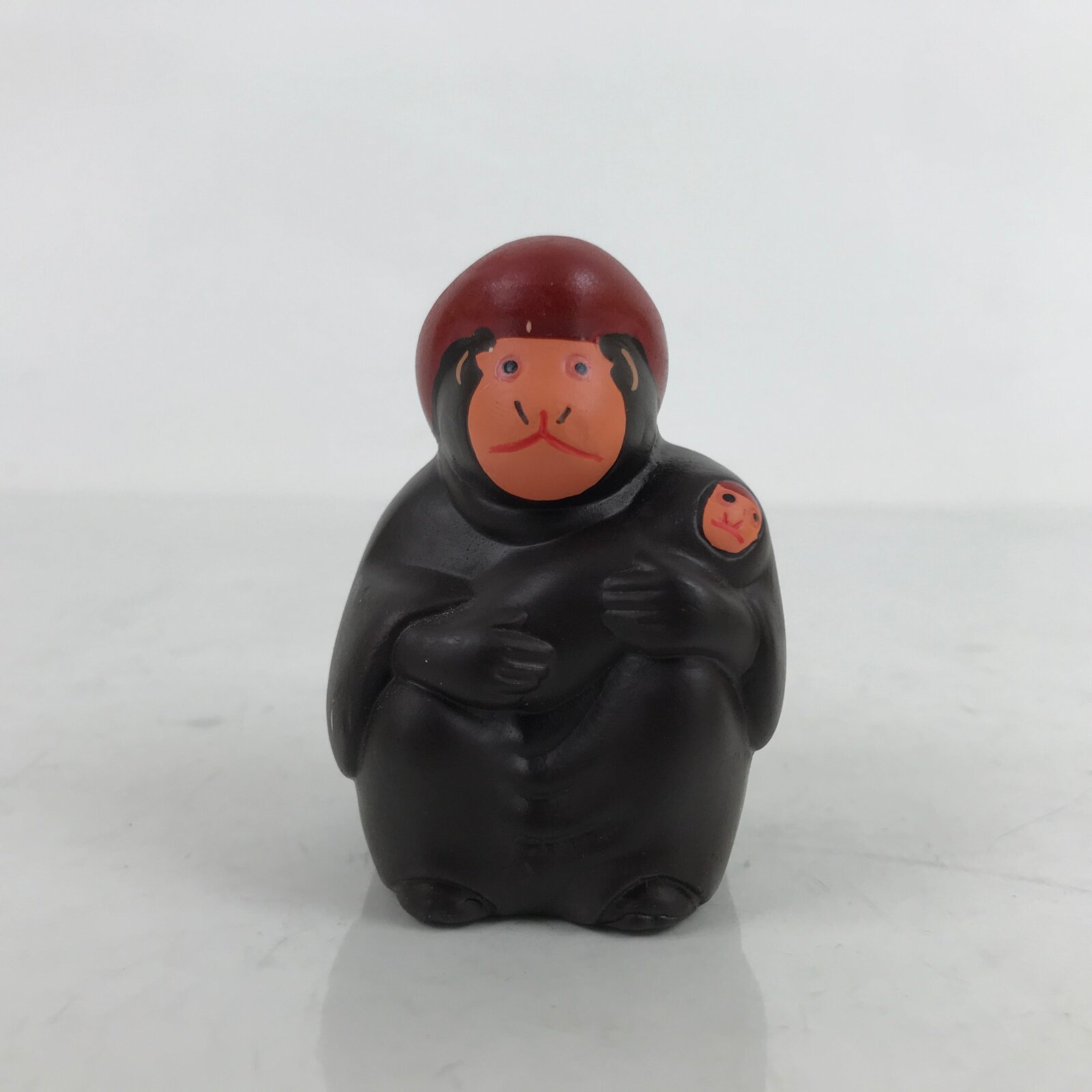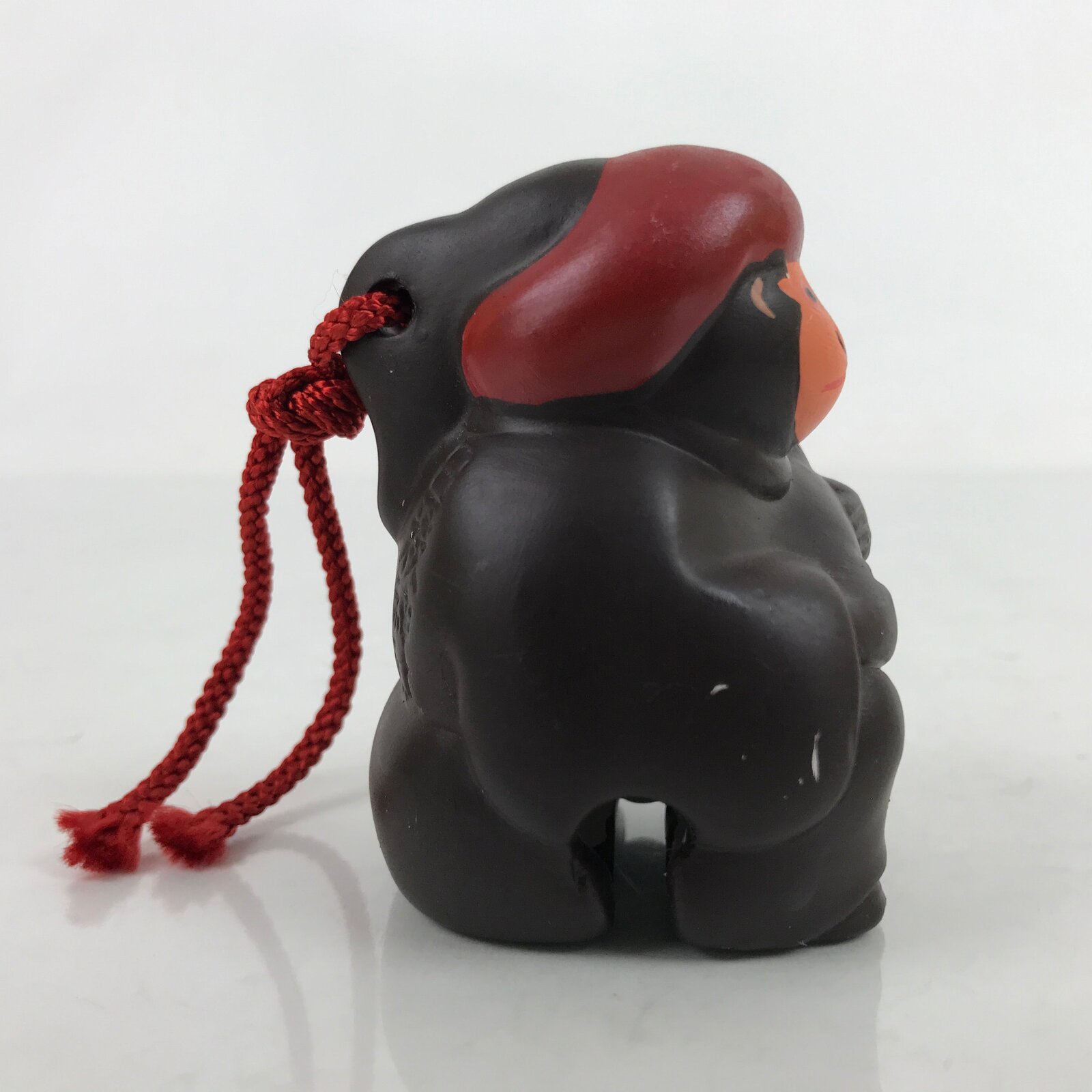 This is a vintage Japanese clay bell, or dorei. It is in the shape of a monkey wearing clothes and holding a baby monkey in its arms. It is dark brown with orange, black, white and red for the face and hat details. It has a white clay ball inside and a braided red string cord tied at the top. According to the inscriptions on the back, this clay bell is an amulet to protect one’s house.