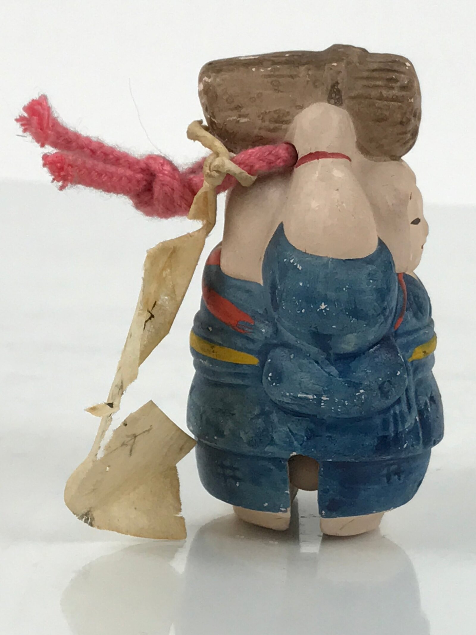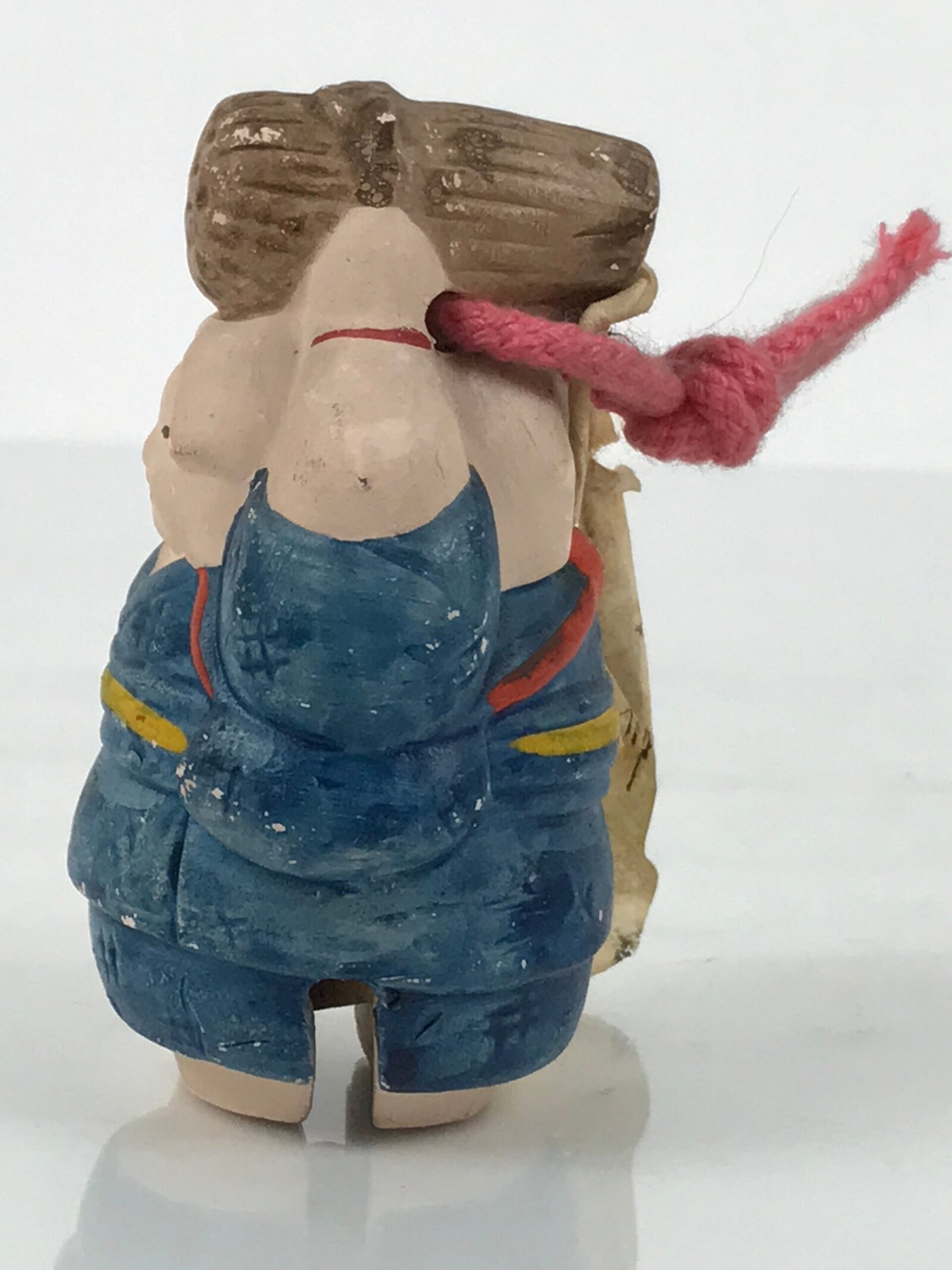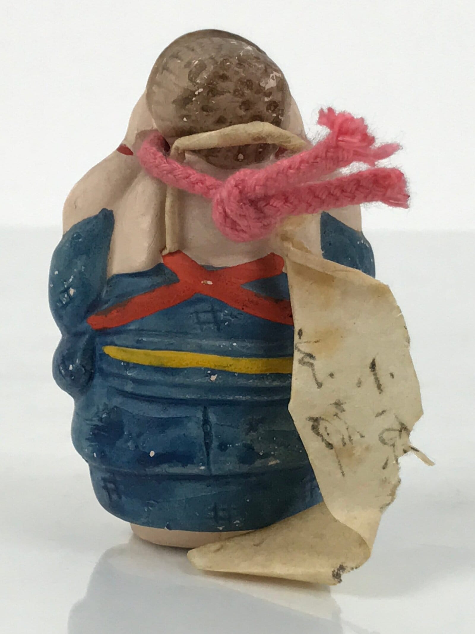 This is a vintage Japanese clay bell, Dorei or Tsuchi-Suzu. It is in the shape of a working woman in Kimono, called Oharame from Kyoto. This particular one is mostly beige and blue. It has a small clay ball inside, a braided pink string attached, and a paper tag at the top.