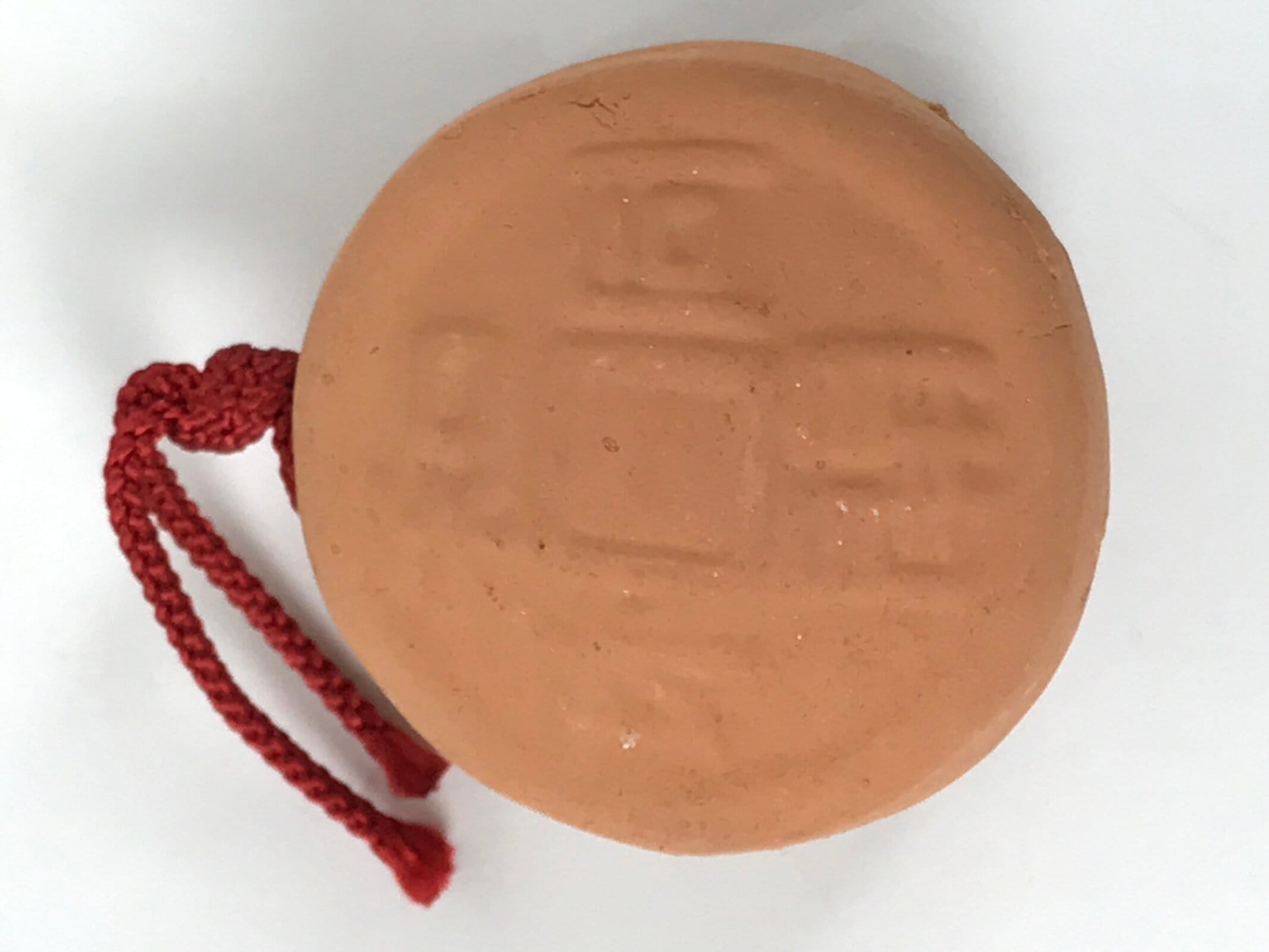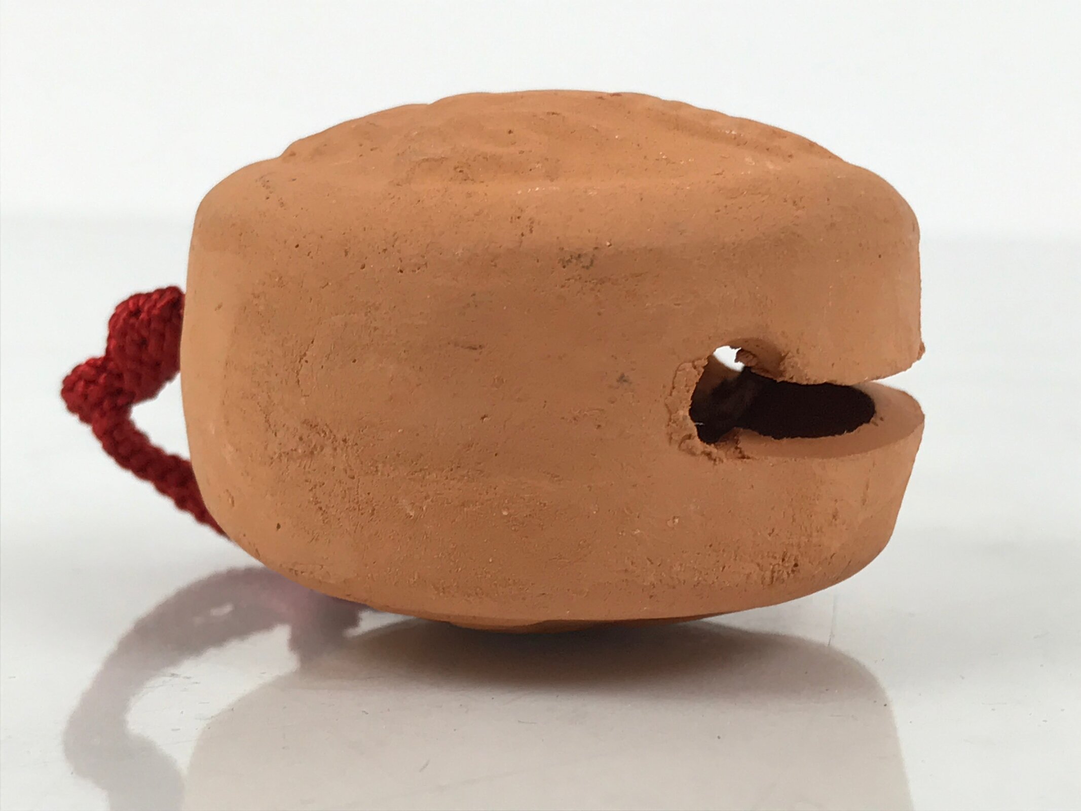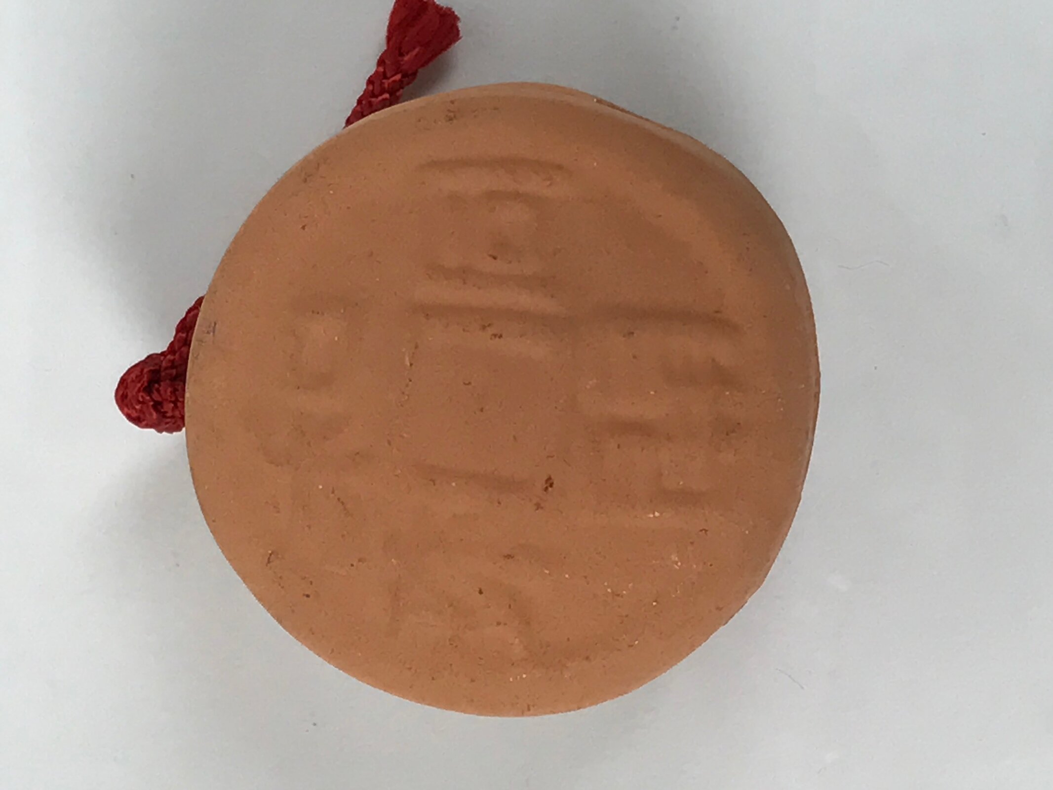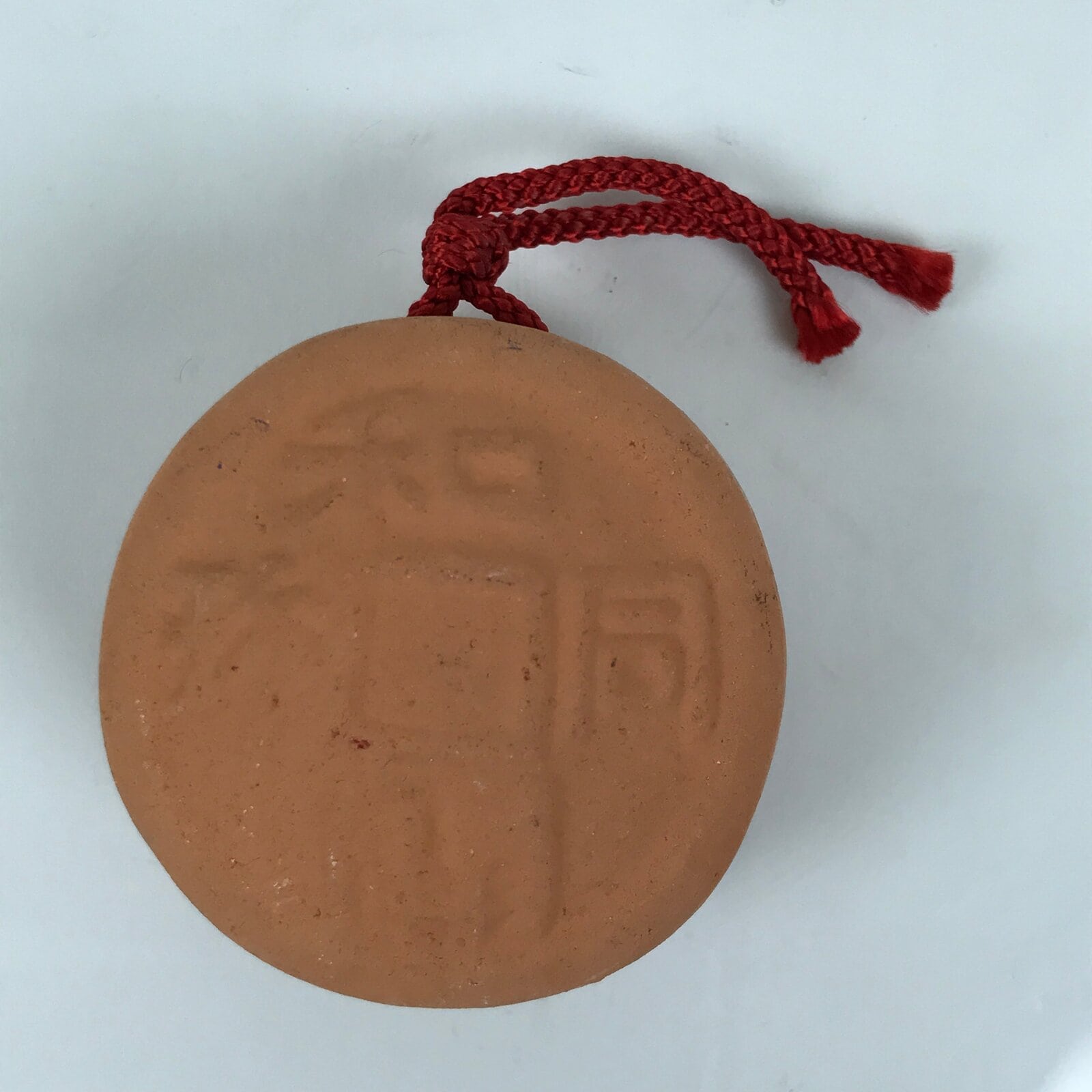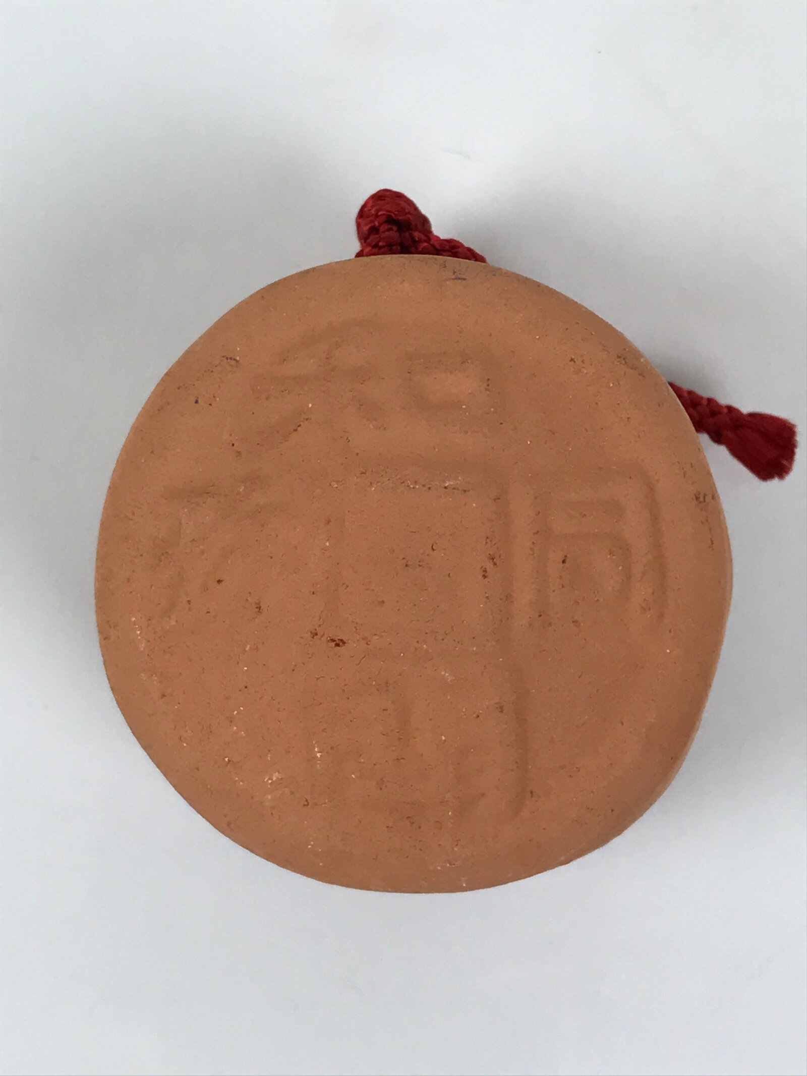 This is a vintage Japanese clay bell, or dorei. It is in the shape of Japan’s oldest official coin currency called wadoukaichin. It is mostly a light brown color with embossed kanji on both sides. It has a small brown clay ball inside and has a red cord tied at the top via two holes. This bell has an unglazed terracotta look to it.