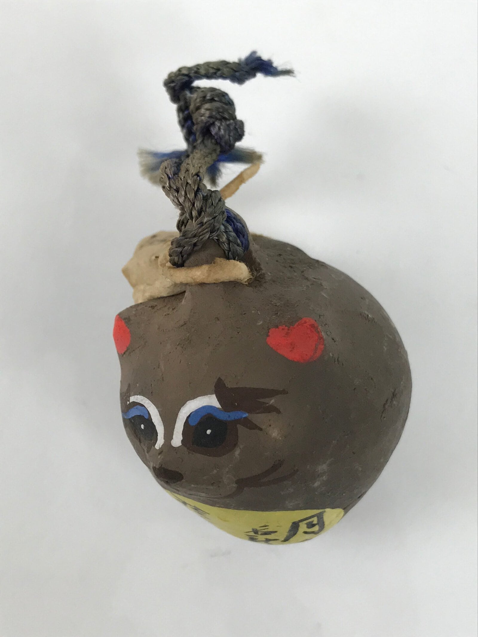 This is a vintage Japanese clay bell, Dorei or Tsuchi-Suzu from Kochi. This dorei is in the shape of a raccoon dog (tanuki) tilting its head. The face and belly are painted, and a Japanese phrase is on the belly. There is a black clay ball inside, as well as a blue string and a paper tag tied at the top.