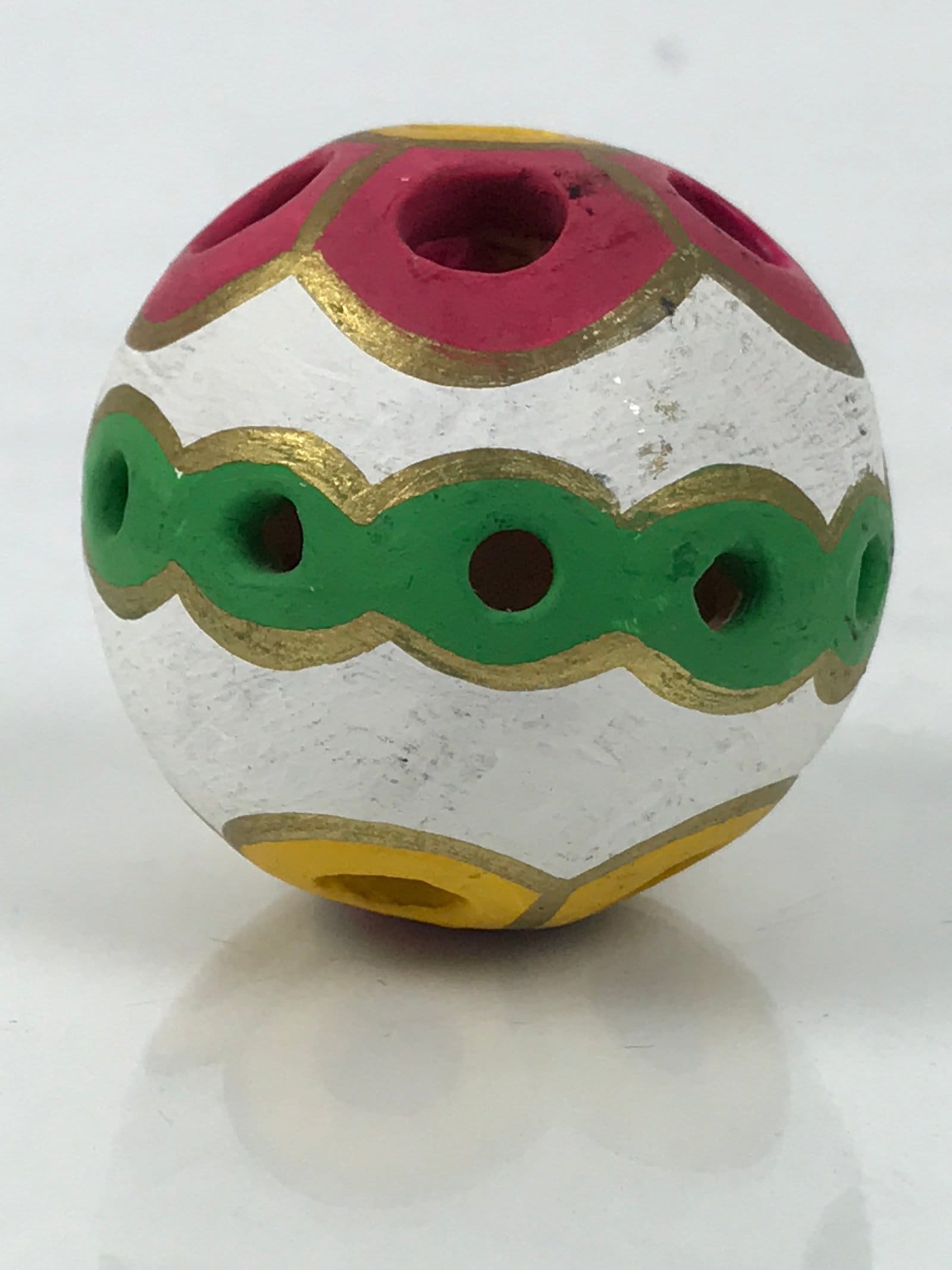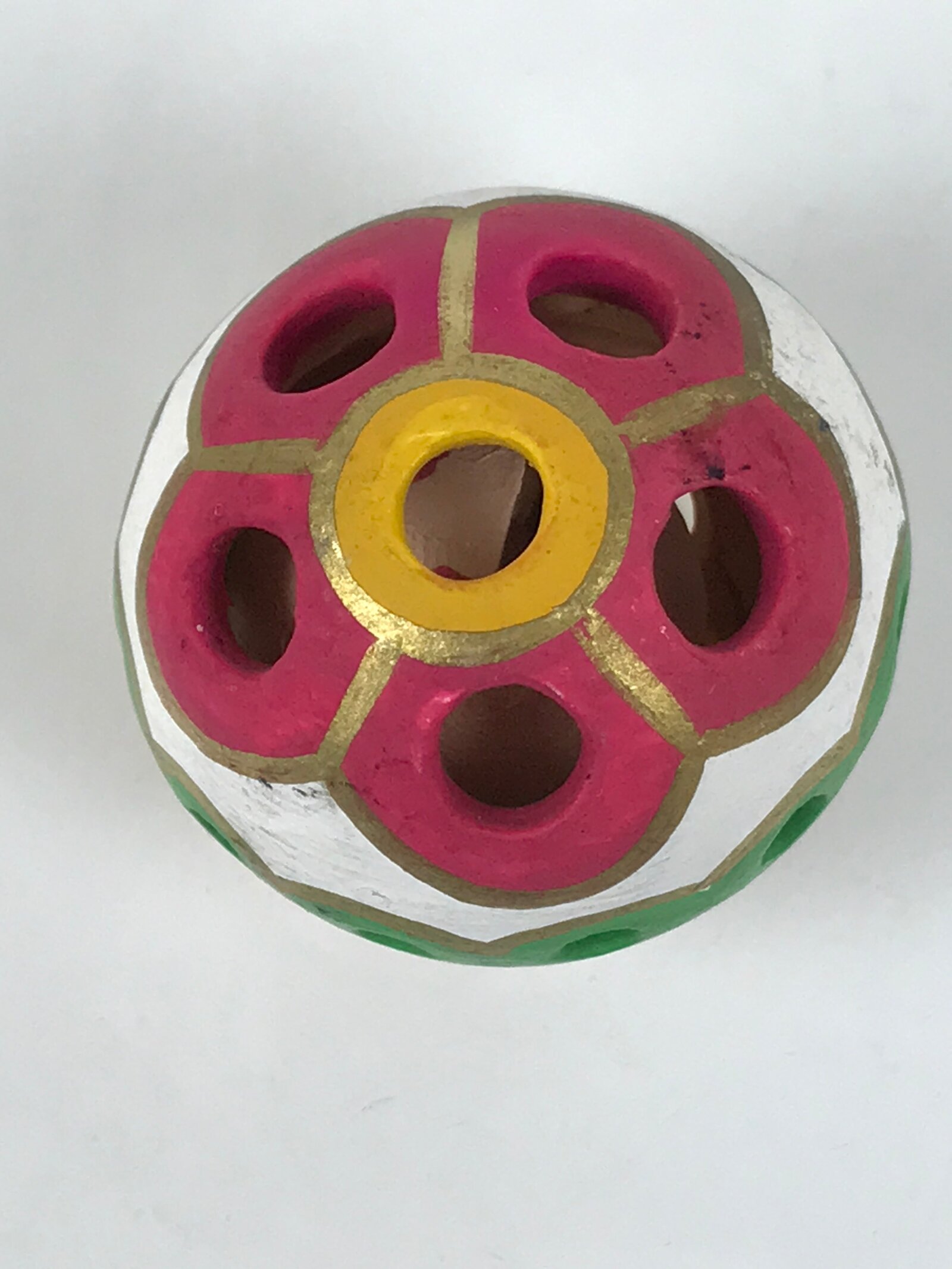 This is a vintage Japanese clay bell, Dorei or Tsuchi-Suzu, in the shape of a colorful temari ball. White, pink, green, and yellow with a floral design, this ball has a smaller classic-shaped dorei bell inside.