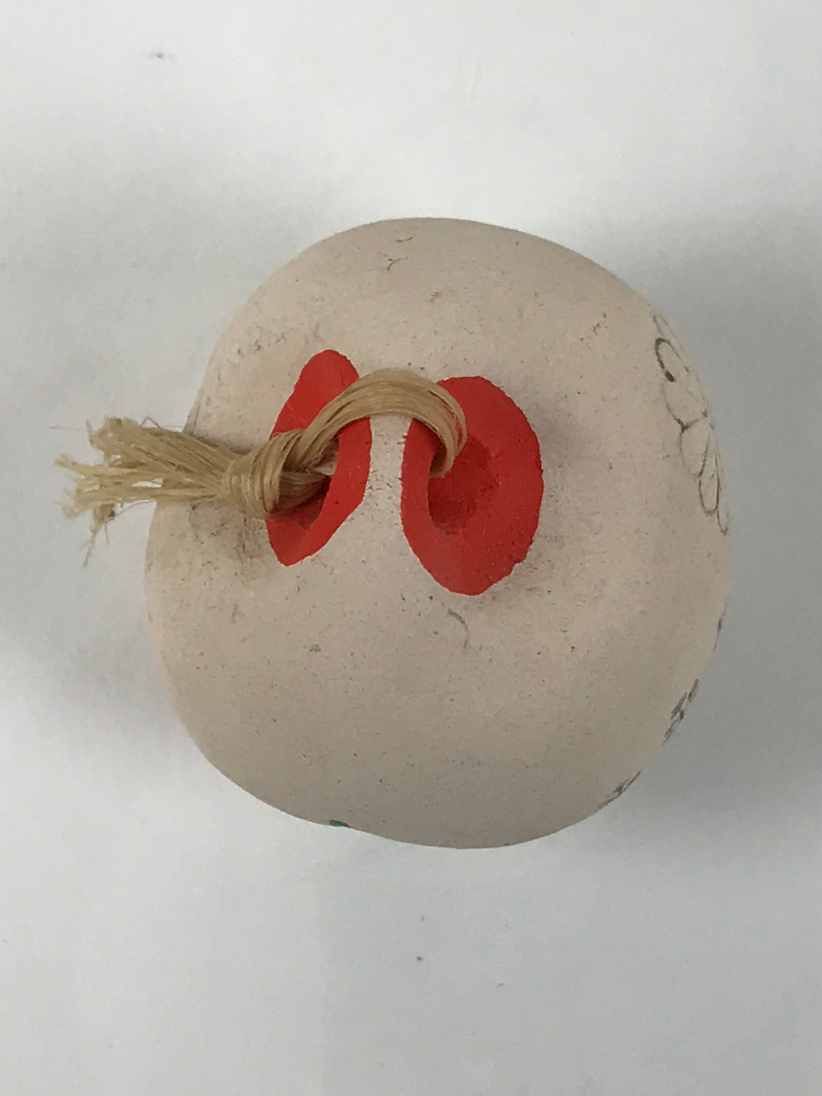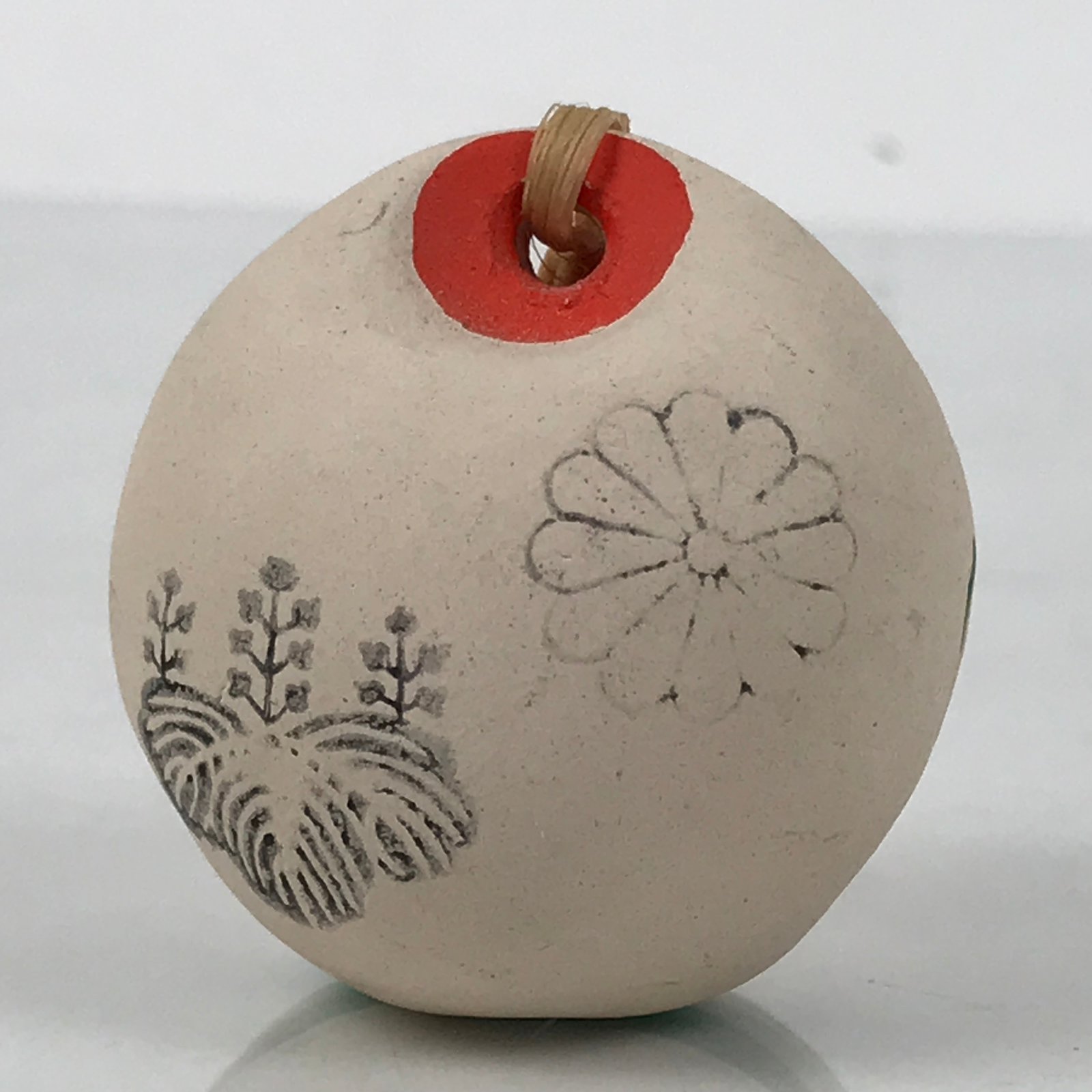 This is a vintage Japanese clay bell, Dorei or Tsuchi-Suzu, in a classic rounded shape. It is white with red and orange accents. On one side are stamped images of a paulownia flower and chrysanthemum, both important symbols of Japan. The other side has kanji writing that says “Koudaiji Temple”. There is a twine string tied at the top via a loop.