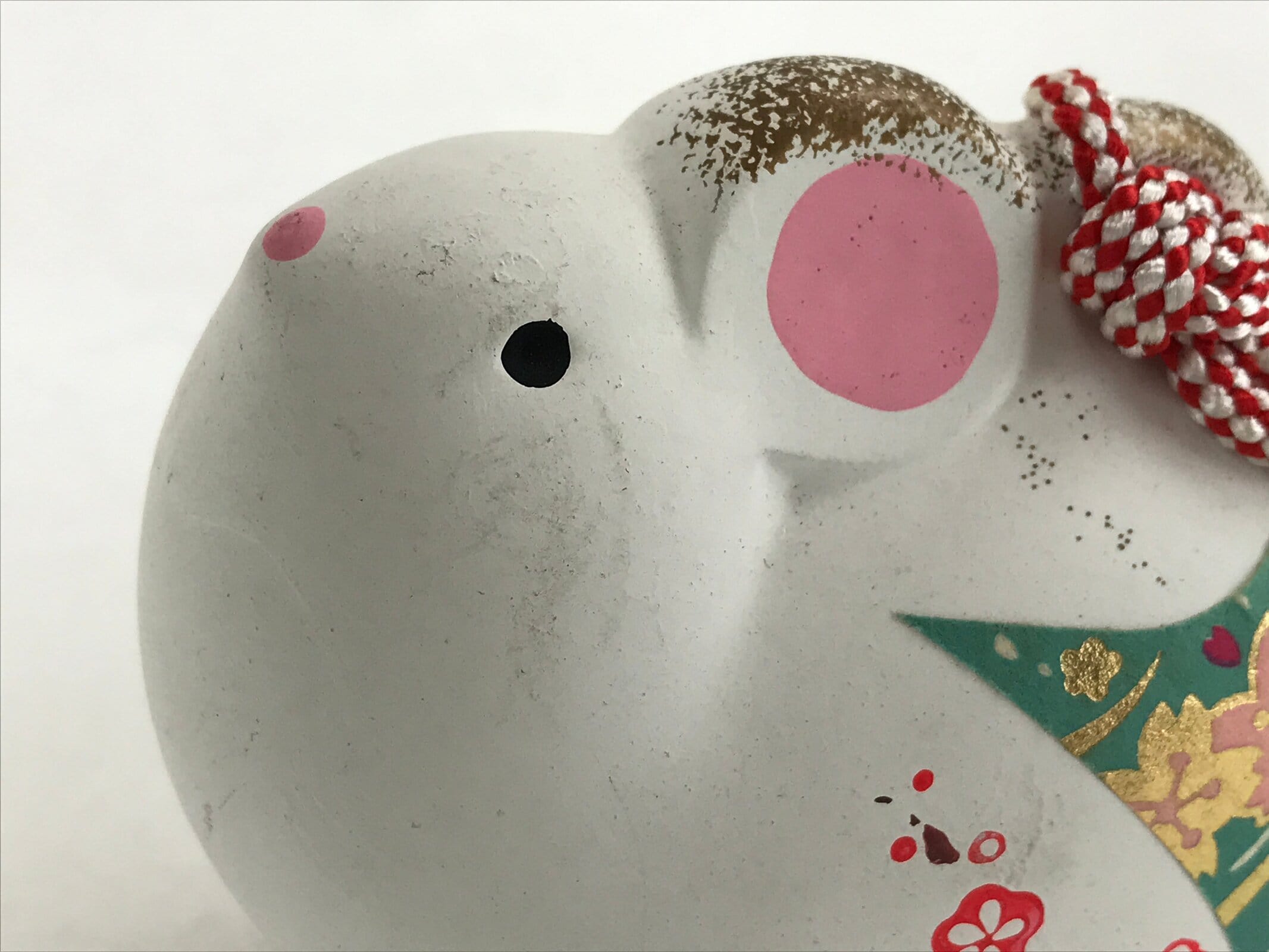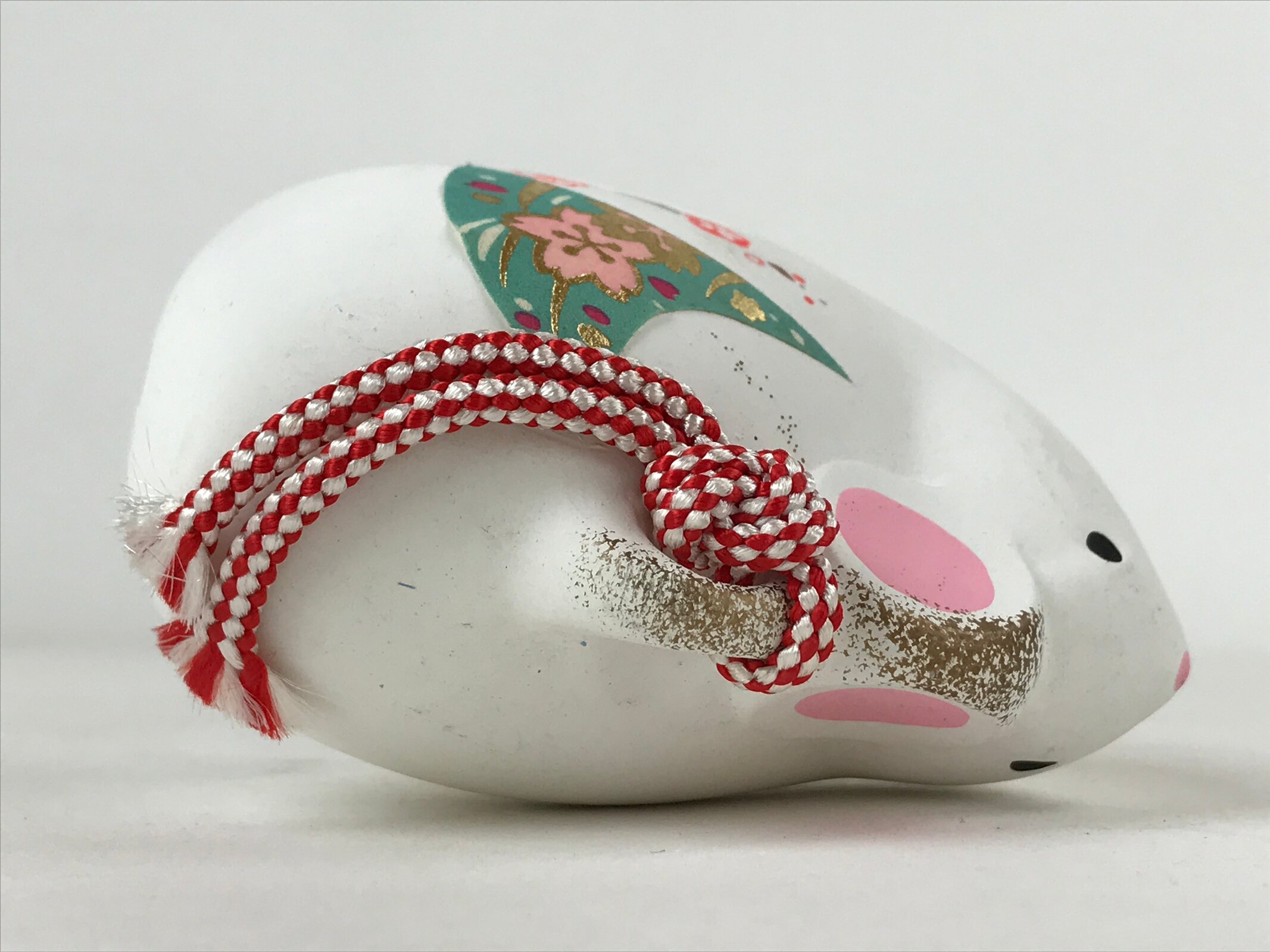 This is a vintage Japanese clay bell, or dorei. Representing the animals of the zodiac, this bell in is the shape of a mouse. It is white with gold, pink, and red accents as well as a paper sticker with cherry blossoms on one side. It has a small white clay ball inside and a braided red and white string tied at the top.