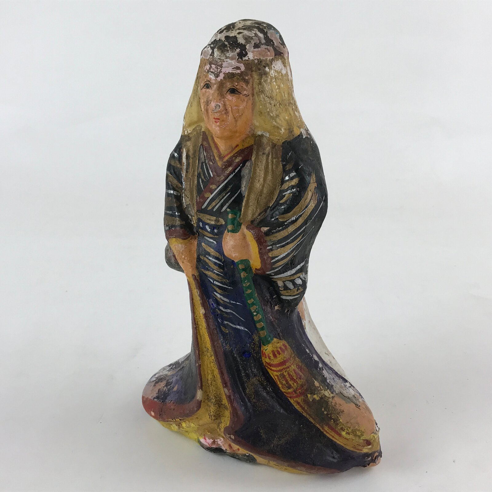 This is a vintage Japanese clay doll Tsuchi-Ningyo. This is one of the two Takasago dolls, an old woman with a broom. It is a lucky charm of longevity and marital harmony. Clay dolls are local traditional crafts that have been made nationwide since the Edo period. Lucky charms such as warding off sickness and disasters, bringing good luck, bountiful harvests, and prosperous business. There are many kinds, such as Girl’s Day dolls, Boy’s Day dolls, Samurai warriors, geisha, princesses, etc…