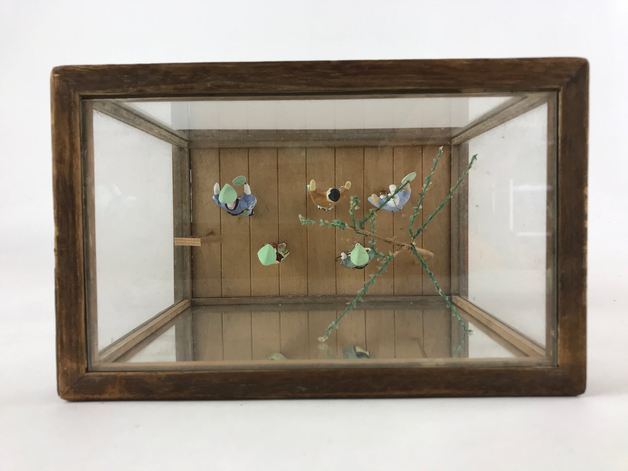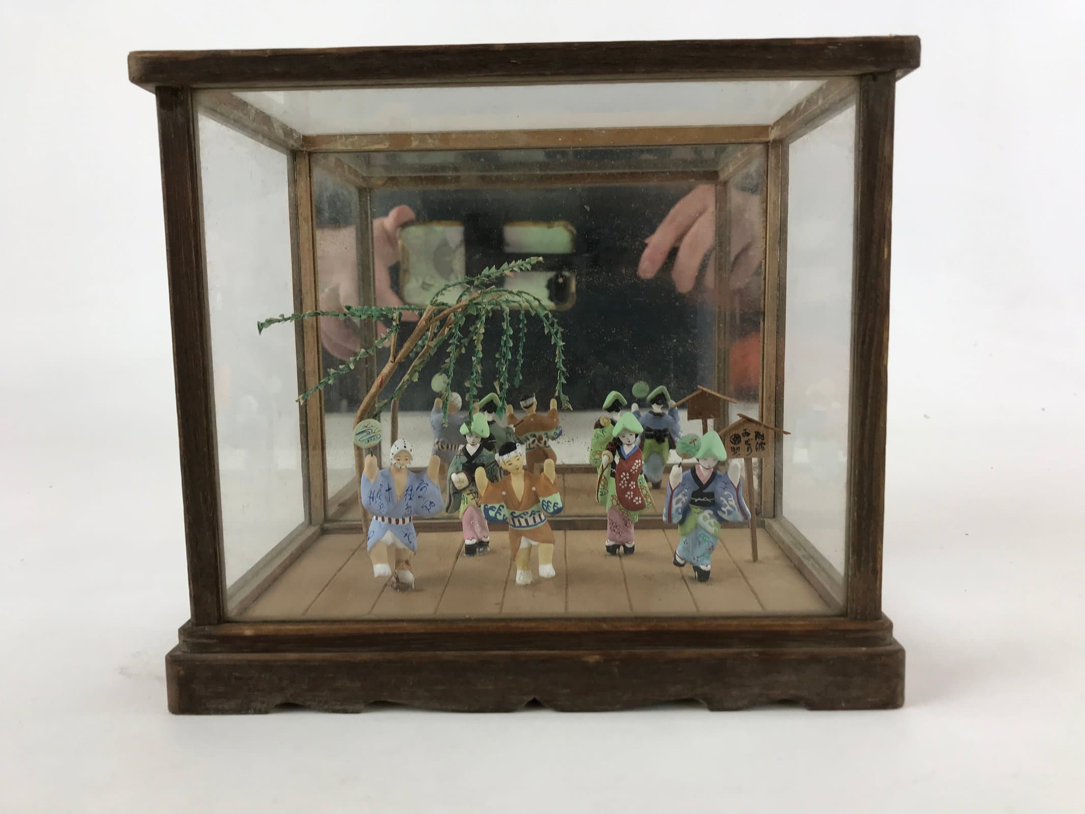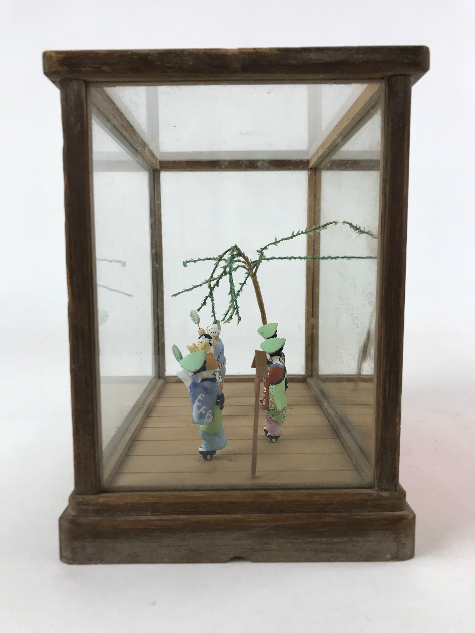 Housed in a glass display case with a wooden frame, this piece depicts the famous Awa Odori dance from Tokushima Prefecture. Each traditionally dressed, colorful figurine is crafted from clay and secured to the wood base by metal wire. The box frame lifts off of the base for easy access inside.