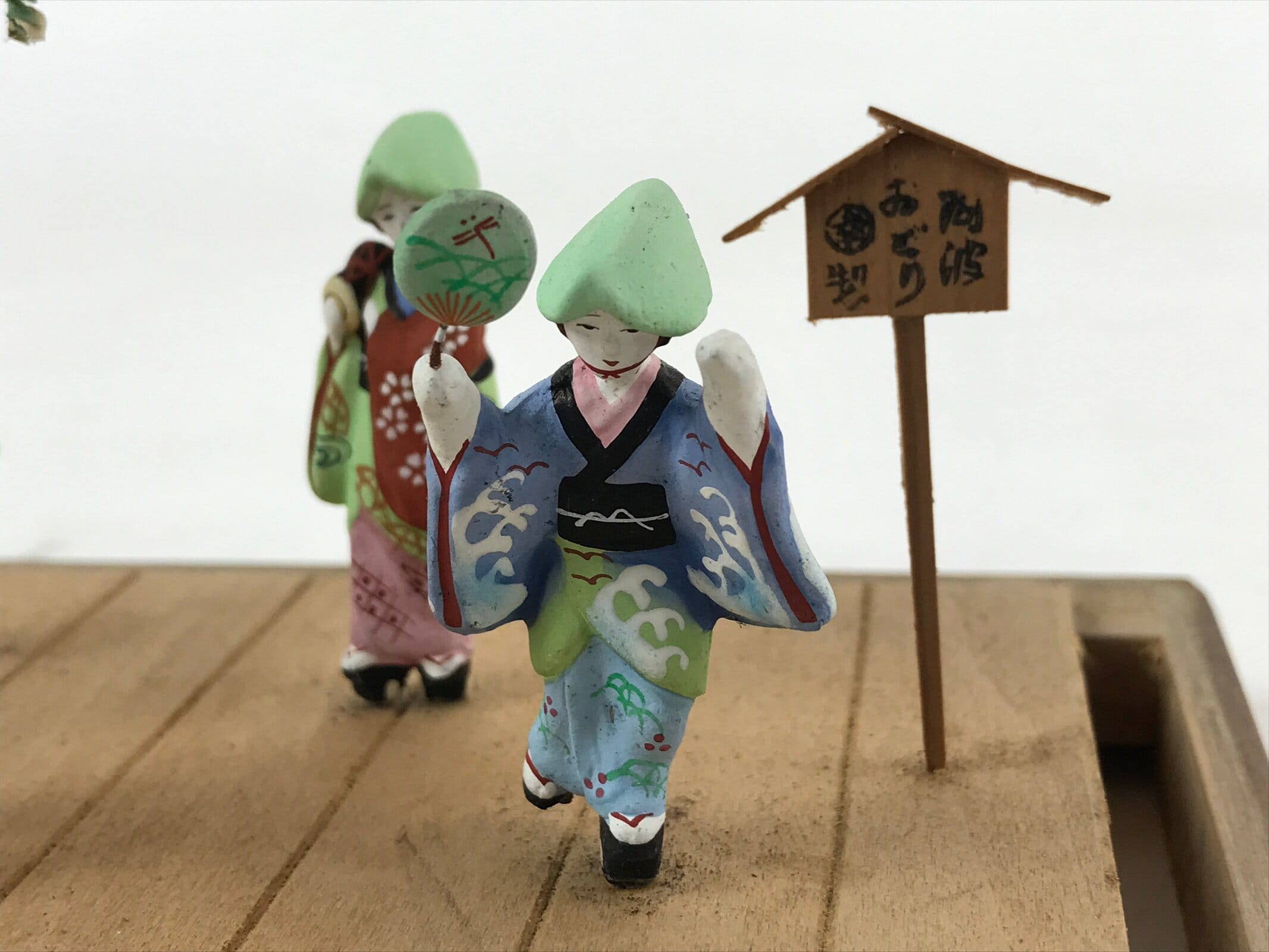 - Good condition considering age. Legs of male dancers have visible glue repair. Little wooden sign edge is loose and may break off. Marks, discoloration. Wear and tear due to age. Please see the photos.