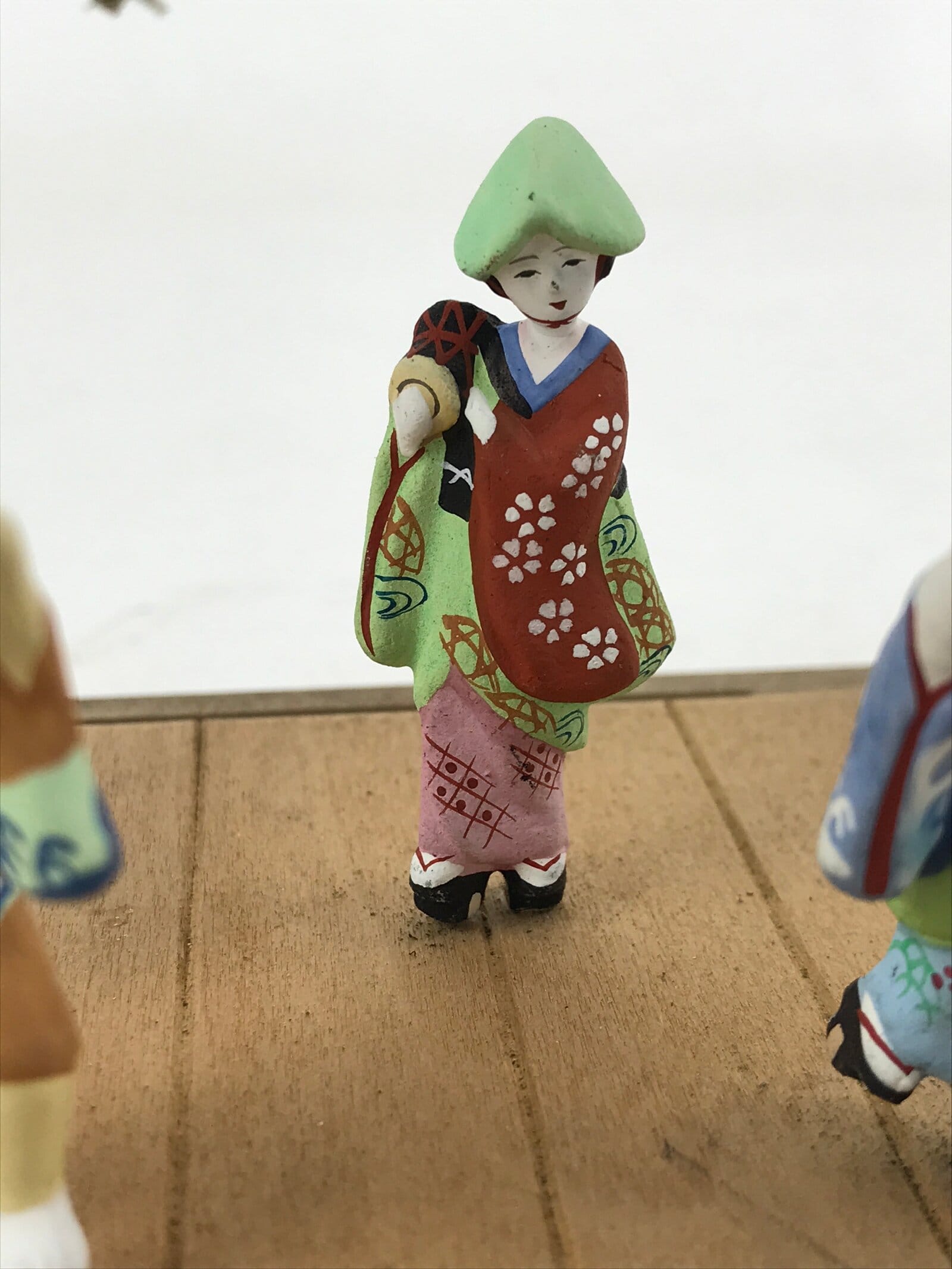 Vintage Japanese Clay Figurines In Glass Case