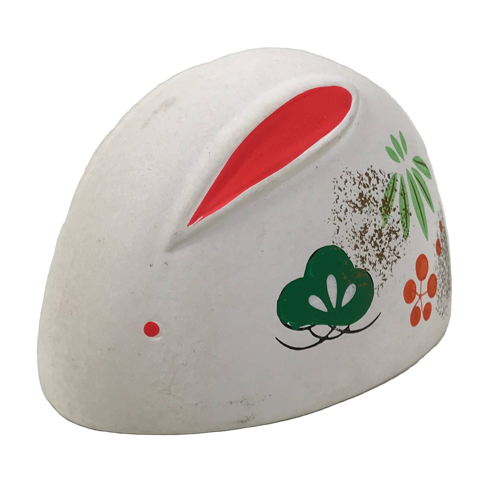 This is a vintage Japanese clay figurine of a rabbit. It is lightweight and is painted a matte white color. There is a painted shochikubai design (pine, bamboo, plum blossom) on one side with gold accents and pink ears. It has a felt pad on the bottom to protect surfaces.