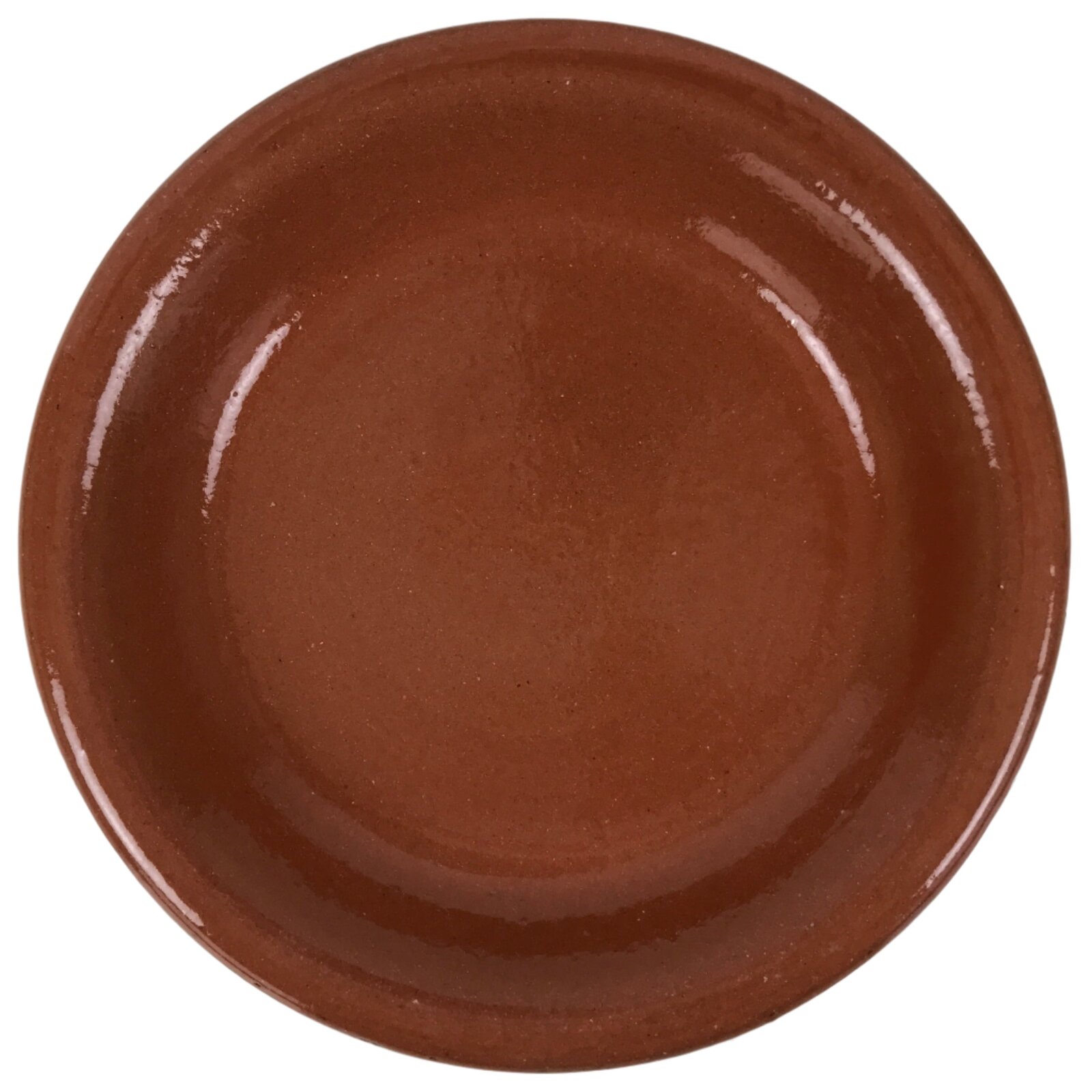 This is a vintage Japanese terracotta plate. It is a medium size with lifted edges so it can double as a pasta or salad plate. It is made of red clay and has a clear glaze over the front side with an unglazed bottom.