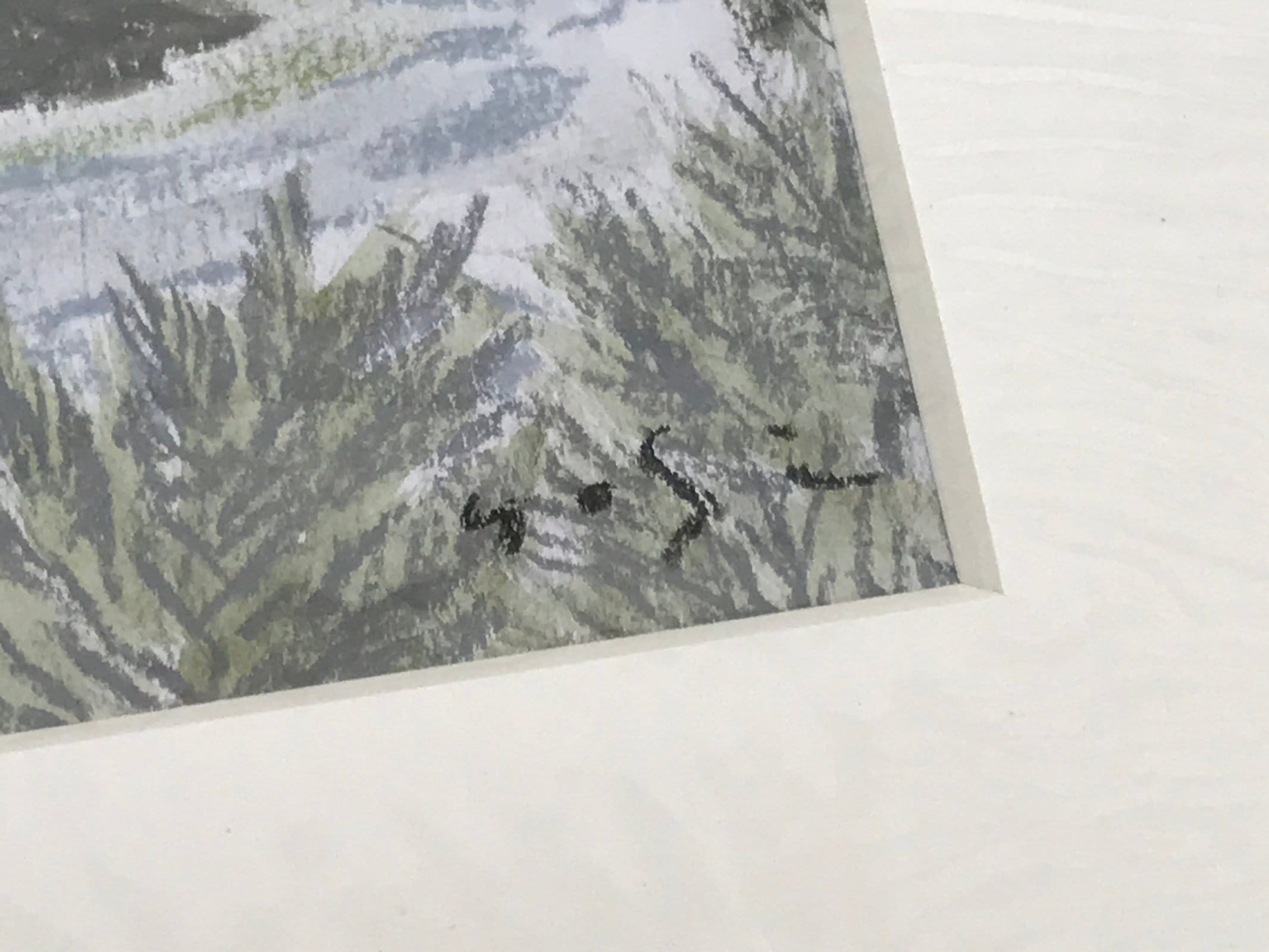 This original pastel drawing on cardstock paper features the rocky Japanese coastline during sunset. Pastel is a gorgeous, often overlooked, art medium that blends colors together beautifully and this piece is no exception. It is adhered to a plain white matboard, ready for easy framing and is stored in a plastic sleeve. This work is signed by the Japanese artist Yoshihiro Hagino.